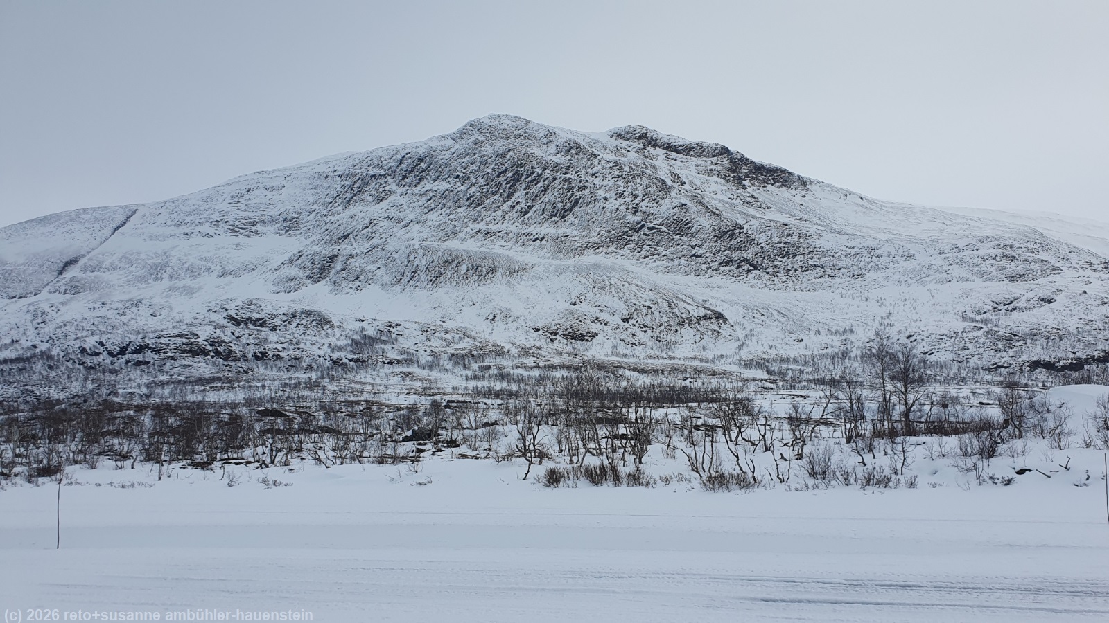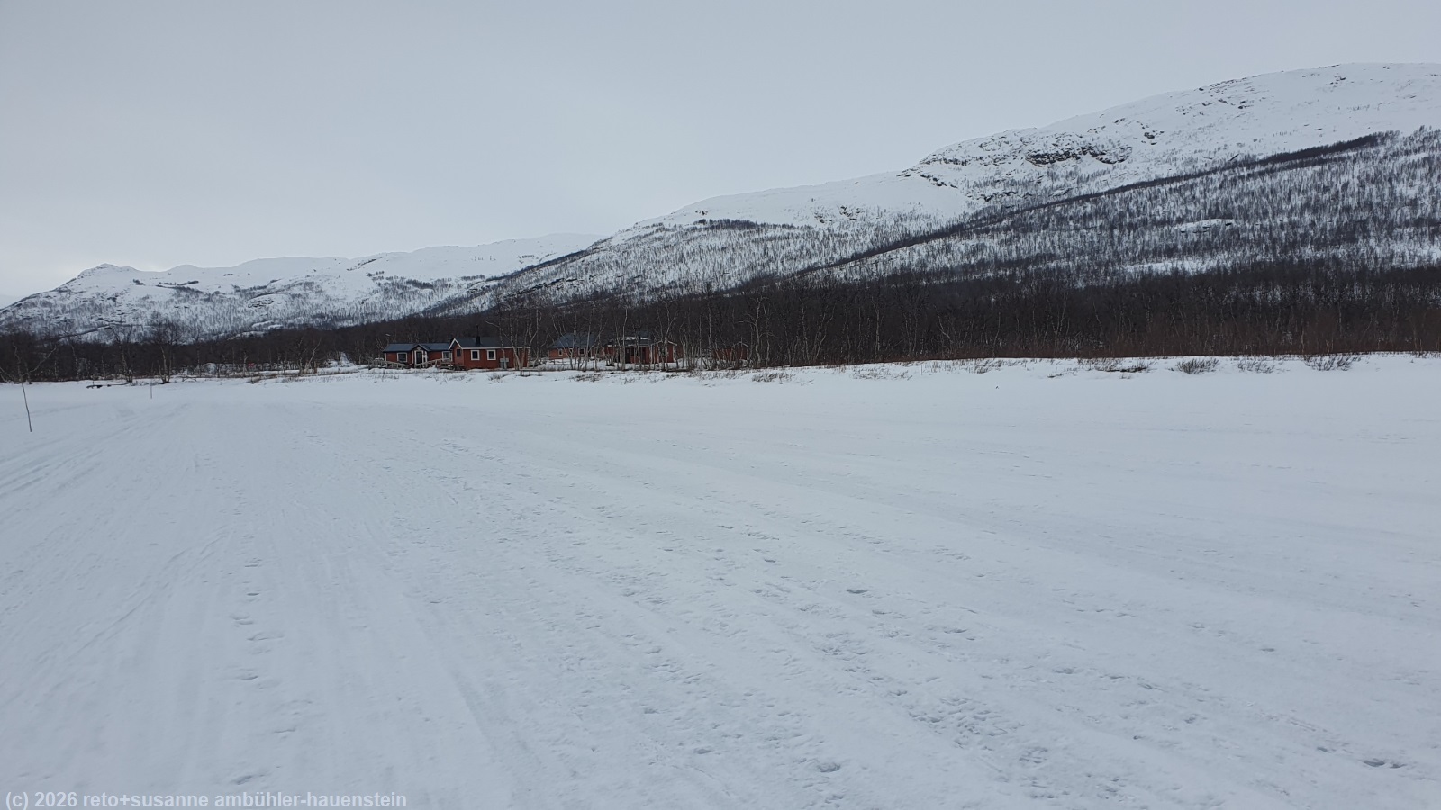 wir essen unsere brote. es ist viel weniger kalt als vor vier jahren, als wir auf dem see zu mittag gegessen hatten, siehe tagebuch vom 22-feb-2022. kurz vor 14 uhr brechen wir wieder auf. nun führt der winterweg längs über den see direkt zur fjällstuga. hier läuft es sich fantastisch. wir können neben der motorschlittenspur unsere eigene spur in den schnee machen. der schnee trägt wunderbar, wir sinken kaum ein und laufen wie auf wolken. trotzdem bietet der schnee genügend halt, so dass wir - nicht wie vorher in der vereisten spur - nicht mehr seitlich wegrutschen. im nu haben wir den see überquert und stehen gegen 14:45 uhr vor der abiskojaurestuga.
