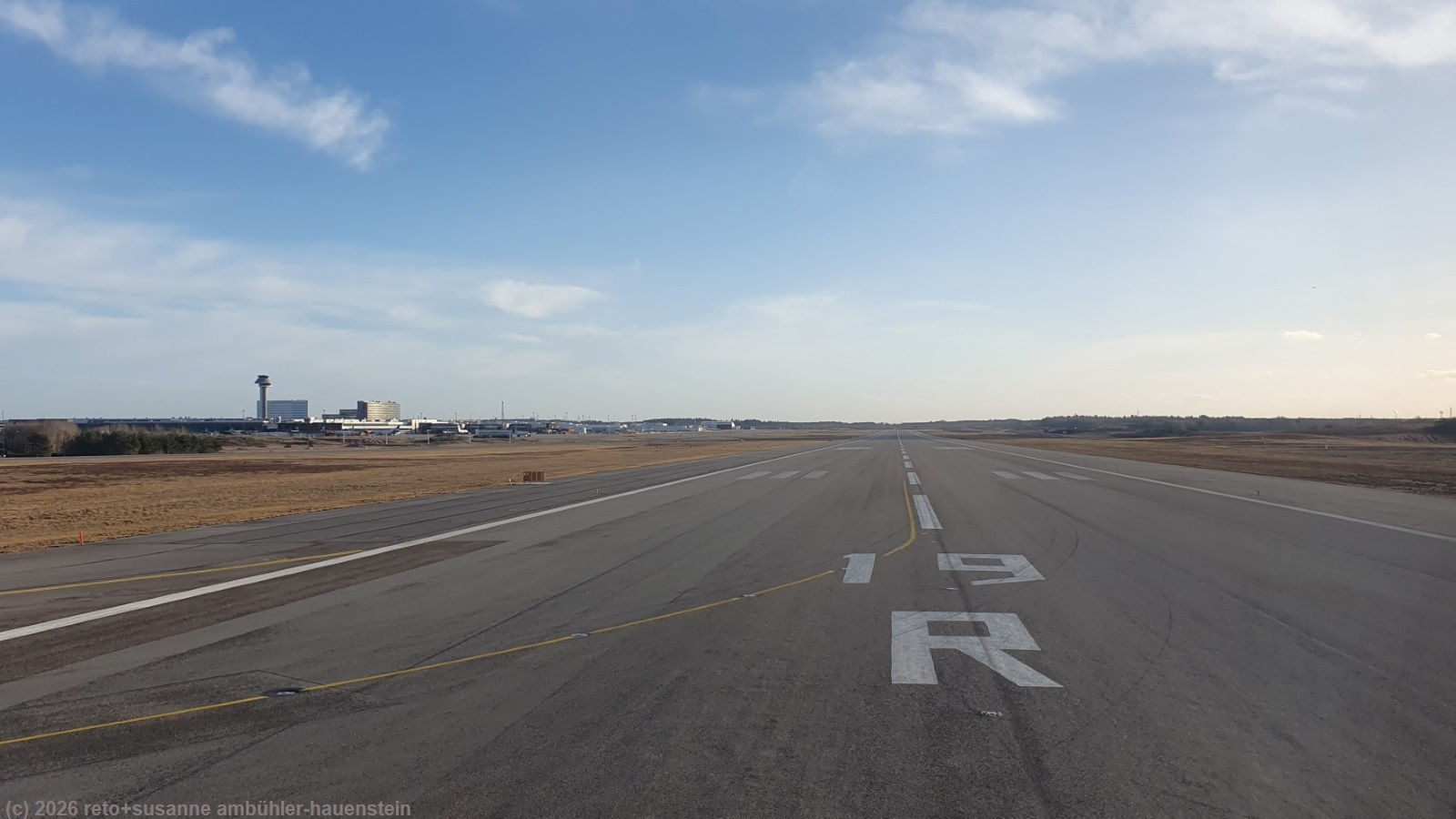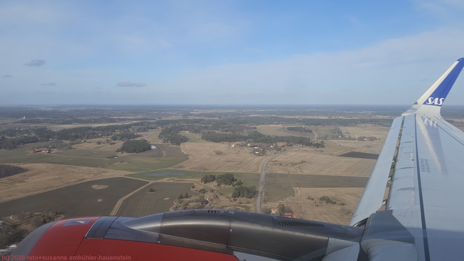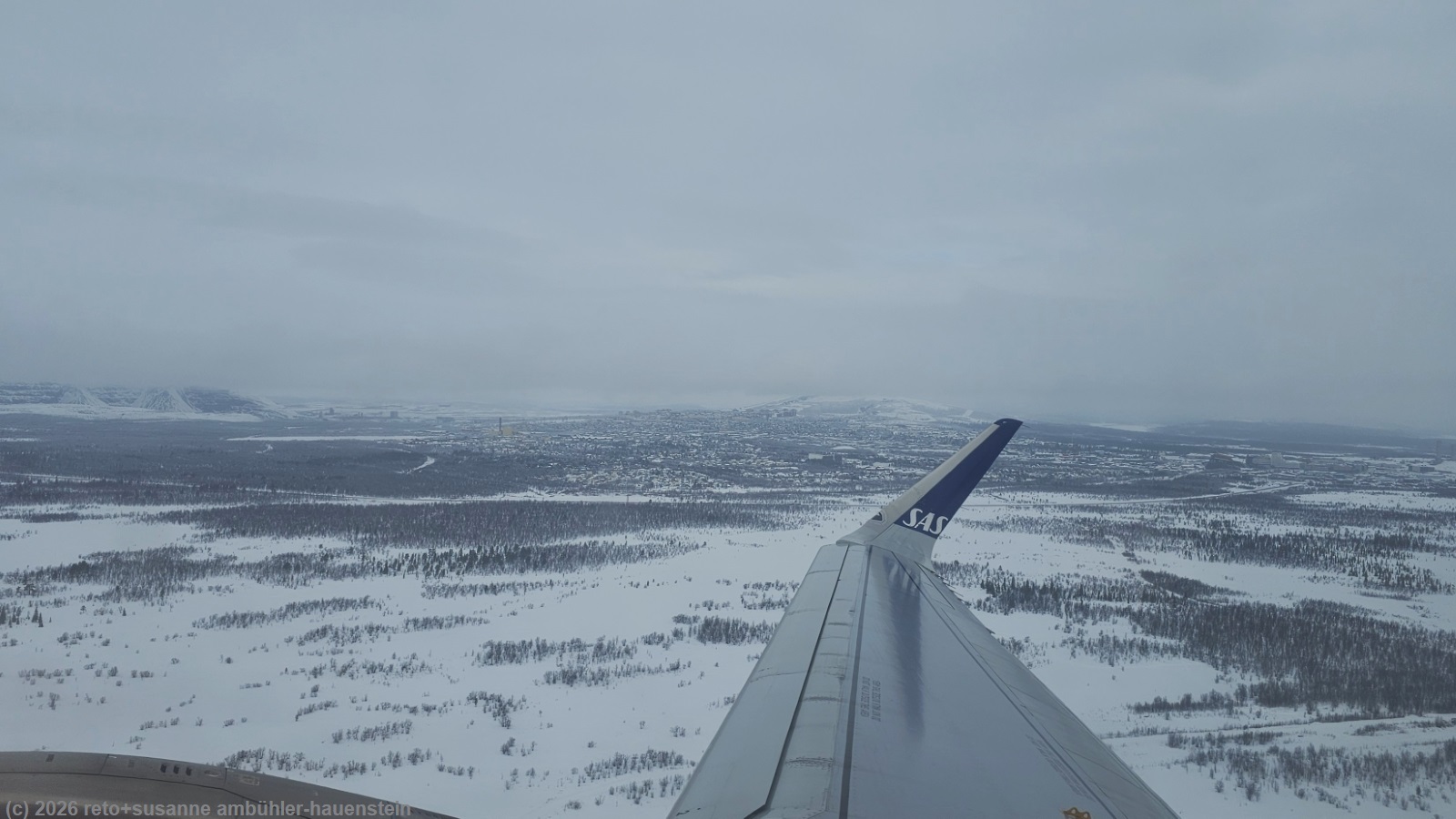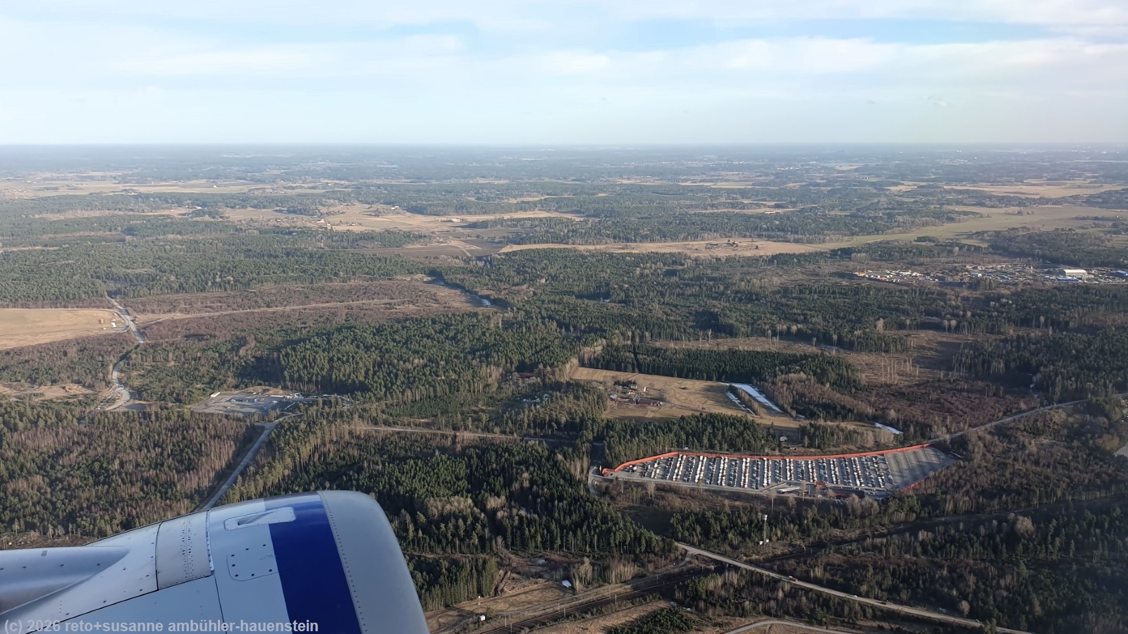 obwohl das gebäude unserer unterkunft aus holz gebaut und ziemlich hellhörig ist, war die nacht sehr ruhig. trotzdem erwache ich lange bevor der alarm unseres handys losgeht. wir stehen um 7 uhr auf und packen unsere rucksäcke. danach begeben wir uns ins restaurant und geniessen das reichhaltige frühstücksbuffet. nach dem essen setzen wir uns noch einen kurzen moment in den aufenthaltsraum, dann marschieren wir zur bushaltestelle "ok parken". mit fünf minuten verspätung kommt der bus, der uns zum flughafen bringt. er schlägt einige haken und fährt auch am neuen stadtzentrum vorbei. wir sehen die mächtige, 672 tonnen schwere kirche, die letzten sommer mit viel aufwand aber unbeschädigt 4.7 km verschoben wurde, siehe livestream. kurz vor 09:30 uhr sind wir am flughafen. im bus sassen nur wenige passagiere, aber die kleine eingangshalle bei der gepäckaufgabe ist trotzdem voller menschen. wir verpacken unsere beiden grossen rucksäcke in die transportsäcke und erledigen den self check-in. die beiden rucksäcke sind bald aufgegeben. beim sicherheits-check ist bedeutend mehr geduld erforderlich. aber auch den bringen wir ohne probleme hinter uns. es dauert nicht lange, bis wir in den airbus A320 von SAS einsteigen dürfen. als alle passagiere ihre sitzplätze gefunden haben, wird das flugzeug zur enteisungsstation geschoben. als beide tragflächen behandelt sind, rollen wir zur piste und sind mit wenigen minuten verspätung in der luft. es hat schon den ganzen morgen geschneit. bald tauchen wir in die wolkendecke ein. als sich diese auflockert, haben wir eine schöne aussicht auf das winterliche nordschweden. von hier oben sieht die landschaft zauberhaft aus. der flug verläuft äusserst angenehm. als wir uns stockholm nähern, weicht die winterliche langsam einer eher frühlingshaften landschaft. die kleineren gewässer scheinen zwar noch mit einer eisschicht bedeckt zu sein, schnee hat es aber nur noch in schattigen gräben oder an den waldrändern.
