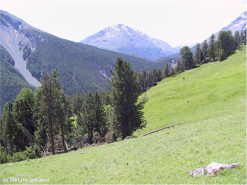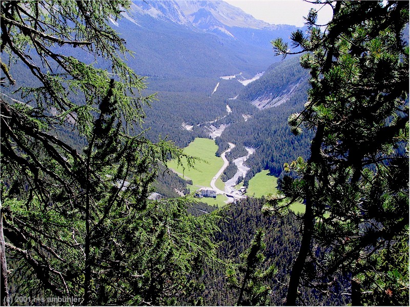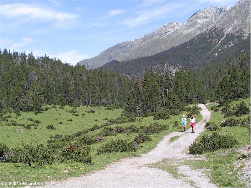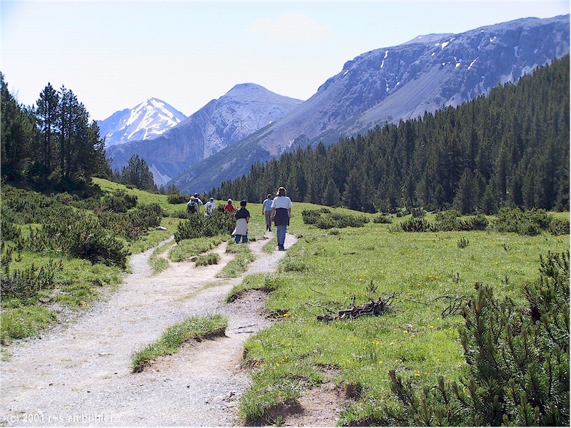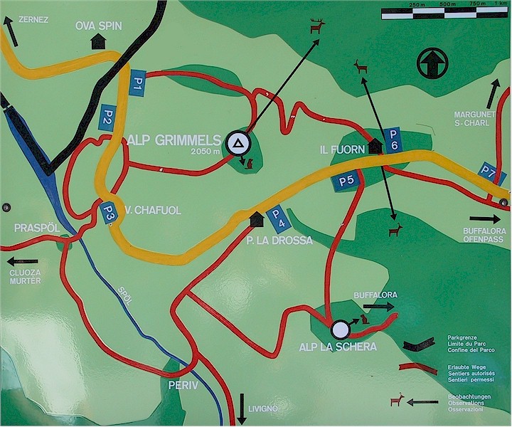 There are three trails to Alp Grimmels: One starting at parking lot P1 / bus stop "Champlönch" through the valley Champlönch, one starting at parking lot P2 (no bus stop) or parking lot P3 / bus stop "Vallun Chafuol" near Vallun Chafuol and one starting at parking lot P5 or P6 / bus stop "Il Fuorn" near the hotel Il Fuorn. If you use the bus, any combination of these trails make up a nice trip without the need of going back the same way. In addition, there is also a new trail from P2 to P1, so it is now possible to hike a round trip starting and ending at P1 without going back the same trail.
