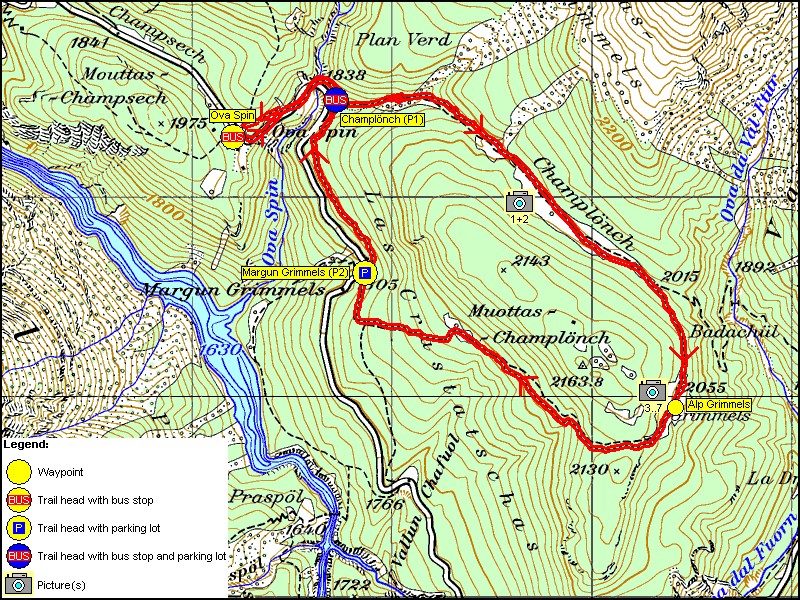 This track was recorded with a GPS and shows the actual trip to Alp Grimmels starting and ending at Ova Spin (find more information about GPS systems here).