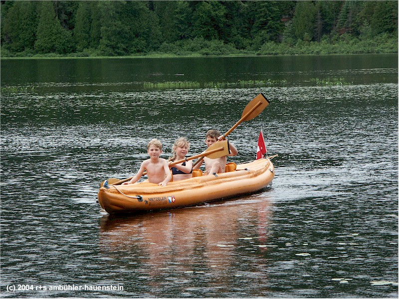 da wir noch lebensmittel benötigen, fahren wir nach saint-mathieu-du-parc, wo es ein kleines lebensmittelgeschäft hat. mit vollen säcken sind wir um 1140 wieder auf dem campingplatz mistagance. wir essen zu mittag, dann packen die kinder das mitgebrachte gummiboot aus und pumpen es auf. wir binden das boot auf das dach unseres wagens und fahren zur rampe beim bootsverleih. schon bald sind unsere kinder auf dem wasser unterwegs ...