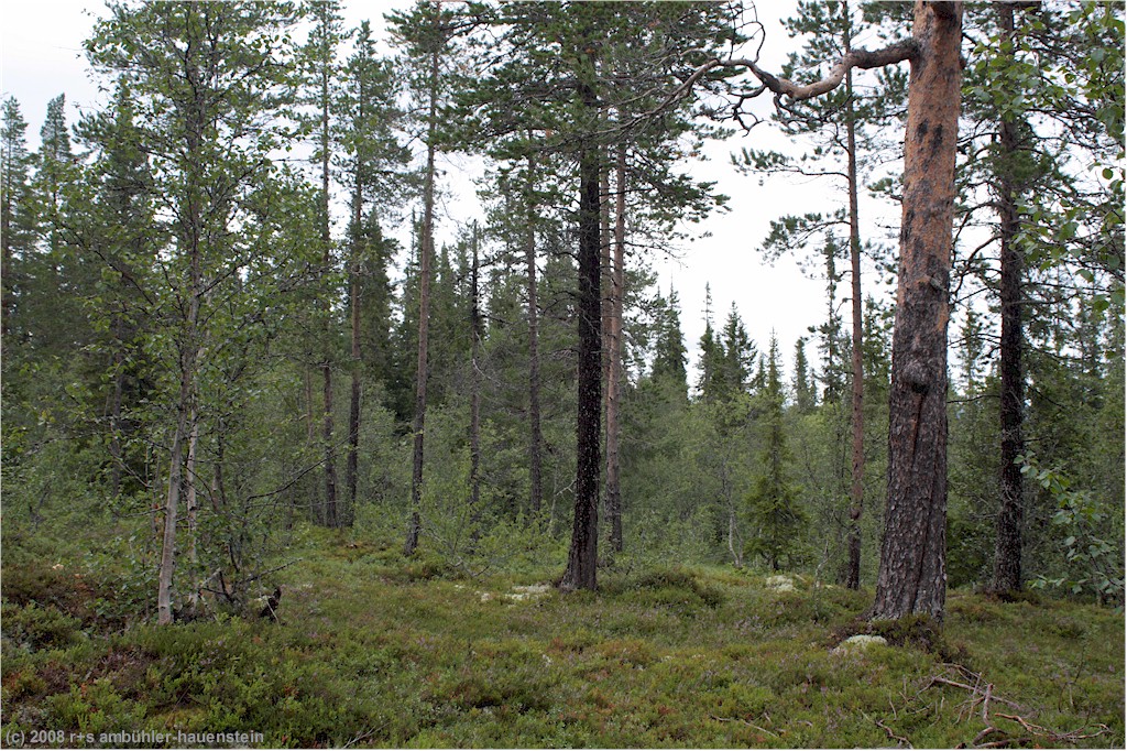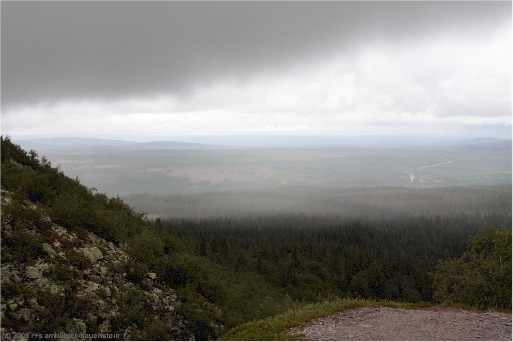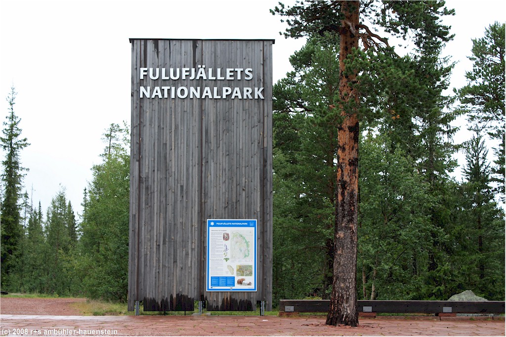 auch heute morgen regnet es, als wir erwachen. trotzdem bleiben wir nicht wieder bis fast gegen mittag im bett, denn wir möchten den fulufjällets nationalpark besuchen. während wir frühstücken sehen wir im westen ein bisschen weniger dunkle wolken. kurz nach 11 uhr fahren wir los, obwohl es immer noch etwas regnet. die fahrt zum besucherzentrum des nationalparks dauert eine gute halbe stunde. da wir schon vor zwei jahren hier waren, kennen wir uns ganz gut aus. damals hatten wir aber zu wenig zeit für eine wanderung aufs fjäll, weshalb wir uns mit einer wanderung zum fuss des wasserfalls njupeskärsfallet begnügen mussten (siehe tagebuch vom 10-aug-2006). heute wollen wir nun aber auf das fjäll hinauf.