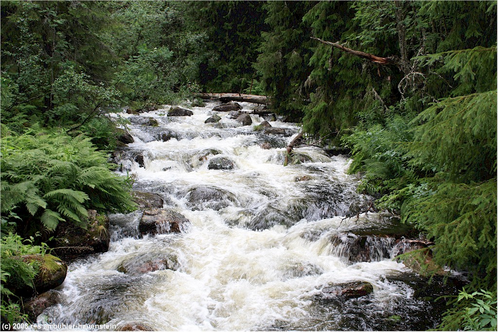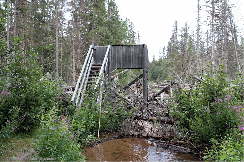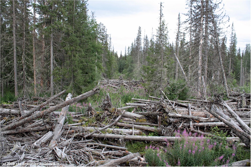 (für vergrösserung auf's bild klicken)im restaurant trinken wir einen kaffee und setzen unsere jassrunde fort. nun ist auch unsere tochter wieder zufrieden. gegen 17:30 uhr machen wir uns auf den rückweg. allerdings fahren wir nicht auf direktem weg zum campingplatz, sondern besuchen noch das gebiet göljån. hier wurde vor elf jahren ein grosses waldstück zerstört. es fiel damals extrem viel regen in sehr kurzer zeit. das führte dazu, dass der kleine fluss durch umgestürzte bäume blockiert wurde. die wassermassen stauten sich auf, bis der druck zu hoch wurde und das geschiebe nach gab. die zerstörung ist zwar gross, aber das ausmass nicht ganz so dramatisch, wie wir uns das auf grund der beschreibung in der parkbroschüre vorgestellt hatten.