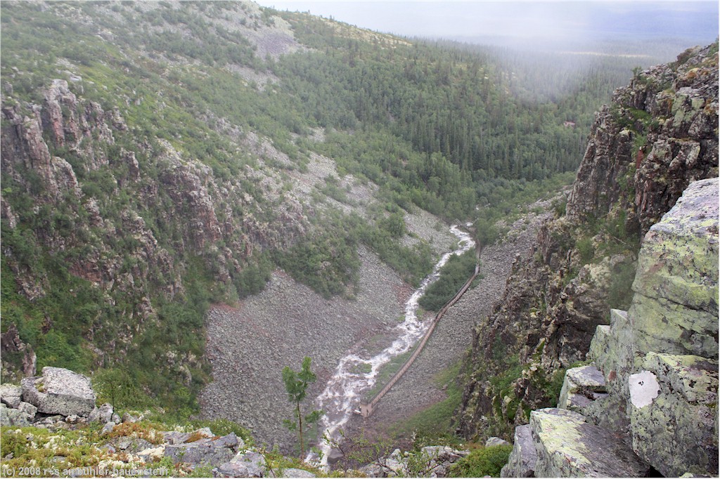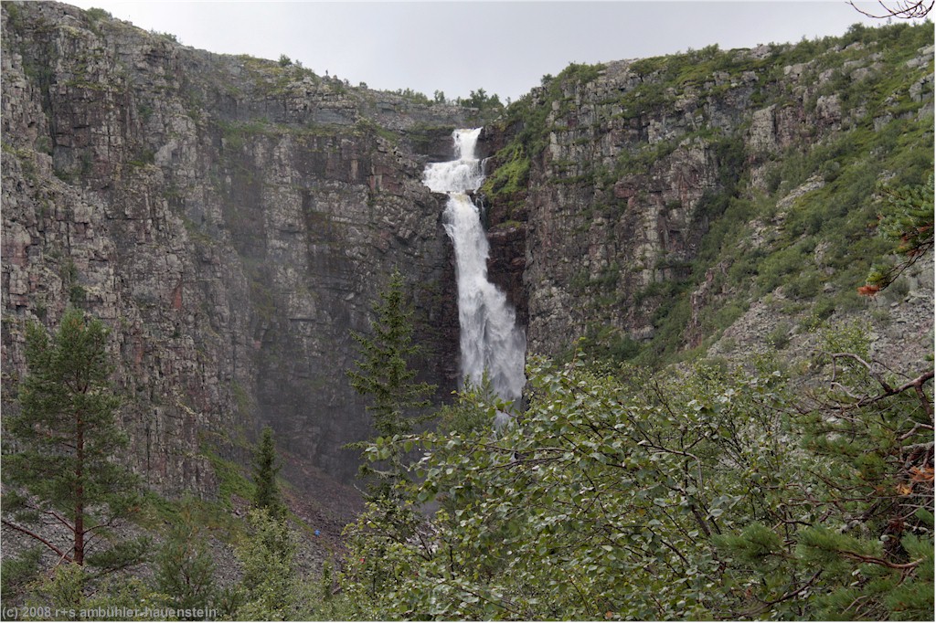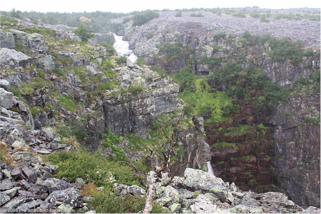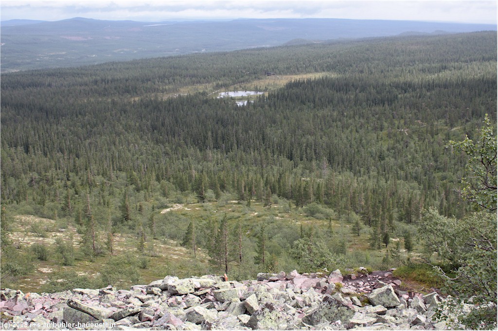 (für vergrösserung auf's bild klicken)bei einer kleinen hütte biegen wir dann vom weg zum fuss des wasserfalls ab und steigen durch den wald aufs fjäll hinauf. zwischen den bäumen können wir den njupeskärsfallet erkennen. gemäss parkbroschüre ist dies mit 93 meter der höchste wasserfall schwedens. im winter gefriert das wasser und wird zum beliebten ziel der eiskletterer. als wir uns der hochebene nähern, hat es keine bäume mehr, dafür eine steile gröllhalde. auf dem fjäll haben wir eine herrliche aussicht ins tal.