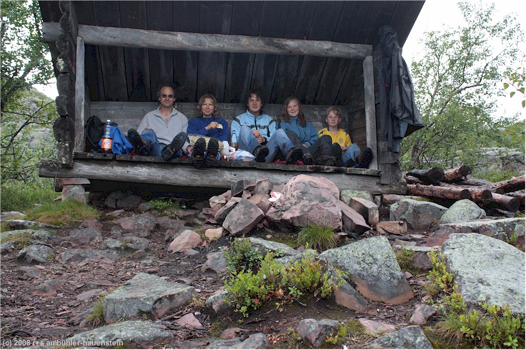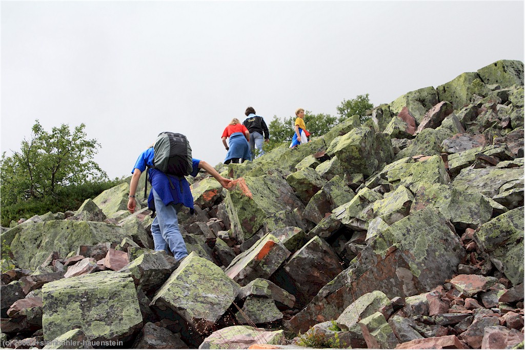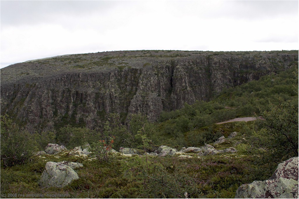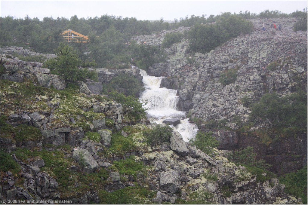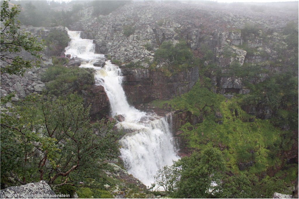 (für vergrösserung auf's bild klicken)bei einer kleinen hütte biegen wir dann vom weg zum fuss des wasserfalls ab und steigen durch den wald aufs fjäll hinauf. zwischen den bäumen können wir den njupeskärsfallet erkennen. gemäss parkbroschüre ist dies mit 93 meter der höchste wasserfall schwedens. im winter gefriert das wasser und wird zum beliebten ziel der eiskletterer. als wir uns der hochebene nähern, hat es keine bäume mehr, dafür eine steile gröllhalde. auf dem fjäll haben wir eine herrliche aussicht ins tal.