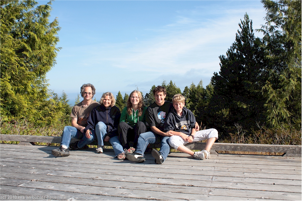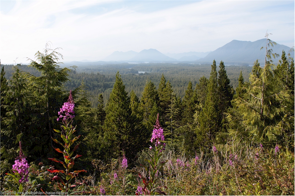 bald sind wir wieder im pacific rim national park. gerade nach der parkgrenze machen wir einen kurzen abstecher zum knapp 120 meter hohen radar hill. knapp unter dem gifpel hat es einen parkplatz. wir klettern den steilen hang richtung höchsten punkt hinauf, setzen uns auf die verstreuten felsen und essen zu "mittag". von der reihenfolge der mahlzeiten her gesehen ist es schon unser mittagessen, aber es ist bereits 1700 uhr. nach dem essen erklimmen wir den gipfel noch ganz und geniessen die tolle aussicht auf den dicht bewaldeten küstenstreifen sowie den nun tiefblauen pazifik. der nebel vom vormittag hat sich inzwischen auch an der küste in nichts aufgelöst und der himmel ist beinahe wolkenlos.