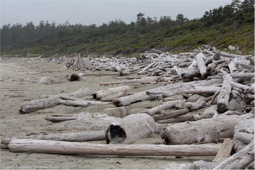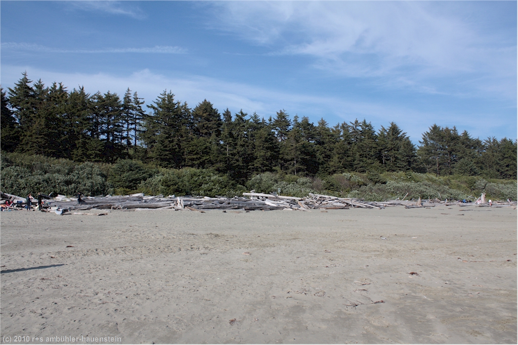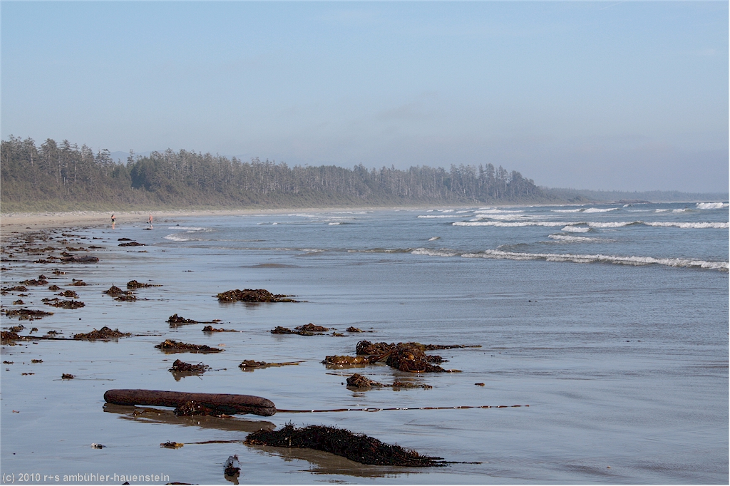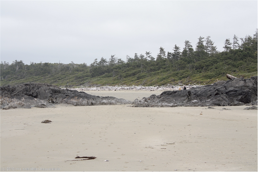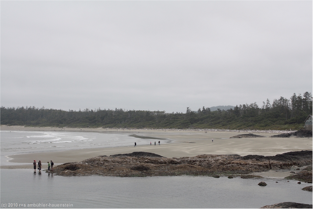 wir fahren zum südlichen ende der wickaninnish bay und spazieren etwas dem sandstrand entlang. für uns schweizer ist das meer immer wieder etwas besonderes. ich atme die salzige luft ein - so riechen ferien ! trotz der kühlen witterung tummeln sich zahlreiche surfer im wasser, allerdings mit trockenanzügen ausgerüstet, sonst wäre das kalte wasser wohl kaum auszuhalten. auch mütter und kinder versuchen sich auf ihren brettern, das wellenreiten ist hier ganz offensichtlich ein familiensport. am strand haben sich angeschwemmten baumstämmen angesammelt, so wie wir es schon oft an der pazifikküste gesehen haben. von der flut werden sie jeweils ganz bis zum felsband zwischen sandstrand und wald gespült, so dass die küste ganz ordentlich wirkt. einige wenige baumstämme wurden von besonders grossen wellen sogar bis auf die felsen hinaufgetragen, dort liegen sie nun wie überdimensionale knochen. aber auch auf dem sand gibt es allerei zu entdecken, zum beispiel krebse oder was davon übriggeblieben ist. aber auch muscheln liegen herum und die gurkenartigen algen. ganz am südlichen ende der bucht klettern wir auf die felsen und schauen in die dahinterliegende lagune. das wasser hat eine sehr schöne, blaugrüne farbe. ganz in der nähe steht ein strandhaus, in welchem es ein restaurant hat. bestimmt hat man dort eine tolle aussicht auf den pazifik. im wald führt ein pfad zurück zum parkplatz. unterwegs kommen wir an einem totem pole vorbei. die figuren wirken aber auf mich nicht besonders authentisch sondern irgendwie zu modern. kurz vor 1500 uhr sind wir wieder beim auto.