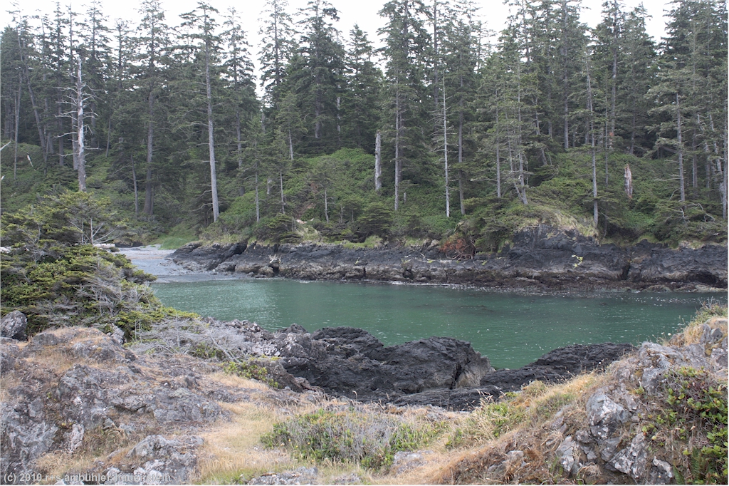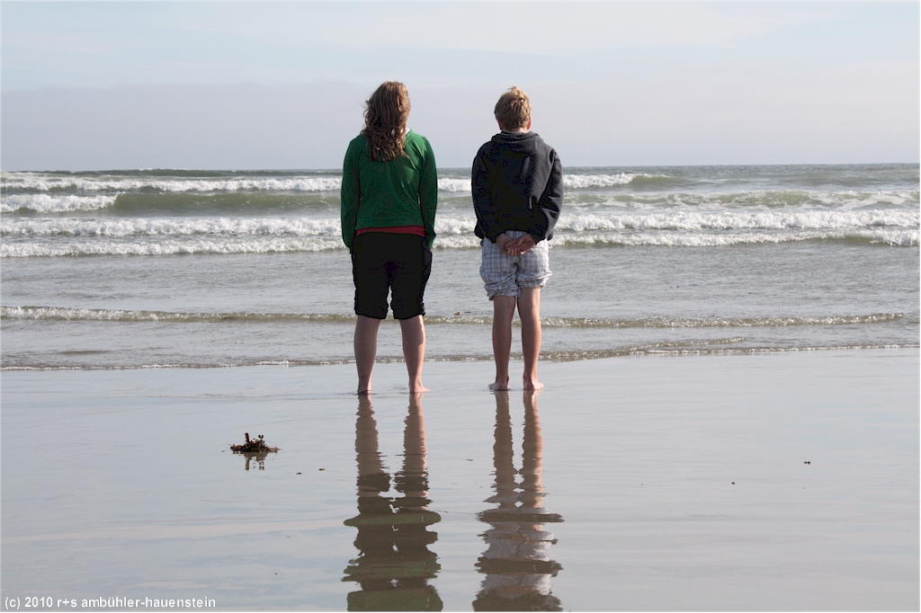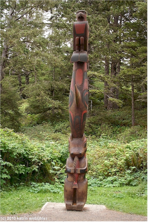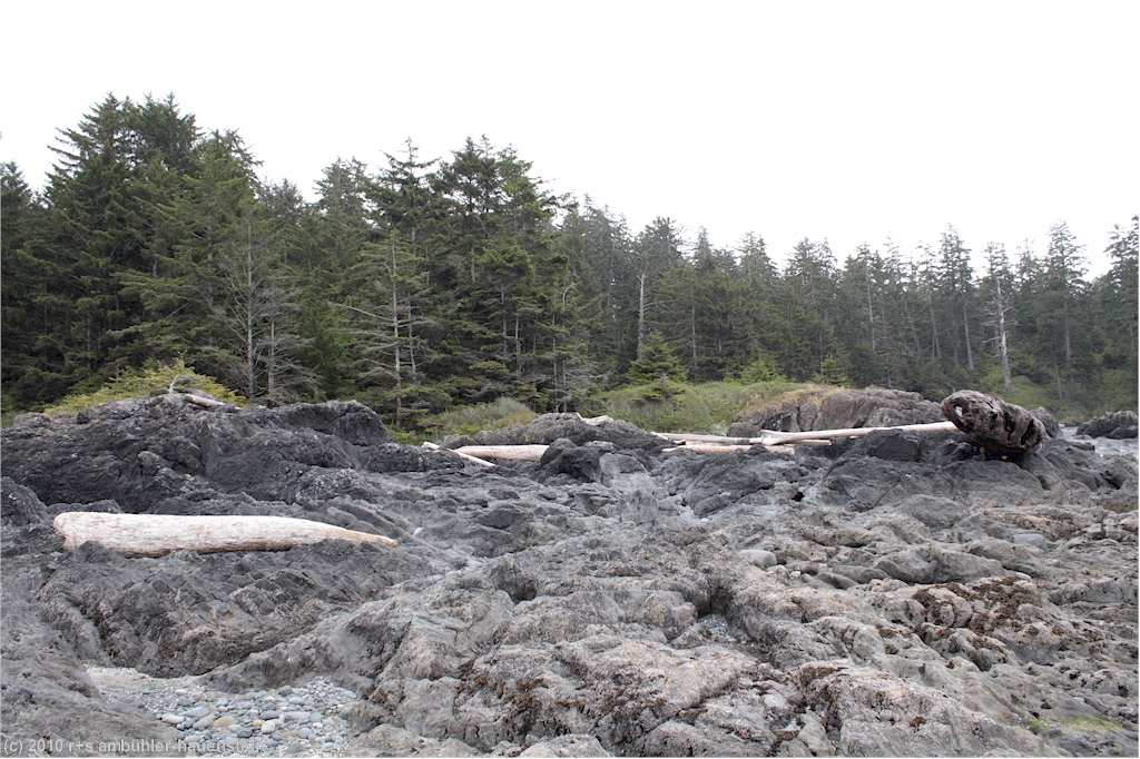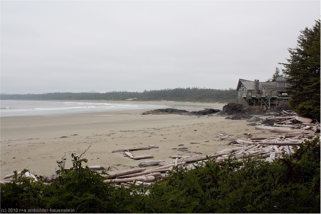 wir fahren zum südlichen ende der wickaninnish bay und spazieren etwas dem sandstrand entlang. für uns schweizer ist das meer immer wieder etwas besonderes. ich atme die salzige luft ein - so riechen ferien ! trotz der kühlen witterung tummeln sich zahlreiche surfer im wasser, allerdings mit trockenanzügen ausgerüstet, sonst wäre das kalte wasser wohl kaum auszuhalten. auch mütter und kinder versuchen sich auf ihren brettern, das wellenreiten ist hier ganz offensichtlich ein familiensport. am strand haben sich angeschwemmten baumstämmen angesammelt, so wie wir es schon oft an der pazifikküste gesehen haben. von der flut werden sie jeweils ganz bis zum felsband zwischen sandstrand und wald gespült, so dass die küste ganz ordentlich wirkt. einige wenige baumstämme wurden von besonders grossen wellen sogar bis auf die felsen hinaufgetragen, dort liegen sie nun wie überdimensionale knochen. aber auch auf dem sand gibt es allerei zu entdecken, zum beispiel krebse oder was davon übriggeblieben ist. aber auch muscheln liegen herum und die gurkenartigen algen. ganz am südlichen ende der bucht klettern wir auf die felsen und schauen in die dahinterliegende lagune. das wasser hat eine sehr schöne, blaugrüne farbe. ganz in der nähe steht ein strandhaus, in welchem es ein restaurant hat. bestimmt hat man dort eine tolle aussicht auf den pazifik. im wald führt ein pfad zurück zum parkplatz. unterwegs kommen wir an einem totem pole vorbei. die figuren wirken aber auf mich nicht besonders authentisch sondern irgendwie zu modern. kurz vor 1500 uhr sind wir wieder beim auto.