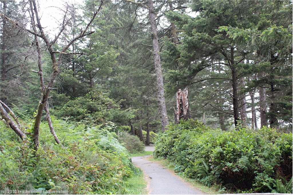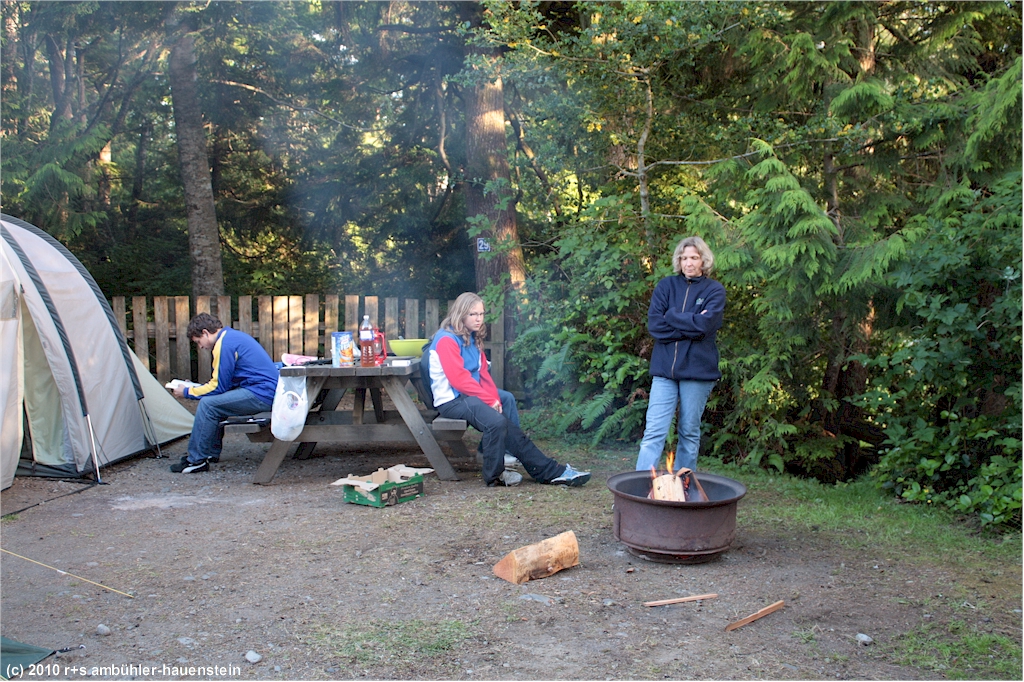 wir schlafen bis gegen 1000 uhr. als wir aufstehen ist von den kindern noch nichts zu sehen oder hören. susanne und ich fahren ins dorf um lebensmittel für das frühstück einzukaufen. als wir gegen 1100 uhr wieder auf dem campingplatz sind, holen wir die kinder aus den schlafsäcken. es liegt eine nebelschicht über der küste, entsprechend ist es feucht und kalt. nach dem frühstück fahren wir zum nahen besucherzentrum des pacific rim national park, wo wir uns über die attraktionen informieren und einen jahrespass für die kanadischen nationalparks kaufen. das ist zwar für uns nicht unbedingt billiger, als jedesmal eintritt zu bezahlen wenn wir einen nationalpark besuchen, aber es ist zum einen bequemer und zum anderen unterstützen wir so den nationalpark service etwas.