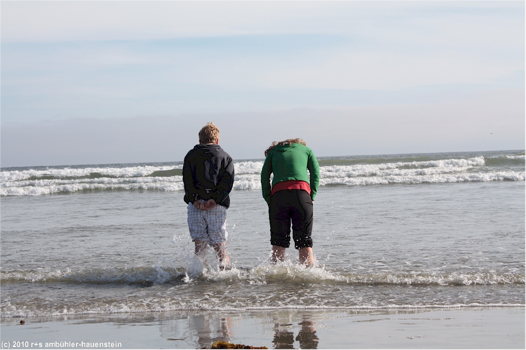 auf dem rückweg zum campingplatz machen wir beim incinerator rock am nördlichen ende der wickaninnish bay nochmals einen abstecher zur küste. der sandstrand zieht sich der ganzen bucht entlang und auch hier liegen die angeschwemmten baumstämme ordentlich am fuss der felsküste. katrin und mathias stellen sich ganz nahe ans wasser und warten auf eine etwas grössere welle. als diese dann kommt, ist das wasser offensichtlich kälter als erwartet. schliesslich kehren wir zum auto zurück und fahren nach ucluelet.