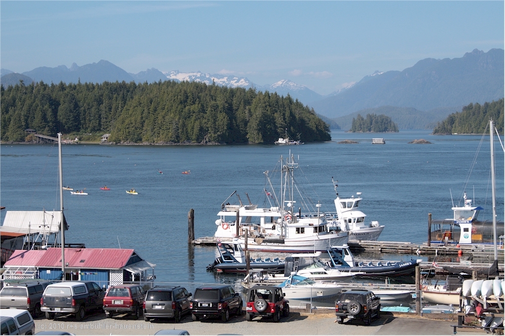 wir fahren zum nördlichen ende der halbinsel, dort befindet sich die hübsche stadt tofino. im coop kaufen wir ausgiebig lebensmittel ein. in einem haushaltgeschäft erstehen wir unter anderem eine petrollampe, damit wir am abend licht machen können. als häufige skandinavien-reisende sind wir uns nicht gewohnt, dass es in der nacht richtig dunkel wird. aber hier sind wir auf der höhe von paris, da ist nichts mit langen abenden. auf dem rückweg machen wir ausgangs ort halt bei jamie's whaling station, wo wir für morgen 1500 uhr eine whale watching tour buchen. das kostet zwar für eine fünfköpfige familie ein vermögen, aber das können wir uns einfach nicht entgehen lassen.