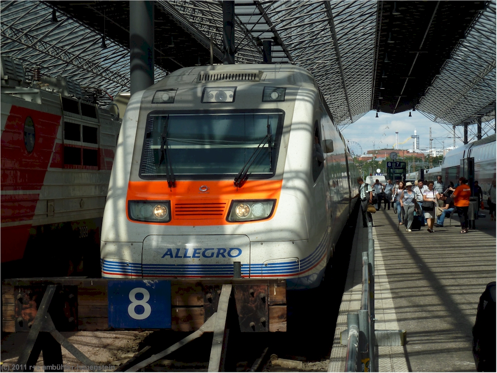 zehn minuten bevor der zug fährt, sind wir beim bahnhof. wir haben noch rubel und würden diese gerne umtauschen, denn man darf sie ja eigentlich nicht ausführen. die wechselstube hat jedoch zu, so kaufen wir am kiosk noch etwas zu essen und zu trinken, um wenigstens einen teil des russischen geldes noch los zu werden. mathias wird langsam nervös, denn in wenigen minuten fährt der zug. kaum sind wir eingestiegen, werden die türen geschlossen. pünktlich verlässt der "allegro" sankt petersburg. während wir aus der stadt rollen, meldet katrin, dass sich ihr abflug um etwa eine stunde verzögert. das ist nicht weiter schlimm, denn sie wäre eine stunde vor uns in helsinki eingetroffen, jetzt kommen wir halt gleichzeitig an, wobei sie dann allerdings noch mit dem bus vom flughafen zum bahnhof fahren muss.