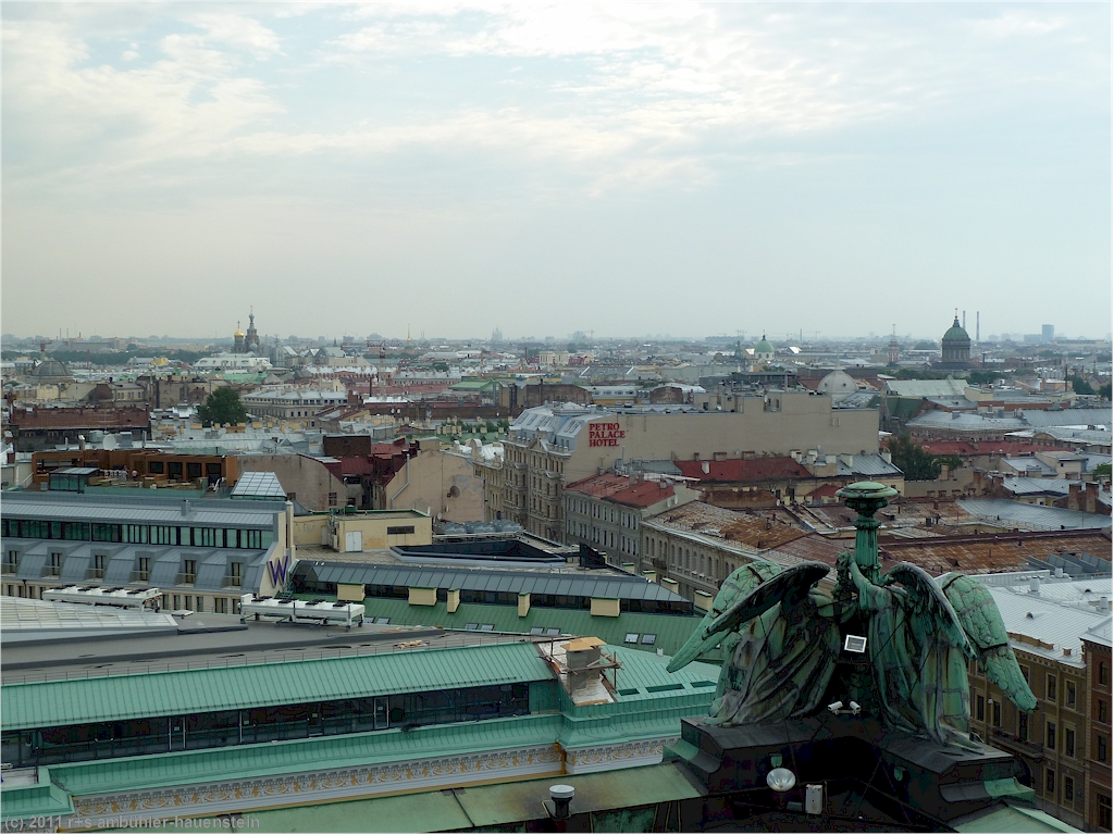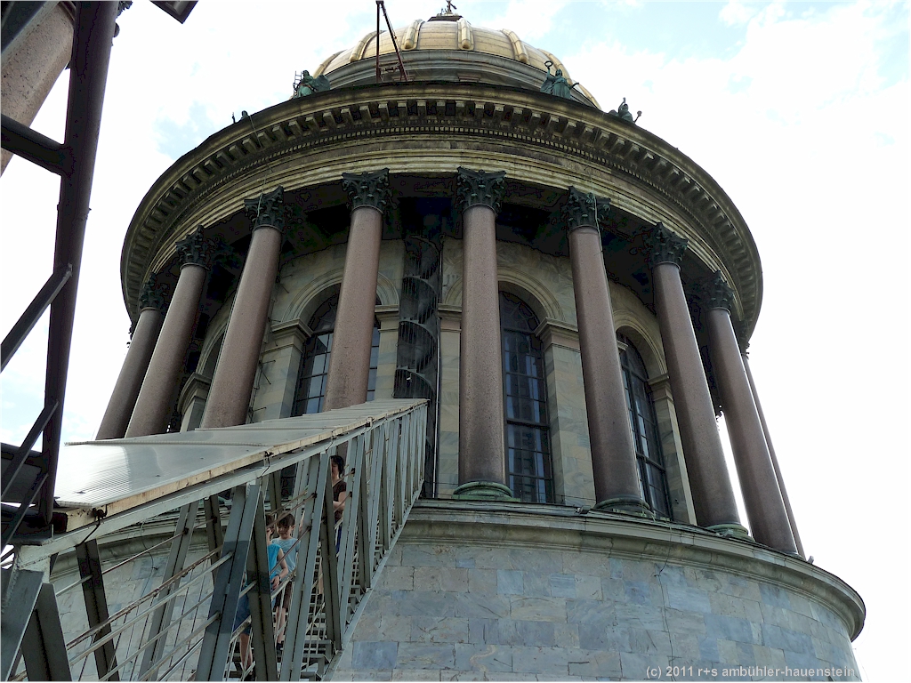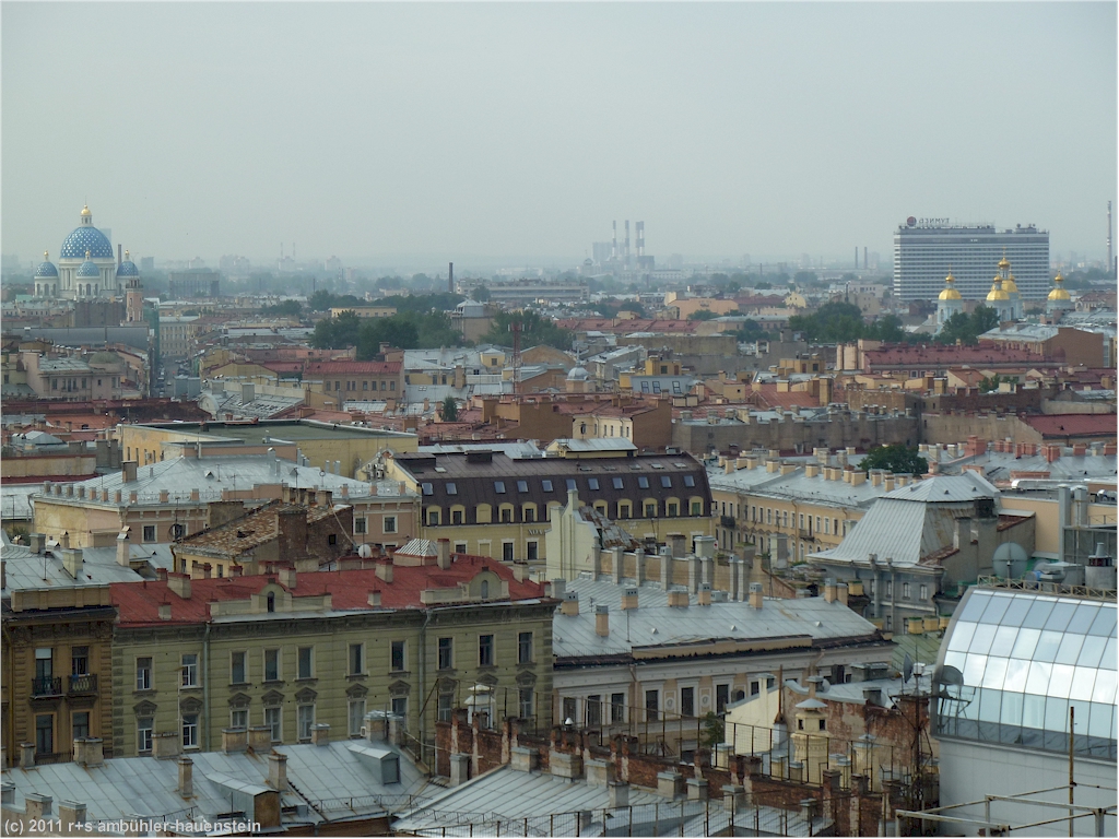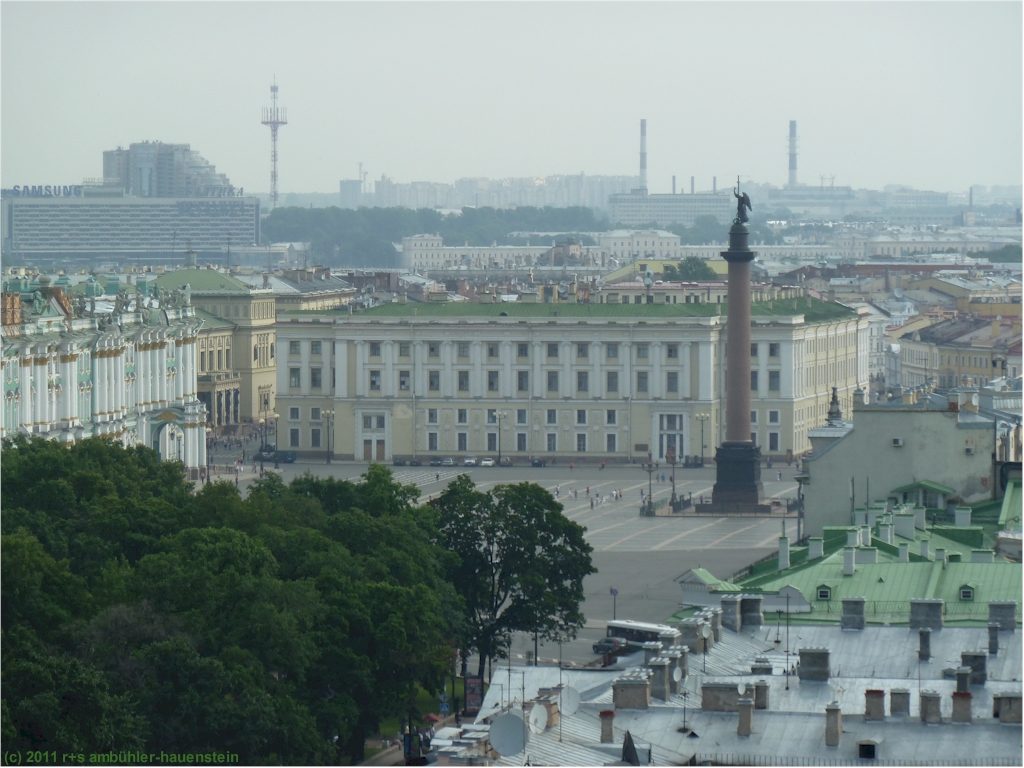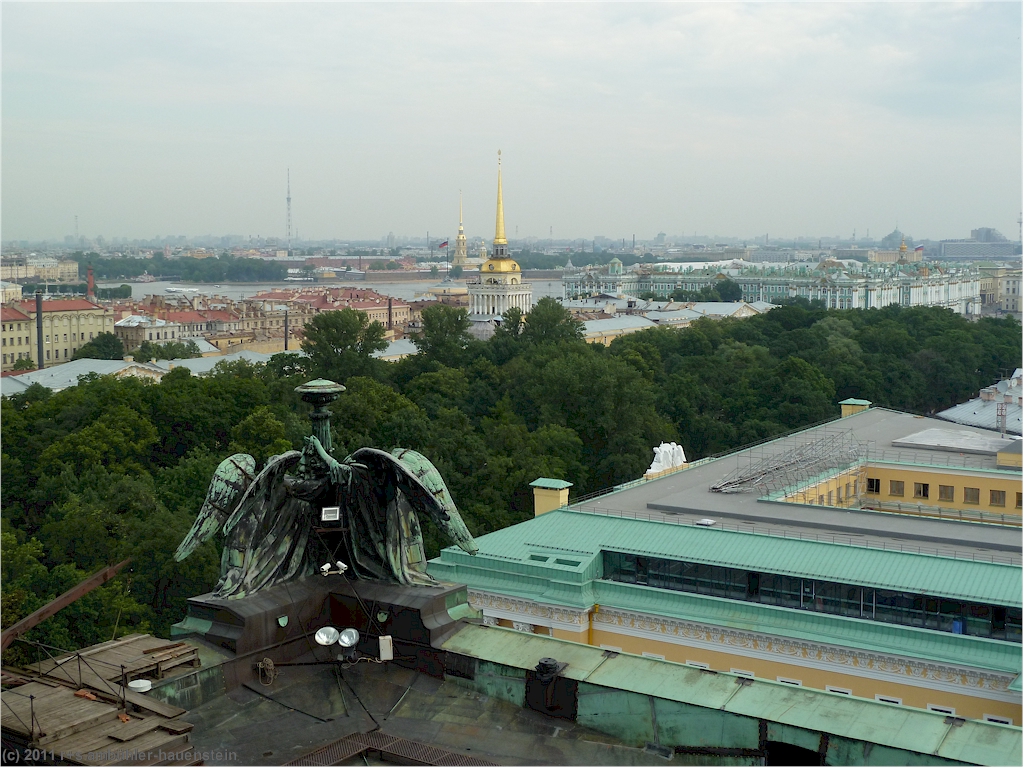 der ausblick vom dom der isaakskathedrale entschädigt uns weitgehend für den ungemach am eingang. leider ist der himmel nicht mehr so wolkenlos wie die letzten beiden tage, was sich natürlich etwas negativ auf die fotos auswirkt. zu unseren füssen breitet sich in allen richtungen ein endloses häusermeer aus. es gibt kaum hochhäuser, alle gebäude scheinen mehr oder weniger gleich hoch zu sein. trotzdem stechen einige aus der masse heraus. wenn wir richtung newa (neva) blicken, so fällt uns zuerst der park zwischen senat/synod und der admiralität auf. auf der gegenüberliegenden flussseite erkennen wir verschiedene berühmte bauten, unter anderem den menschikow-palast, die universität und die akademie der wissenschaften. aber auch die peter-paul-festung und der winterpalast (zimniy dvorets) mit dem alexanderplatz sind unverkennbar. auf der dem fluss abgewandten seite befindet sich der isaaksplatz, die blaue brücke (sinij most) und der marienpalais. gemäss reiseführer ist die blaue brücke 97 meter breit. sie ist kaum als brücke erkennbar, erst bei genauem hinsehen erkennt man am linken und rechten bildrand den moyka-kanal. etwas mehr in der distanz sehen wir die blauen dächer der dreifaltigkeitskathedrale (troitskiy sobor) und die goldenen türme der nikolaus und erscheinung des herrn kathedrale (nikolsky sobor). unmittelbar dahinter ragt ein mächtiger klotz in den himmel. auffällig sind aber auch die zahllosen kamine, an kalten wintertagen wird wohl viel rauch über der stadt hängen. über eine spektakuläre treppe gelangen wir schliesslich vom dom zum haupttrakt und in diesem über eine schier endlose wendeltreppe wieder auf den platz vor der kirche.
