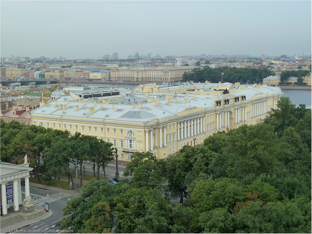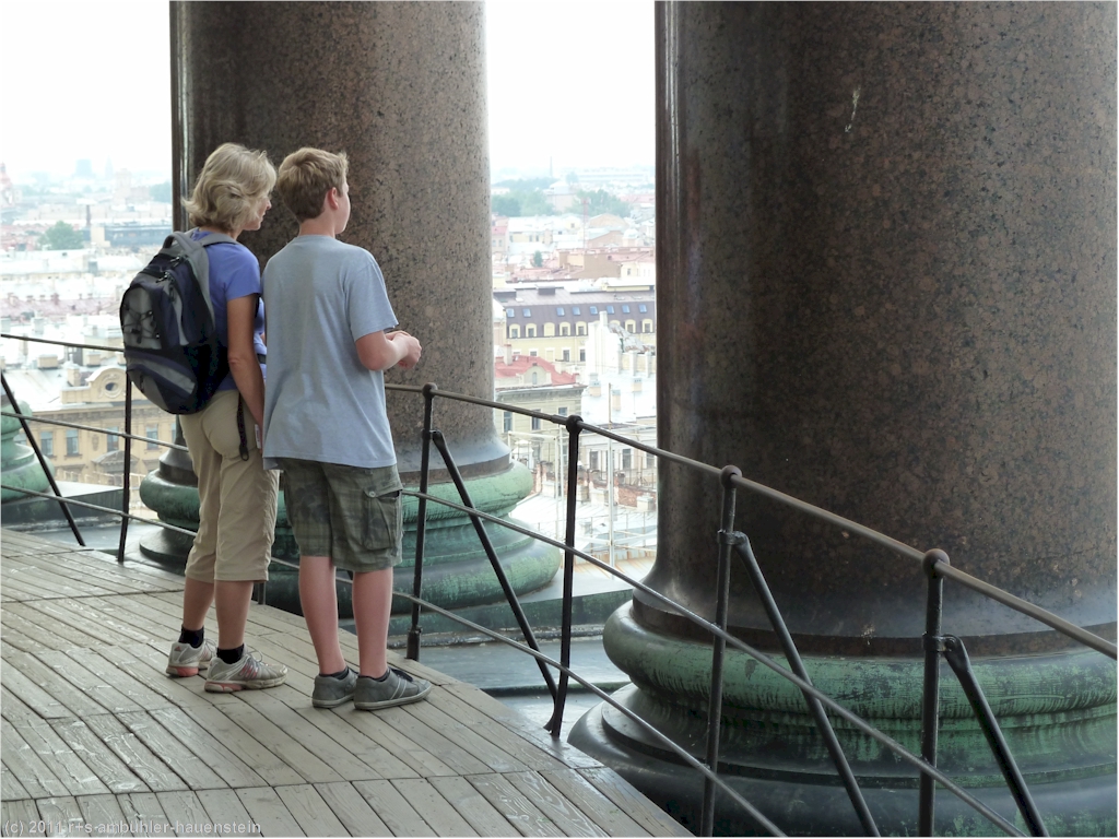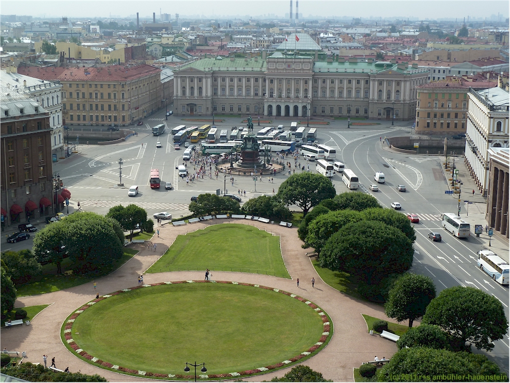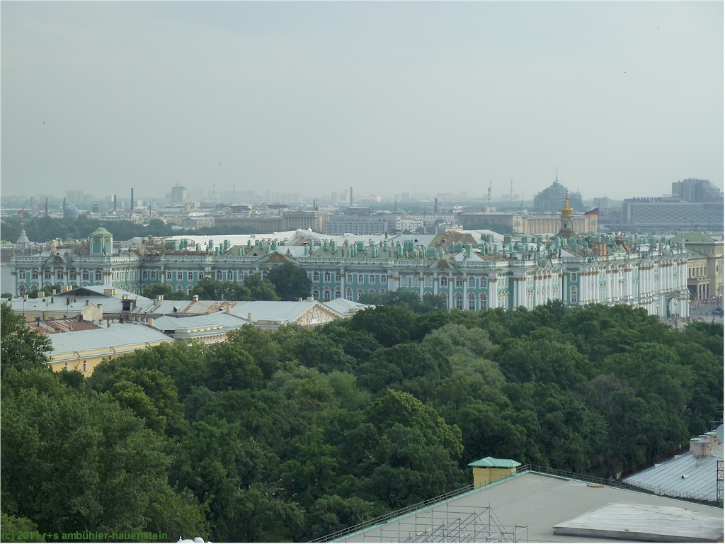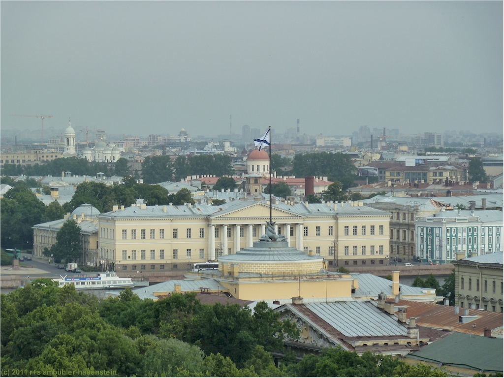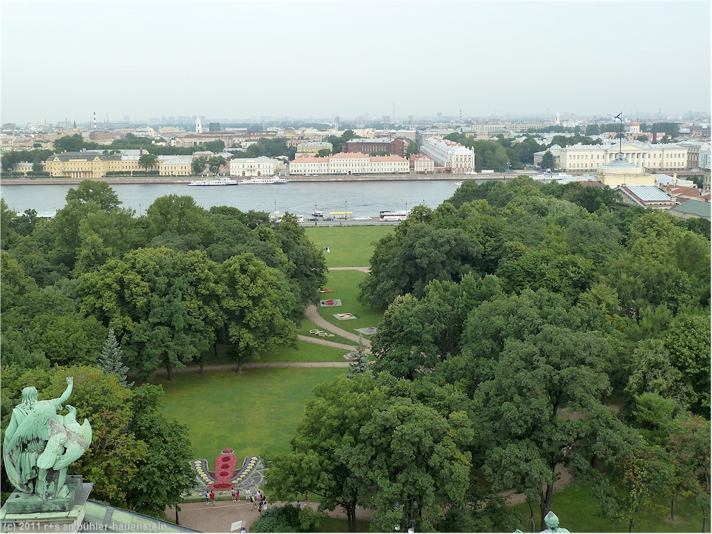 der ausblick vom dom der isaakskathedrale entschädigt uns weitgehend für den ungemach am eingang. leider ist der himmel nicht mehr so wolkenlos wie die letzten beiden tage, was sich natürlich etwas negativ auf die fotos auswirkt. zu unseren füssen breitet sich in allen richtungen ein endloses häusermeer aus. es gibt kaum hochhäuser, alle gebäude scheinen mehr oder weniger gleich hoch zu sein. trotzdem stechen einige aus der masse heraus. wenn wir richtung newa (neva) blicken, so fällt uns zuerst der park zwischen senat/synod und der admiralität auf. auf der gegenüberliegenden flussseite erkennen wir verschiedene berühmte bauten, unter anderem den menschikow-palast, die universität und die akademie der wissenschaften. aber auch die peter-paul-festung und der winterpalast (zimniy dvorets) mit dem alexanderplatz sind unverkennbar. auf der dem fluss abgewandten seite befindet sich der isaaksplatz, die blaue brücke (sinij most) und der marienpalais. gemäss reiseführer ist die blaue brücke 97 meter breit. sie ist kaum als brücke erkennbar, erst bei genauem hinsehen erkennt man am linken und rechten bildrand den moyka-kanal. etwas mehr in der distanz sehen wir die blauen dächer der dreifaltigkeitskathedrale (troitskiy sobor) und die goldenen türme der nikolaus und erscheinung des herrn kathedrale (nikolsky sobor). unmittelbar dahinter ragt ein mächtiger klotz in den himmel. auffällig sind aber auch die zahllosen kamine, an kalten wintertagen wird wohl viel rauch über der stadt hängen. über eine spektakuläre treppe gelangen wir schliesslich vom dom zum haupttrakt und in diesem über eine schier endlose wendeltreppe wieder auf den platz vor der kirche.