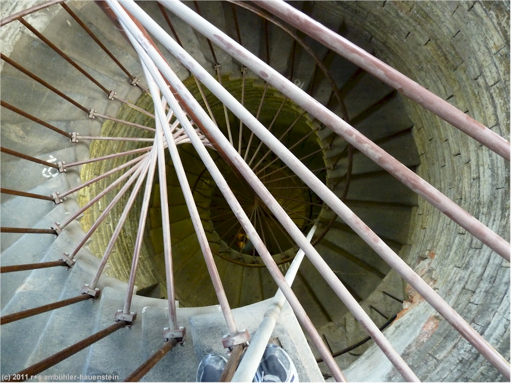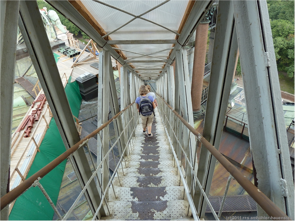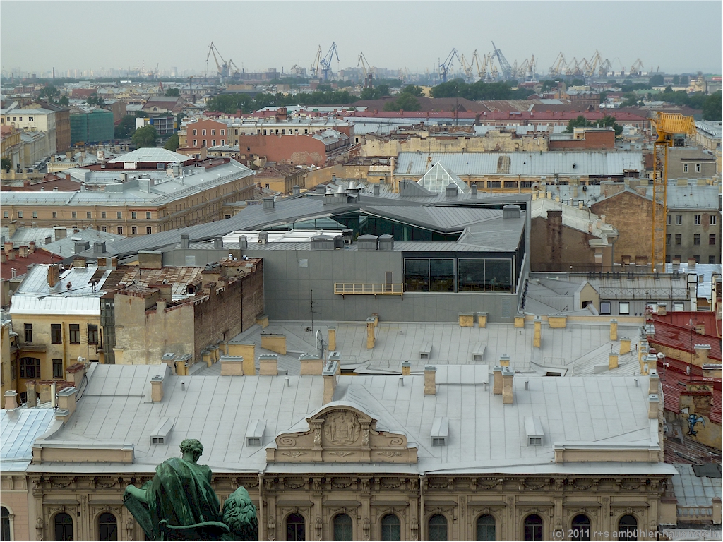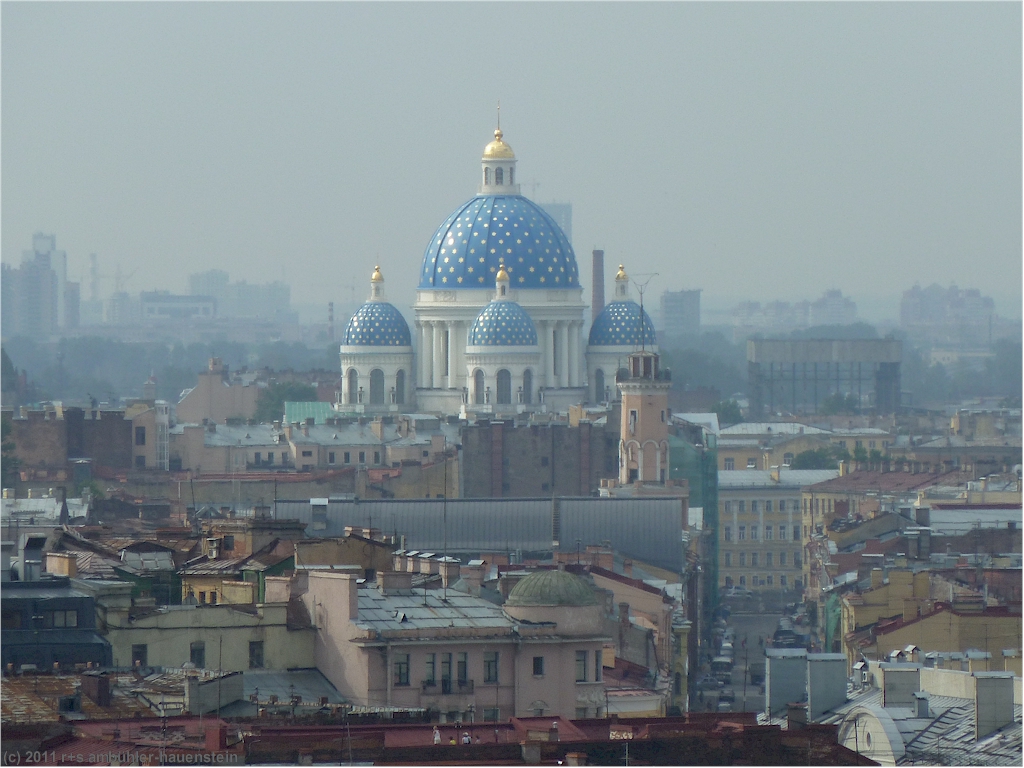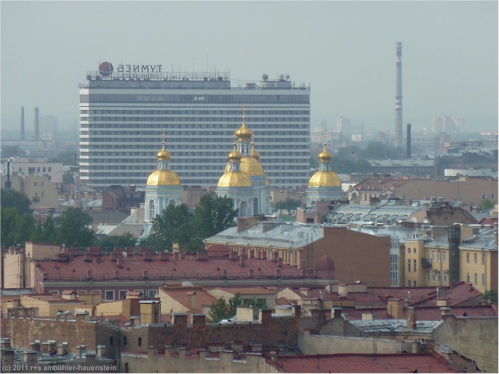 der ausblick vom dom der isaakskathedrale entschädigt uns weitgehend für den ungemach am eingang. leider ist der himmel nicht mehr so wolkenlos wie die letzten beiden tage, was sich natürlich etwas negativ auf die fotos auswirkt. zu unseren füssen breitet sich in allen richtungen ein endloses häusermeer aus. es gibt kaum hochhäuser, alle gebäude scheinen mehr oder weniger gleich hoch zu sein. trotzdem stechen einige aus der masse heraus. wenn wir richtung newa (neva) blicken, so fällt uns zuerst der park zwischen senat/synod und der admiralität auf. auf der gegenüberliegenden flussseite erkennen wir verschiedene berühmte bauten, unter anderem den menschikow-palast, die universität und die akademie der wissenschaften. aber auch die peter-paul-festung und der winterpalast (zimniy dvorets) mit dem alexanderplatz sind unverkennbar. auf der dem fluss abgewandten seite befindet sich der isaaksplatz, die blaue brücke (sinij most) und der marienpalais. gemäss reiseführer ist die blaue brücke 97 meter breit. sie ist kaum als brücke erkennbar, erst bei genauem hinsehen erkennt man am linken und rechten bildrand den moyka-kanal. etwas mehr in der distanz sehen wir die blauen dächer der dreifaltigkeitskathedrale (troitskiy sobor) und die goldenen türme der nikolaus und erscheinung des herrn kathedrale (nikolsky sobor). unmittelbar dahinter ragt ein mächtiger klotz in den himmel. auffällig sind aber auch die zahllosen kamine, an kalten wintertagen wird wohl viel rauch über der stadt hängen. über eine spektakuläre treppe gelangen wir schliesslich vom dom zum haupttrakt und in diesem über eine schier endlose wendeltreppe wieder auf den platz vor der kirche.