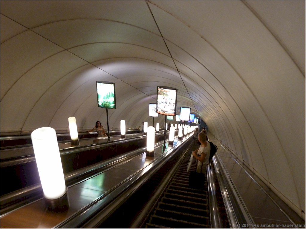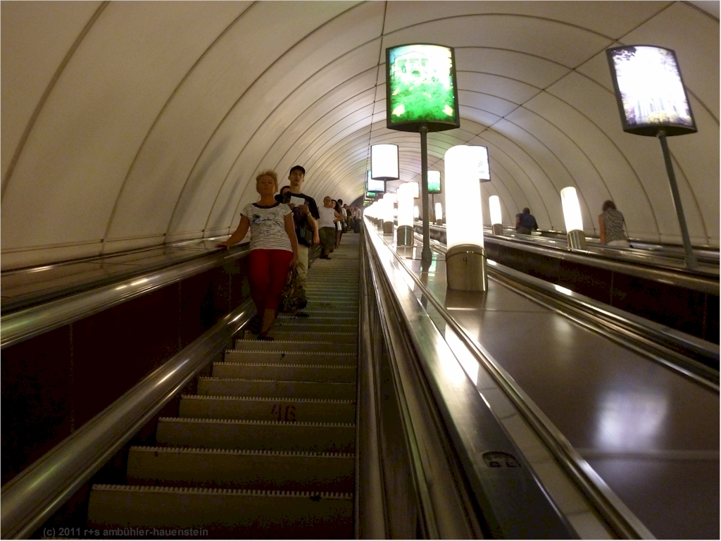 kurz nach 1400 uhr sind wir wieder beim hotel. katrin schreibt, dass sie zusammen mit daniel im flughafen zu mittag isst. wir holen unser gepäck und gehen noch einmal zum einkaufszentrum bol'shoy gostiniy dvor. wir würden gerne daniel und katrin etwas mitbringen und auch wir hätten gerne ein souvenier von sankt petersburg, aber wir finden einfach nichts, was uns gefällt. schliesslich nehmen wir die metro und fahren zum finnland bahnhof. erneut beeindrucken uns die unglaublich langen rolltreppen.