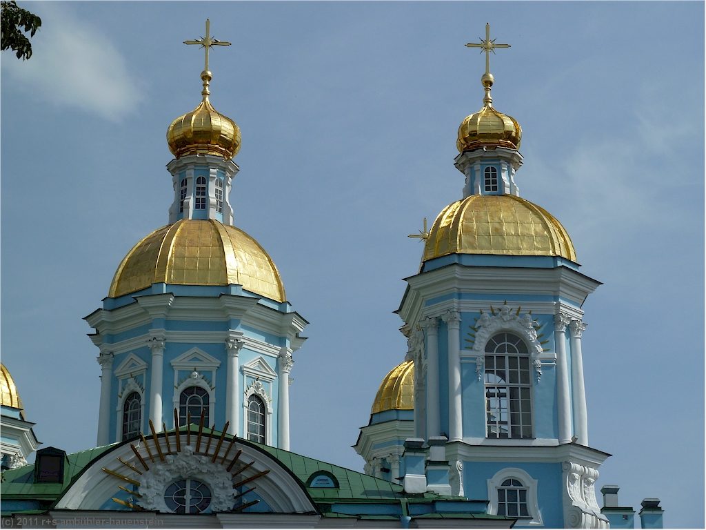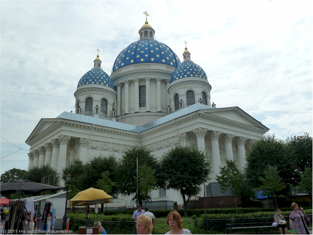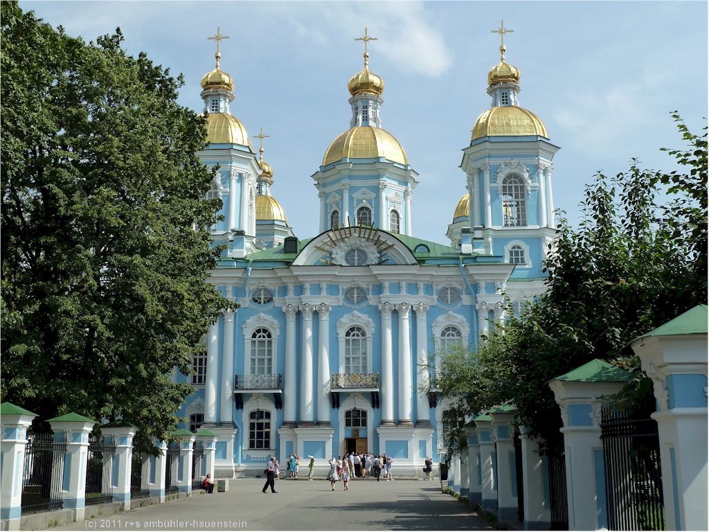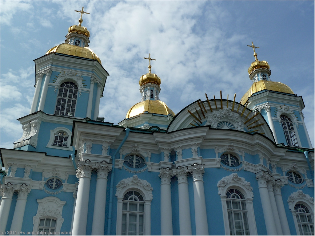 wir überqueren den fontanka-kanal und gehen weiter zur nikolaus und erscheinung des herrn kathedrale (nikolsky sobor). die wolken haben sich etwas verzogen, es ist wieder heiss und die goldenen dächer der kirchtürme glänzen in der sonne. auch diese kirche ist sehr prunkvoll gebaut. sie ist offen, es ist irgend ein ritual im gang. leute mit kleinen kindern gehen in die kirche, andere kommen gerade heraus. wir wagen uns ebenfalls ins gotteshaus. im innern ist die kirche äusserts üppig, ein prunk, der uns protestanten sehr fremd ist. ein pfarrer spricht, es sieht aus, wie wenn die kleinen kinder getauft würden. es wirkt alles sehr eigenartig und fremd, schnell verlassen wir den raum wieder.