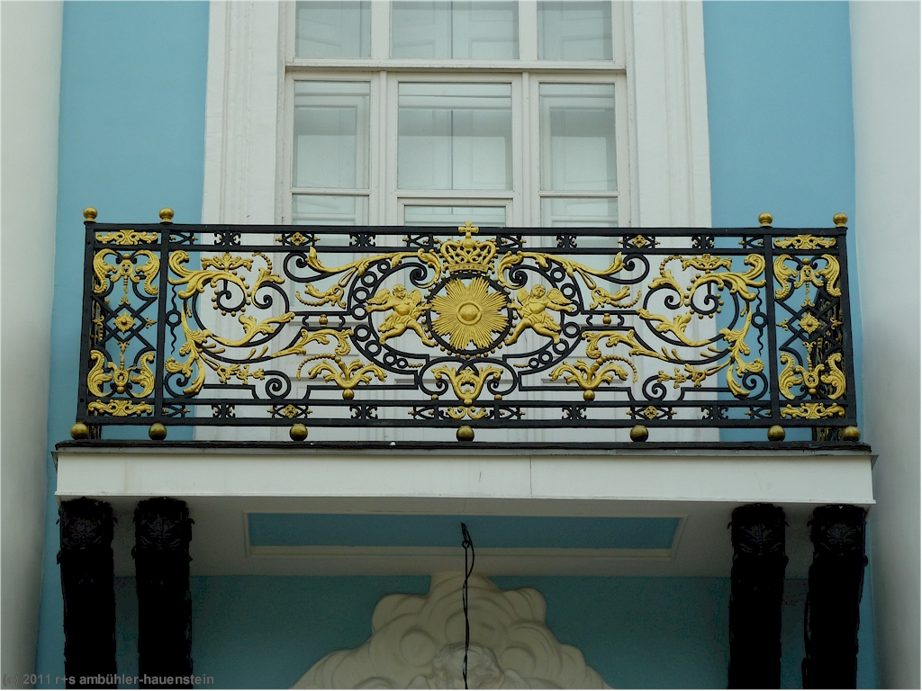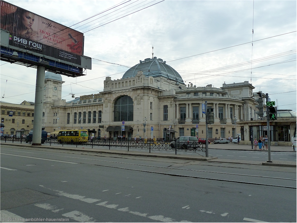 susanne möchte uns nun zum etwas ausserhalb der stadt gelegenen katharinenpalast führen. dieser ist mit einem zug ab dem witebsker bahnhof zu erreichen. den bahnhof haben wir bald gefunden, aber nun wird es echt schwierig. hier ist alles ausschliesslich in kyrillisch angeschrieben, wir finden weder eine englische broschüre noch jemanden, mit dem wir sprechen können. als wir ziemlich verloren in der riesigen bahnhofhalle herumstehen, versucht eine polizistin uns zu helfen. sie scheint zu ahnen, wohin wir wollen und spricht auf russisch auf uns ein. wir verstehen zwar kein wort, realisieren aber schliesslich, dass sie uns sagen will, dass wir in den ersten stock gehen müssen. dort hat es zwar billett-schalter, aber wir finden keinen lesbaren fahrplan und die leute am schalter machen auch keinen hilfsbereiten eindruck. angesichts der tatsache, dass wir um 1530 uhr beim finnland bahnhof sein müssen und wir den zug nach helsinki auf keinen fall verpassen wollen, geben wir unser vorhaben schliesslich auf.