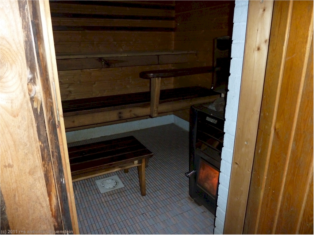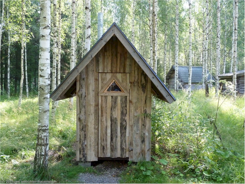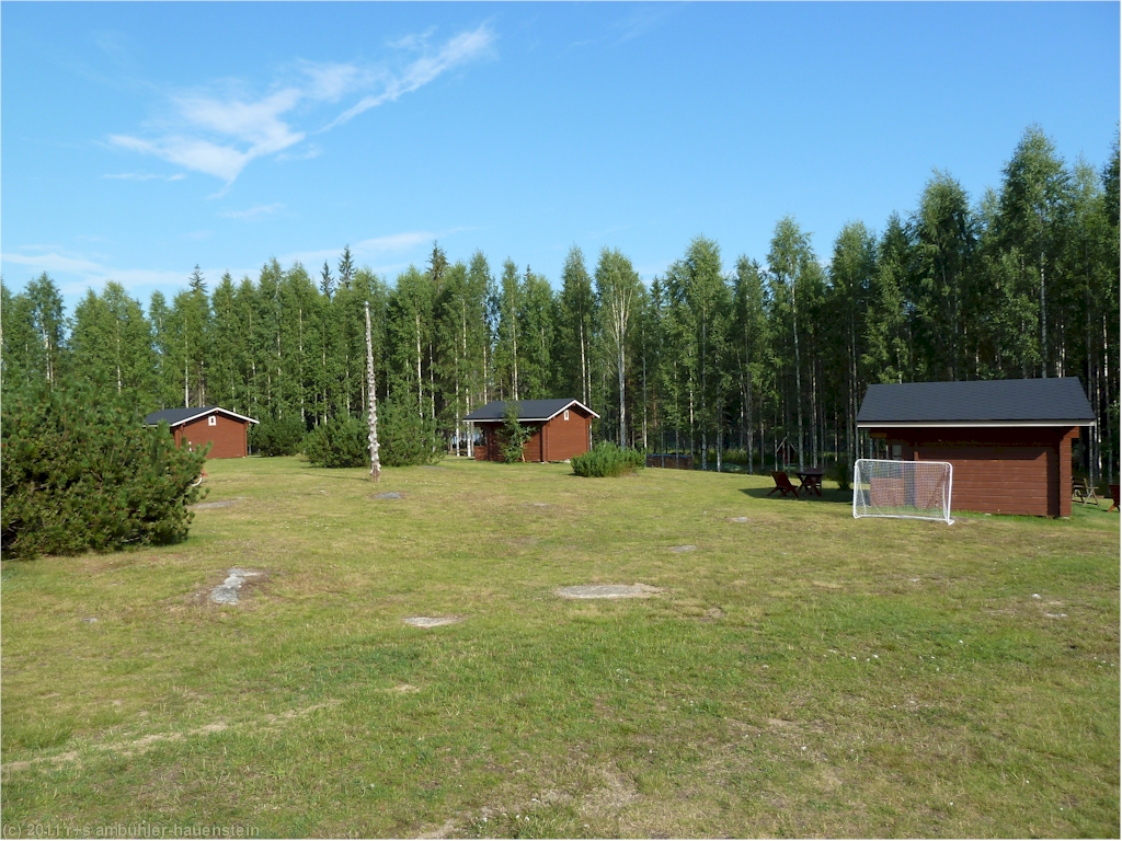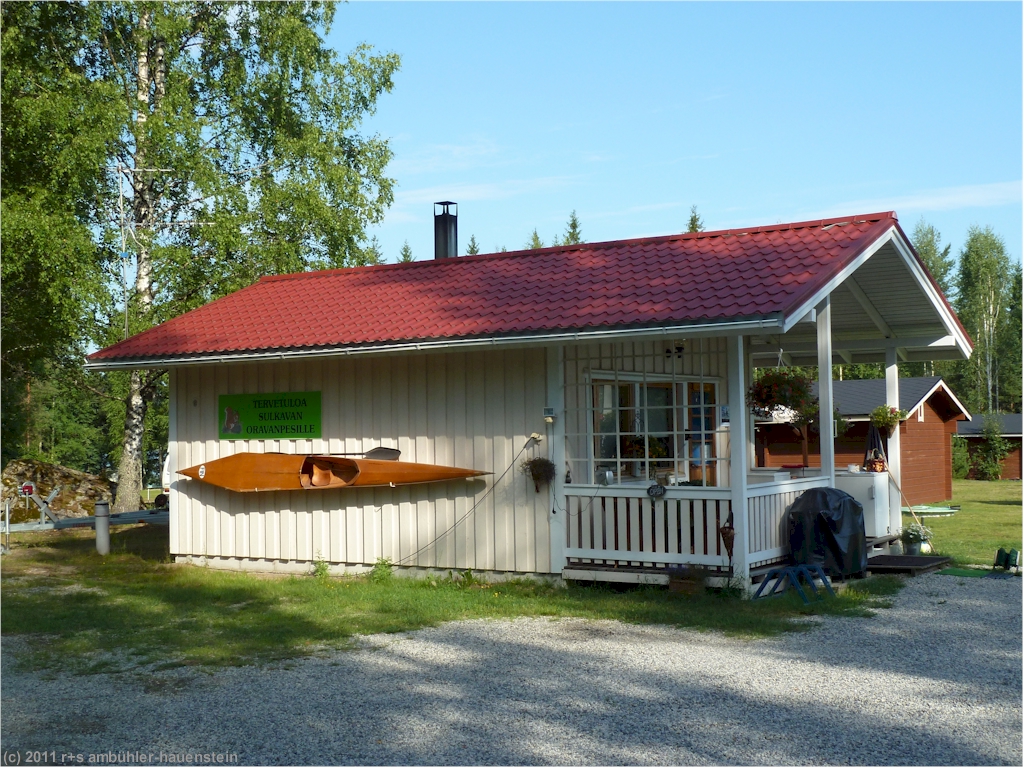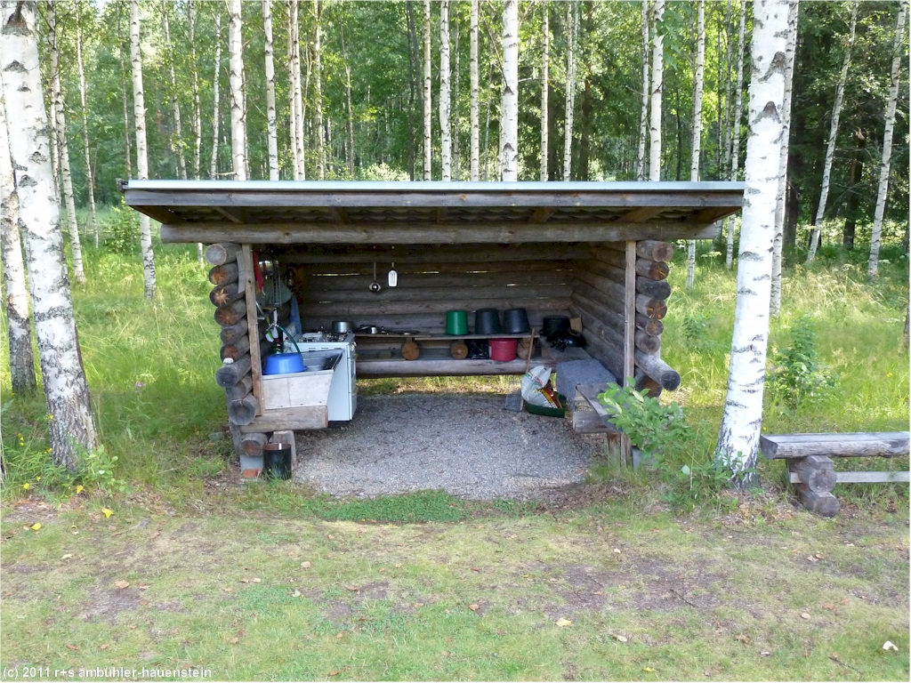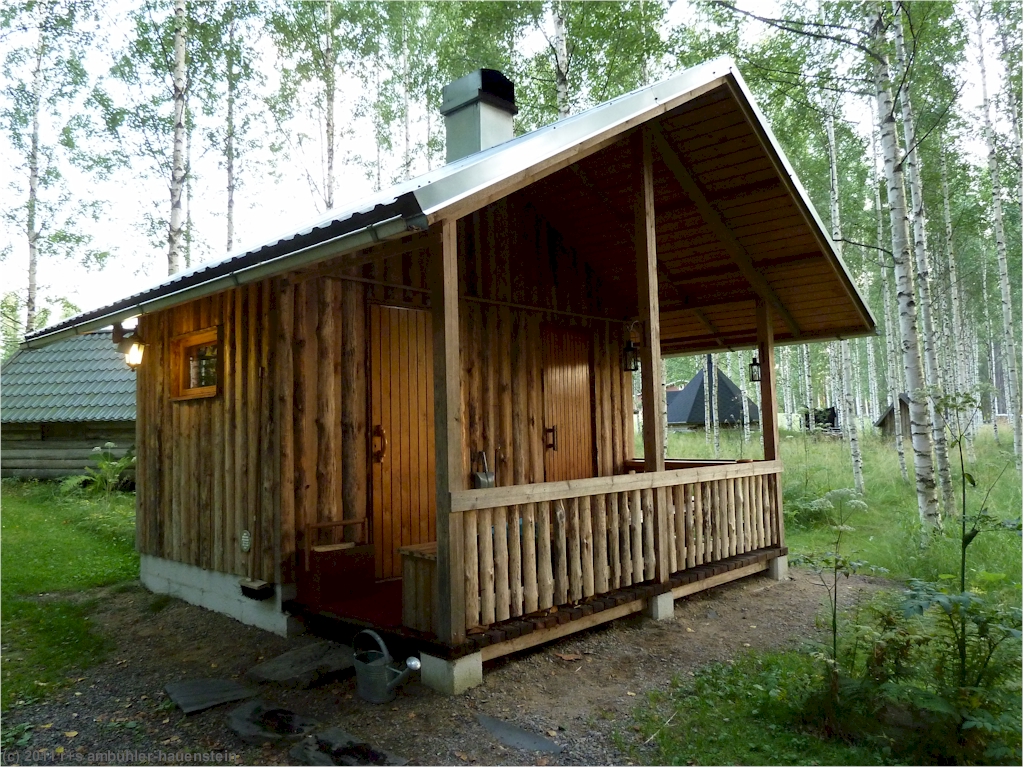 wir werden von einem sehr freundlichen platzbesitzer empfangen. ganz begeistert zeigt er uns die einrichtungen, inklusive einem kleinen unterstand mit kochherd und abwaschbecken, zwei liebevoll eingerichteten WC-häuschen mit plumpsklo, dafür ausgerüstet mit desinfektionsmittel wie in einer arztpraxis, und verschiedenen saunen. unten am see hat es zwei kleine hüttchen mit traditionellen finnischen saunen, wo die hitze mit einem holzofen erzeugt wird. daneben hat es eine elektrisch beheizte sauna wo es auch warme duschen hat. der absolute höhepunkt aber ist seine private sauna mit angrenzendem wintergarten. die sanitären einrichtungen sind vom allerfeinsten, im wintergarten steht ein grosser tisch mit stühlen, welche eine extrem hohe lehne haben, das ganze sieht aus wie eine ritter tafel. diese sauna inklusive blockhaus hat der platzbesitzer selber gebaut. sie ist noch nicht ganz fertig, aber er meint, im winter werde er dann hier mit freunden sitzen und sie werden zusammen viel schwitzen und noch mehr bier trinken ...
