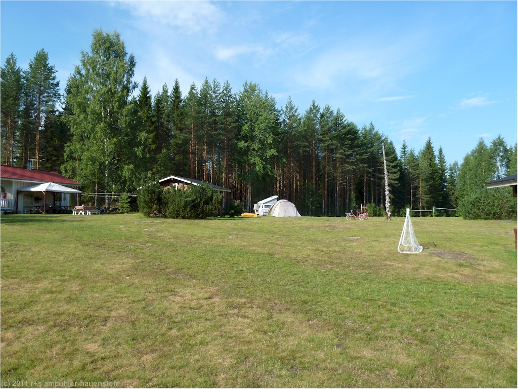 kurz vor 1600 uhr erreichen wir die kreuzung der strassen 435 und 436 in der nähe von sulkava. auf einer informationstafel versuchen wir unseren campingplatz zu finden. es stellt sich heraus, dass dieser knapp 15 km ausserhalb der stadt an einem kleinen see liegt. auf dem GPS finde ich die angegebene adresse, wir wenden und fahren zurück bis zur vorher erwähnten kreuzung. dort folgen wir der strasse 436 westwärts. knapp 1.5 km später biegen wir ab auf eine unasphaltierte strasse, welche uns mitten in einen wald hinein führt. die piste ist holprig und ziemlich staubig, nach knapp 6 km erreichen wir endlich den campingplatz.