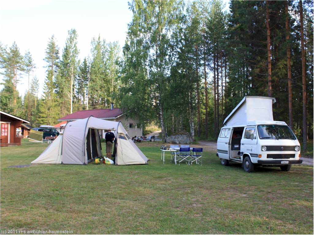 nach dem frühstück packen wir zusammen und folgen der E75 bis mikkeli, dort fahren wir erst ost- und später nordwärts. bei anttola essen wir zu mittag, gegen 1600 uhr erreichen wir unser tagesziel sulkava. wir finden einen wunderbaren campingplatz ausserhalb der stadt. nach dem einkaufen in sulkava besuchen wir zuerst die sauna, dann giessen wir das nachtessen. später jassen wir erst im freien und dann zum schutz vor den mücken in unserem camper.