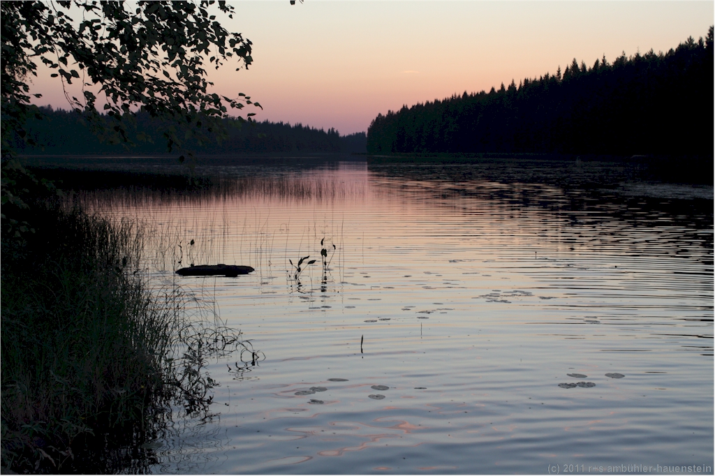 porentief-rein kehren wir zum jogi zurück. susanne kocht das abendessen, tatkräftig unterstützt von katrin. wir geniessen das nachtessen im freien, allerdings hat es ziemlich viele mücken, die sich von unseren stink-kerzen nur bedingt fernhalten lassen. dabei haben es die lästigen biester vorallem auf katrin abgesehen. während wir karten spielen wird es langsam dunkler. über dem kleinen see kaitajärvi leuchtet der himmel in fantastischen violett-tönen. statt das sich die mücken zum schlafen zurück ziehen, werden sie immer lästiger, so dass wir in unseren jogi flüchten und den jass dort fortsetzen. kurz vor mitternacht verabschieden sich katrin und mathias ins zelt, susanne und ich schlüpfen im jogi unter die bettdecke.