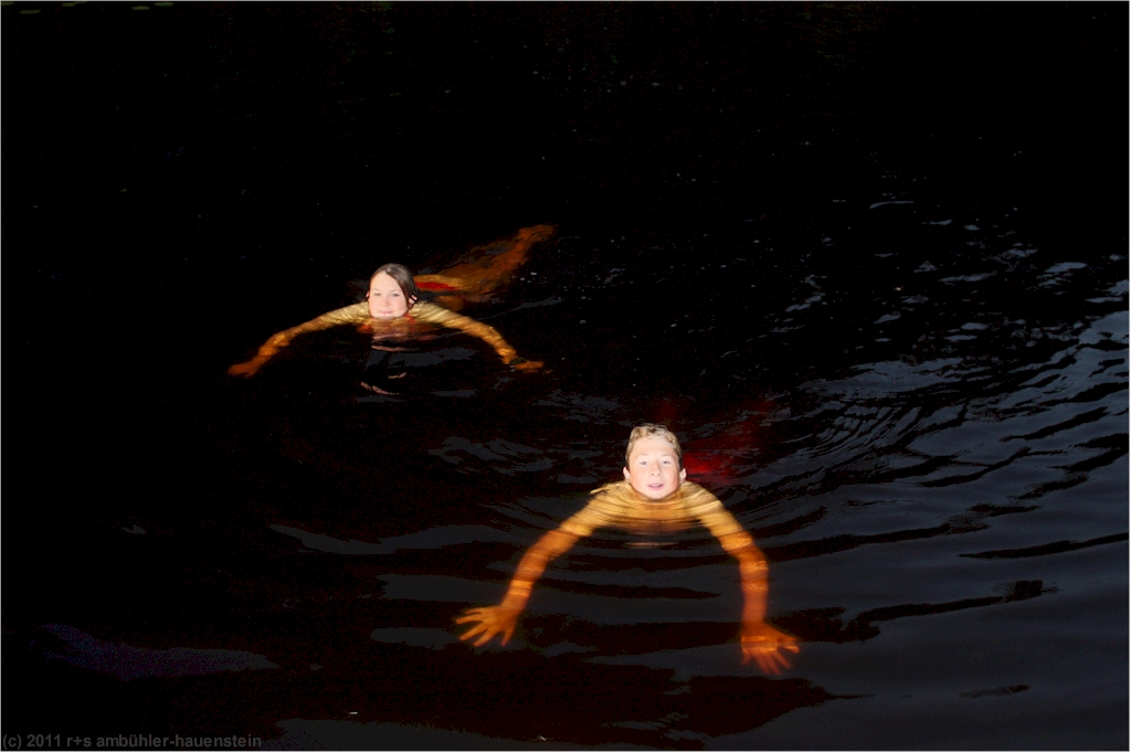 der platzbesitzer fragt uns auch, ob er für uns die sauna einheizen soll. gerne nehmen wir das angebot an. eine knappe stunde später sitzen wir schwitzend in der kleinen hütte. die kinder lassen sich dagegen nicht überreden, sie können sich nicht vorstellen, dass man es in einem raum aushalten kann, in dem eine lufttemperatur von über 70°C herrscht. beim baden im see sind sie dann aber gerne dabei. das wasser ist stark moorhaltig und deshalb ganz braun.