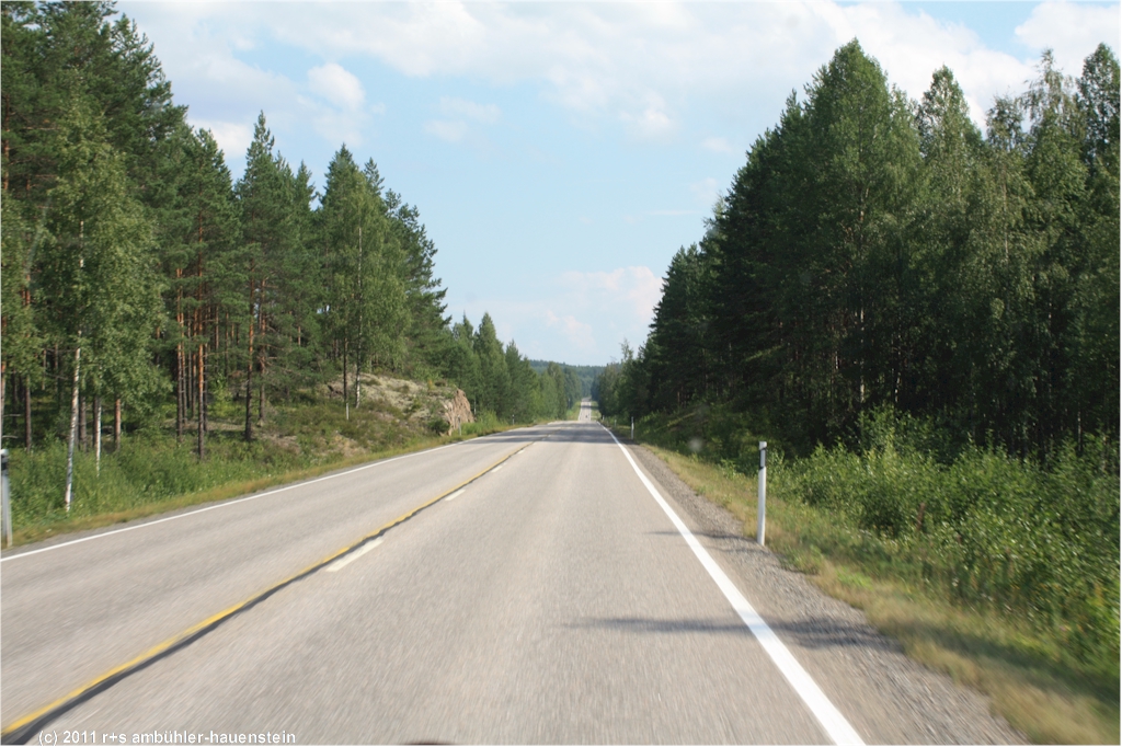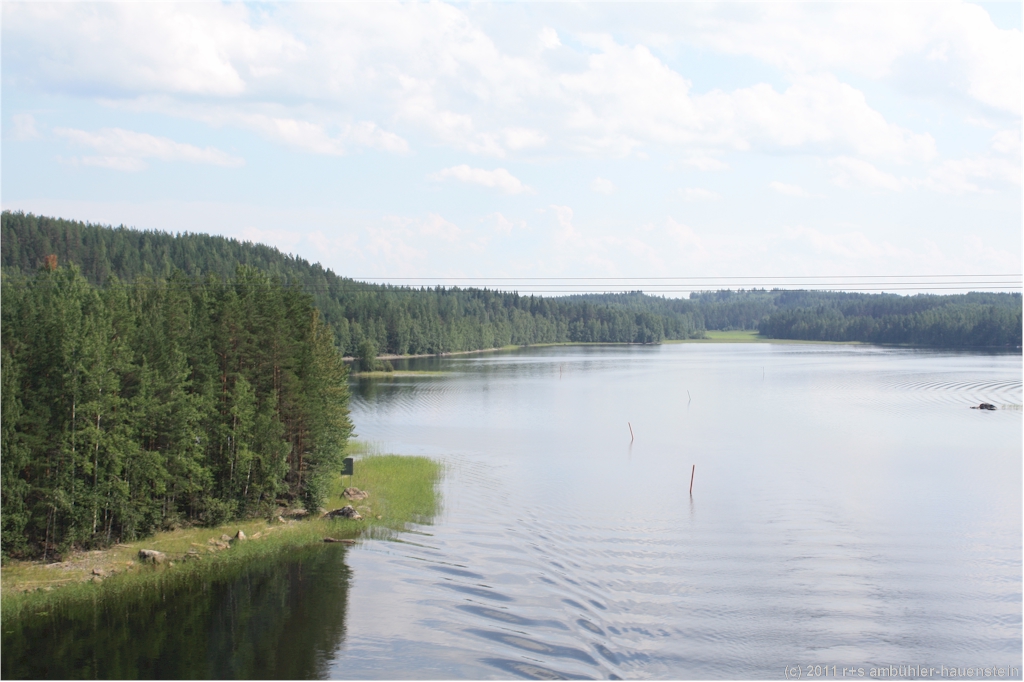 als wir gegen 0930 uhr aufstehen, ist der himmel leicht bewölkt und es ist schon ziemlich warm. wir frühstücken im freien, danach packen wir zusammen. auf der E75 fahren wir nordwärts. leider ist die schöne autobahn bald zu ende und es folgt eine baustelle nach der anderen. entsprechend herrscht dichter verkehr und die geschwindigkeit ändert laufend. am südlichen stadtrand von mikkeli verlassen wir die hauptroute und folgen der landstrasse 62 in südöstlicher richtung. hier sind wir fast alleine unterwegs, so macht das autofahren deutlich mehr spass.