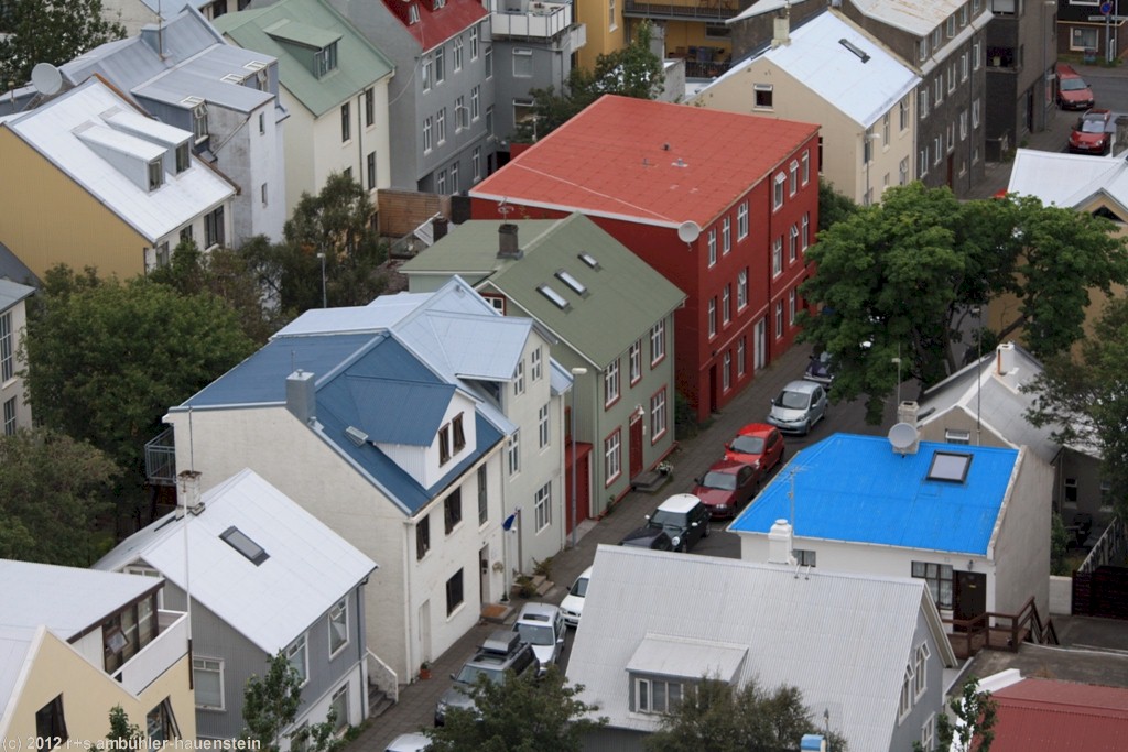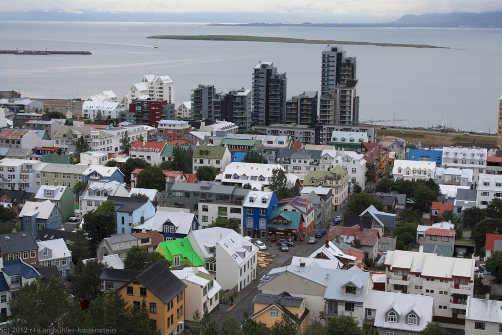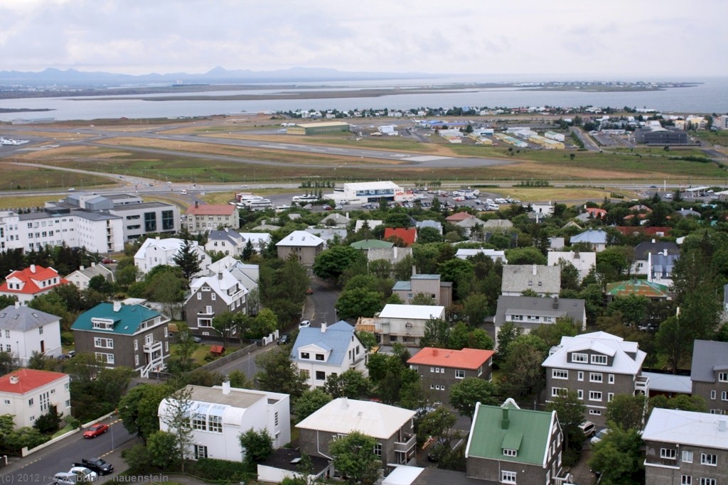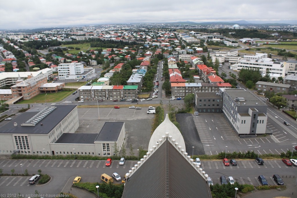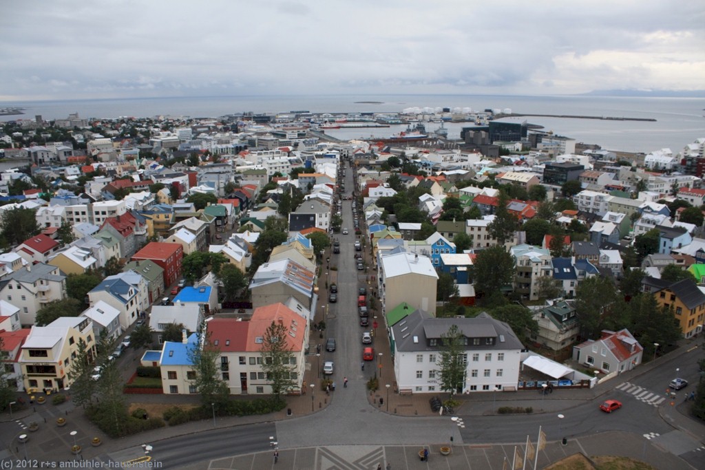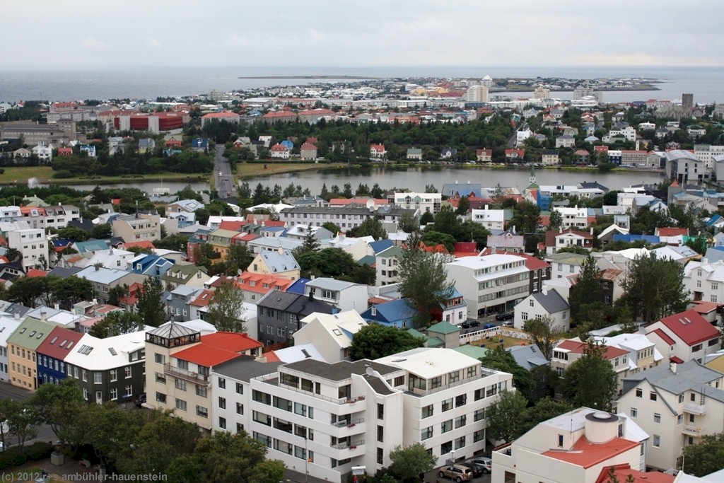 von der aussichtsplattform auf dem kirchentrum hat man eine spektakuläre aussicht auf islands hauptstadt. blickt man richtung norden, sieht man einen teil des stadtzentrums und den hafen mit dem kongress- und kulturzentrum harpa. im osten fallen vorallem die drei unterschiedlich hohen wohntürme unten am wasser auf - vermutlich eine sehr teure wohnlage. im süden befindet sich der flughafen, welcher seit der eröffnung des internationalen airports in keflavik zum nationalen flughafen zurückgestuft wurde. im nordwesten liegt das eigentliche stadtzentrum. reykjavik ist eine sehr bunte stadt, manche häuser haben sehr leuchtende farben. abgesehen von den drei bereits erwähnten wohnhäuser gibt es in dieser stadt keine hochhäuser, grossstadtgefühle kommen bei knapp 120'000 einwohner nicht auf.