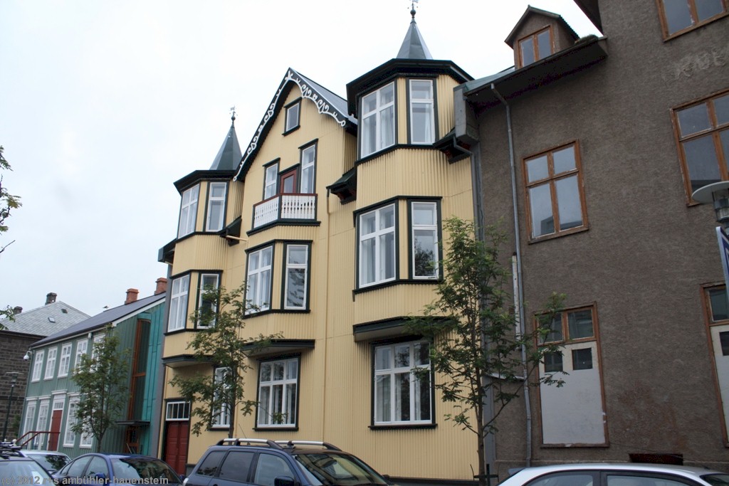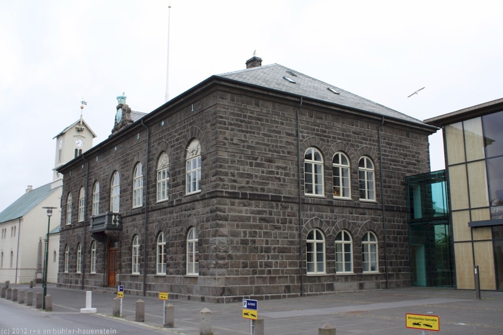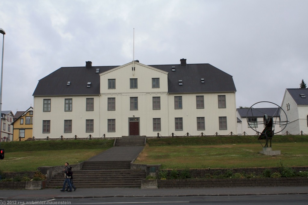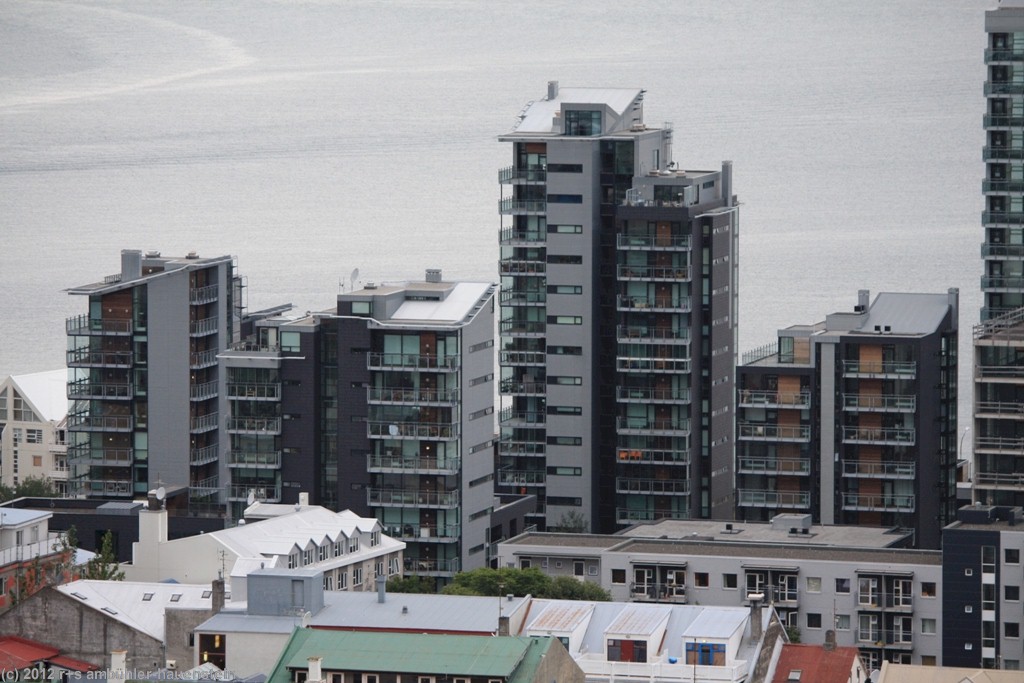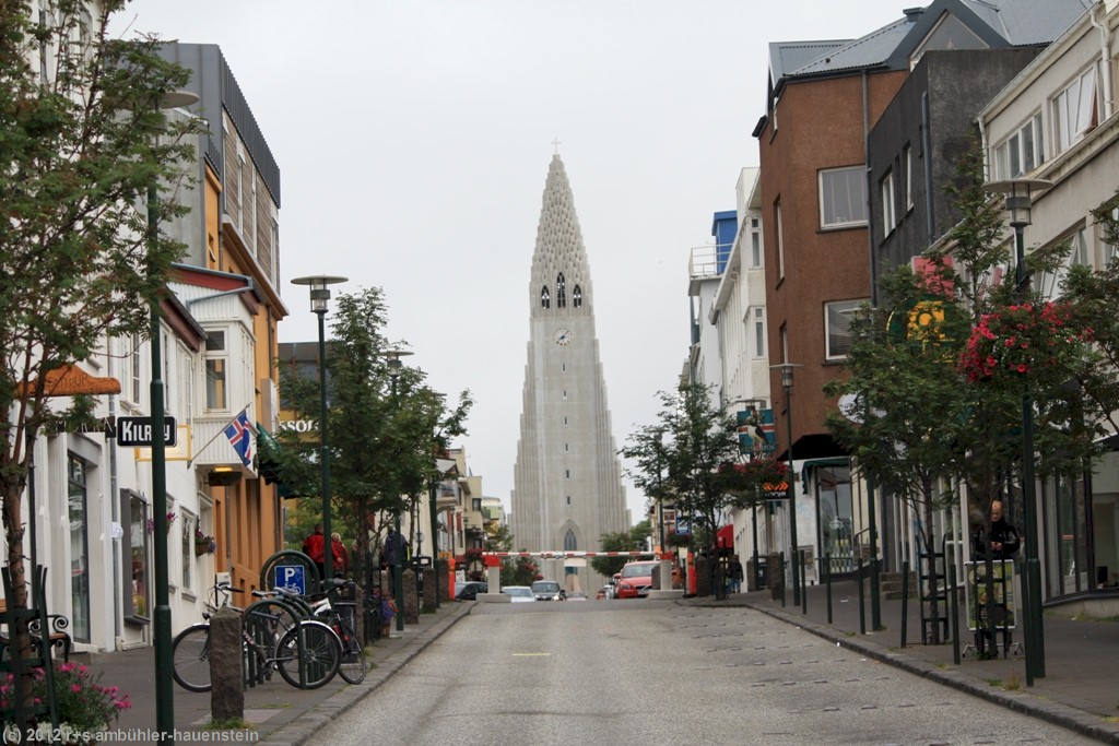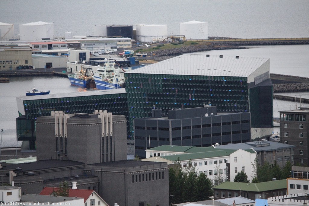 von der aussichtsplattform auf dem kirchentrum hat man eine spektakuläre aussicht auf islands hauptstadt. blickt man richtung norden, sieht man einen teil des stadtzentrums und den hafen mit dem kongress- und kulturzentrum harpa. im osten fallen vorallem die drei unterschiedlich hohen wohntürme unten am wasser auf - vermutlich eine sehr teure wohnlage. im süden befindet sich der flughafen, welcher seit der eröffnung des internationalen airports in keflavik zum nationalen flughafen zurückgestuft wurde. im nordwesten liegt das eigentliche stadtzentrum. reykjavik ist eine sehr bunte stadt, manche häuser haben sehr leuchtende farben. abgesehen von den drei bereits erwähnten wohnhäuser gibt es in dieser stadt keine hochhäuser, grossstadtgefühle kommen bei knapp 120'000 einwohner nicht auf.