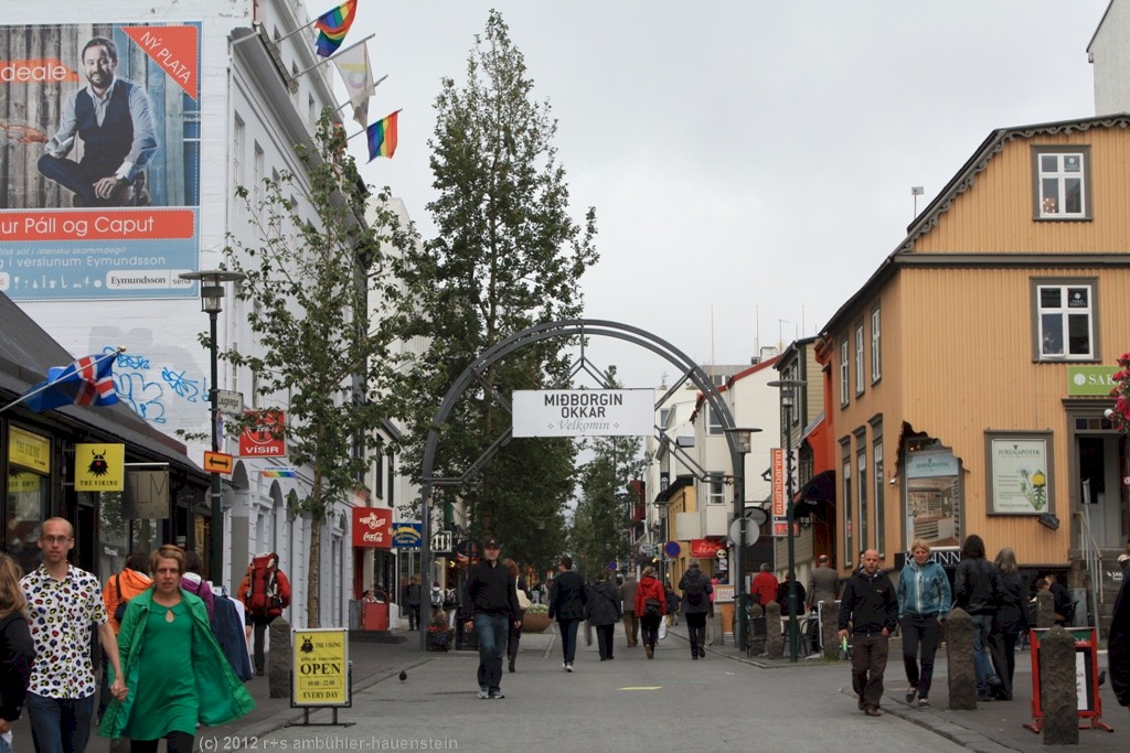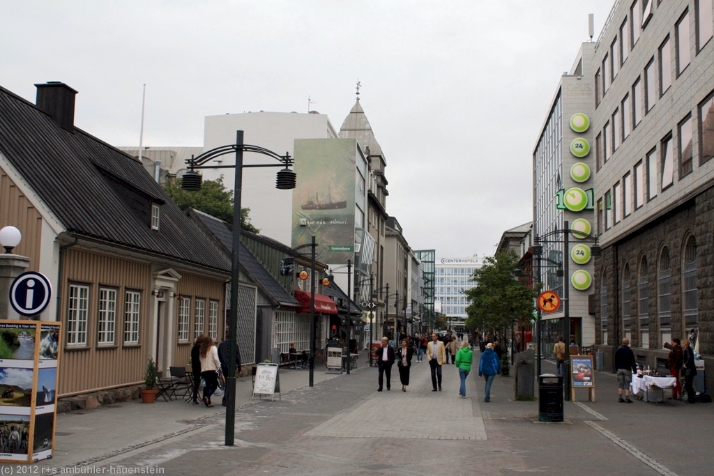 über die laekjargata gelangen wir auf die autofreie skolavordustigur und folgen dieser richtung hallgrimskirkja, der sehr markanten kirche auf einer anhöhe im osten des stadtzentrums. in der fussgängerzone hat es zahlreiche restaurants und läden, in einem innenhof spielt eine band.