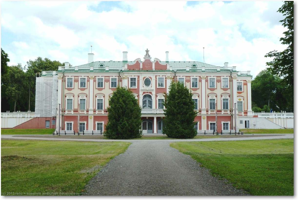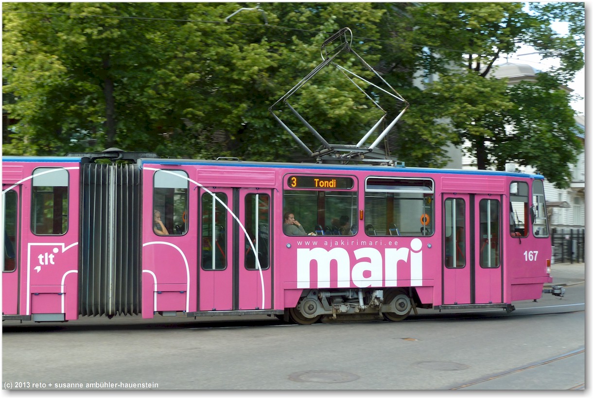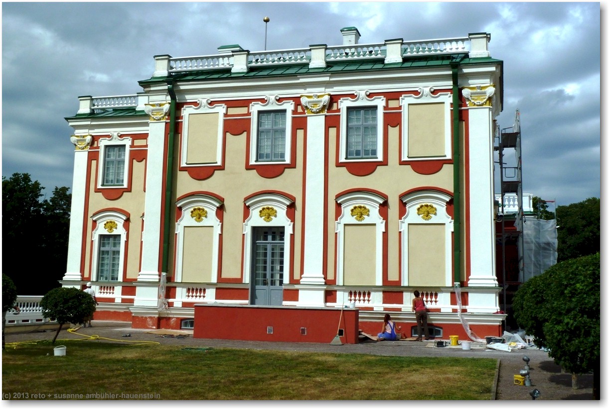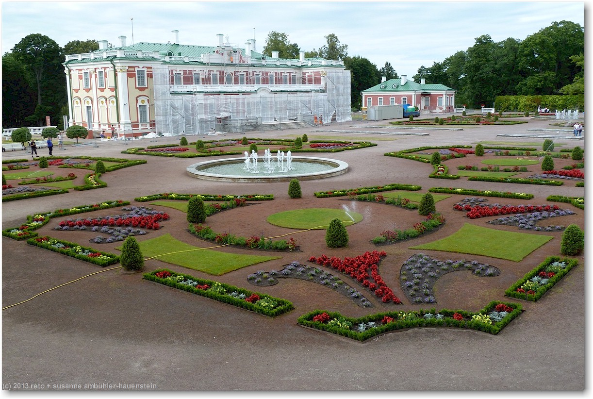 mit einem recht altmodischen tram fahren wir zum kadrioru park. den fahrpreis kann man bei der chauffeuse bezahlen, indem man das geld in einen kippbaren behälter legt. sie legt dann die fahrkarten in den behälter. nach wenigen minuten erreichen wir die endstation. vorbei an einem künstlichen see und durch einen hübschen park gelangen wir zu einem prächtigen rosengarten. das schloss - welches heute als kunstmuseum dient - befindet sich auf der andere strassenseite und wird gerade renoviert. die fassaden sind teilweise eingepackt, aber der schlossgarten wirkt sehr hübsch. im vergleich zur sommerresidenz in sankt petersburg wirkt dieses schloss allerdings äusserst bescheiden, siehe tagebuch vom 22-jul-2011. durch den schlosspark gelangen wir zur tramhaltestelle zurück, aber wir wollen die knapp 2 km zum hotel zu fuss zurücklegen. das aussenquartier, durch das wir gehen, ist etwas weniger herausgeputzt als die touristische altstadt. die häuser sind teilweise noch aus holz, aber im gegensatz zu den hinterhöfen in sankt petersburg herrscht hier überall ordnung und es wirkt alles gepflegt. dies gilt ganz besonders auch für die autos, die vor den häusern stehen, man sieht keine klapprigen kisten auf den strassen.