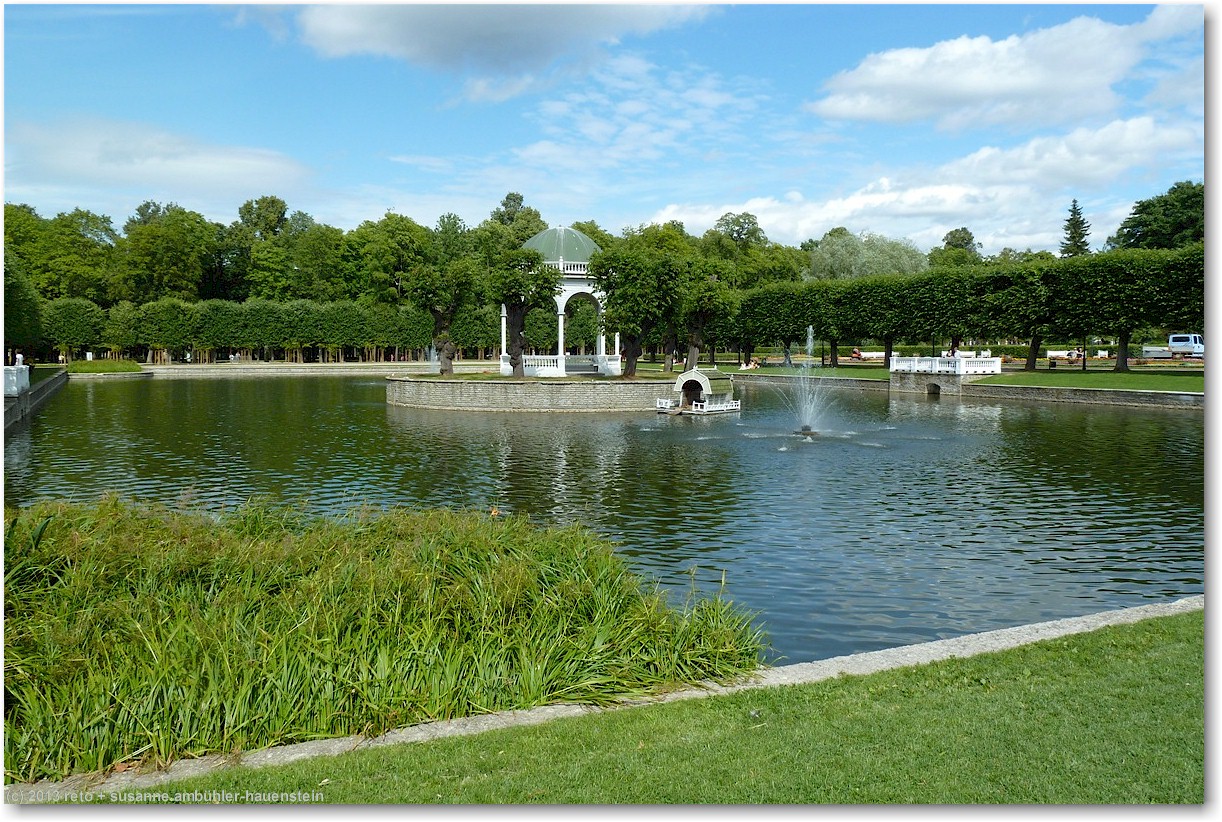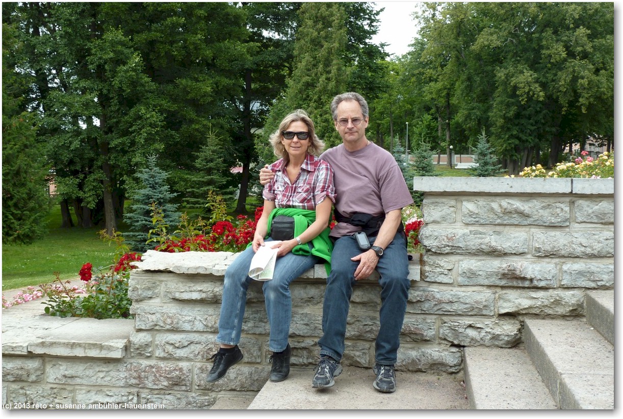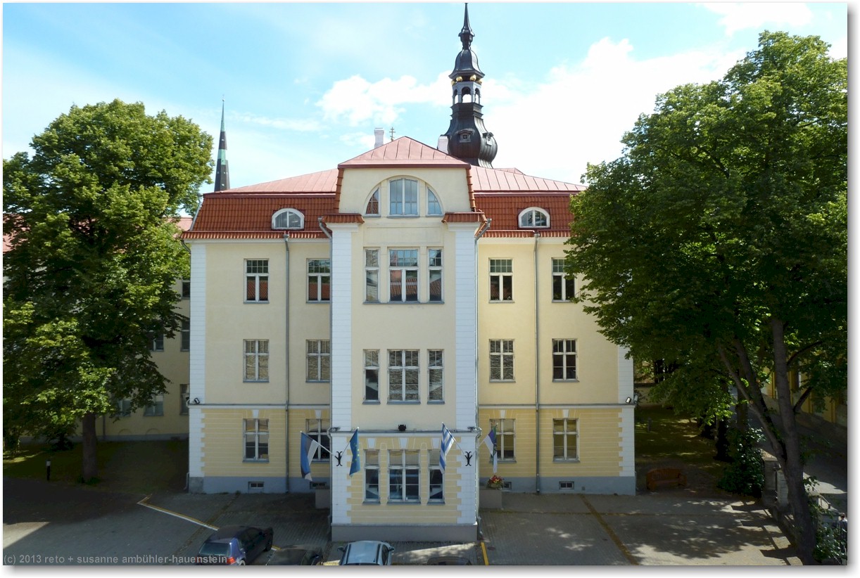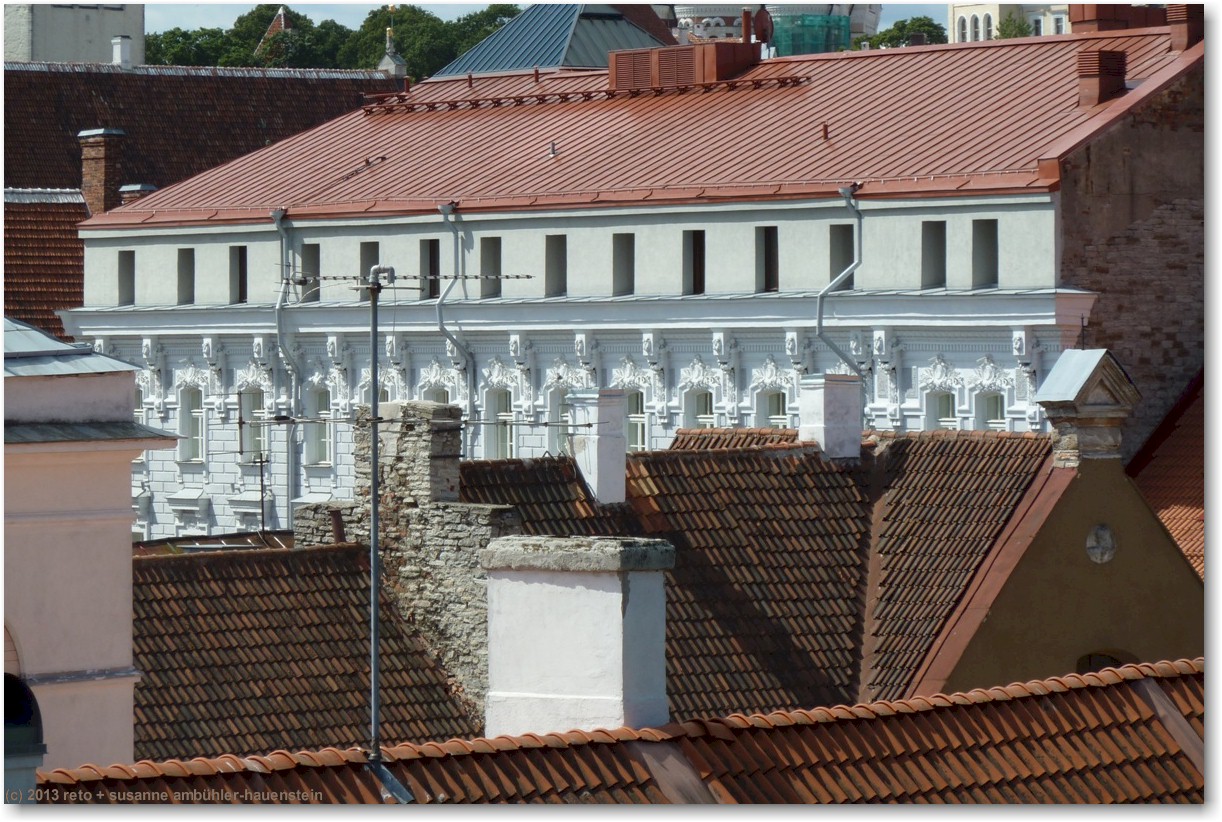mit einem recht altmodischen tram fahren wir zum kadrioru park. den fahrpreis kann man bei der chauffeuse bezahlen, indem man das geld in einen kippbaren behälter legt. sie legt dann die fahrkarten in den behälter. nach wenigen minuten erreichen wir die endstation. vorbei an einem künstlichen see und durch einen hübschen park gelangen wir zu einem prächtigen rosengarten. das schloss - welches heute als kunstmuseum dient - befindet sich auf der andere strassenseite und wird gerade renoviert. die fassaden sind teilweise eingepackt, aber der schlossgarten wirkt sehr hübsch. im vergleich zur sommerresidenz in sankt petersburg wirkt dieses schloss allerdings äusserst bescheiden, siehe tagebuch vom 22-jul-2011. durch den schlosspark gelangen wir zur tramhaltestelle zurück, aber wir wollen die knapp 2 km zum hotel zu fuss zurücklegen. das aussenquartier, durch das wir gehen, ist etwas weniger herausgeputzt als die touristische altstadt. die häuser sind teilweise noch aus holz, aber im gegensatz zu den hinterhöfen in sankt petersburg herrscht hier überall ordnung und es wirkt alles gepflegt. dies gilt ganz besonders auch für die autos, die vor den häusern stehen, man sieht keine klapprigen kisten auf den strassen.