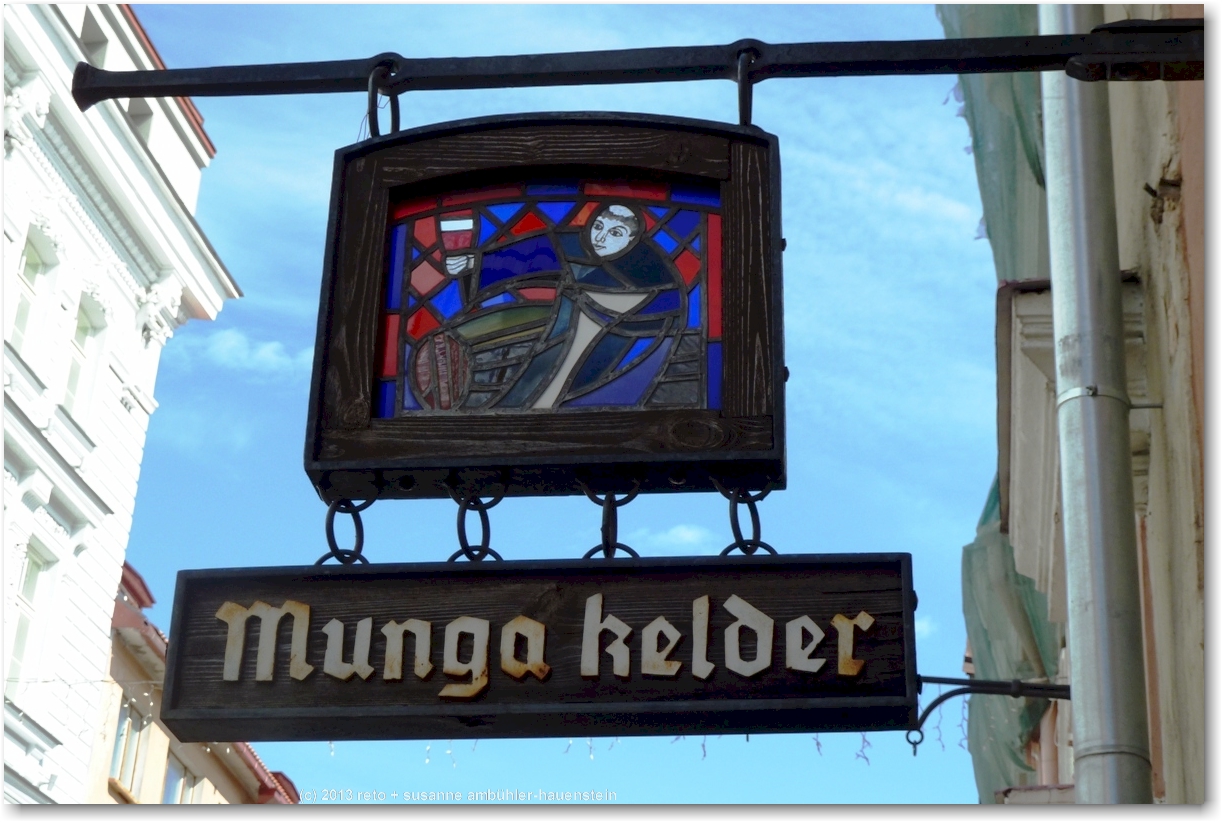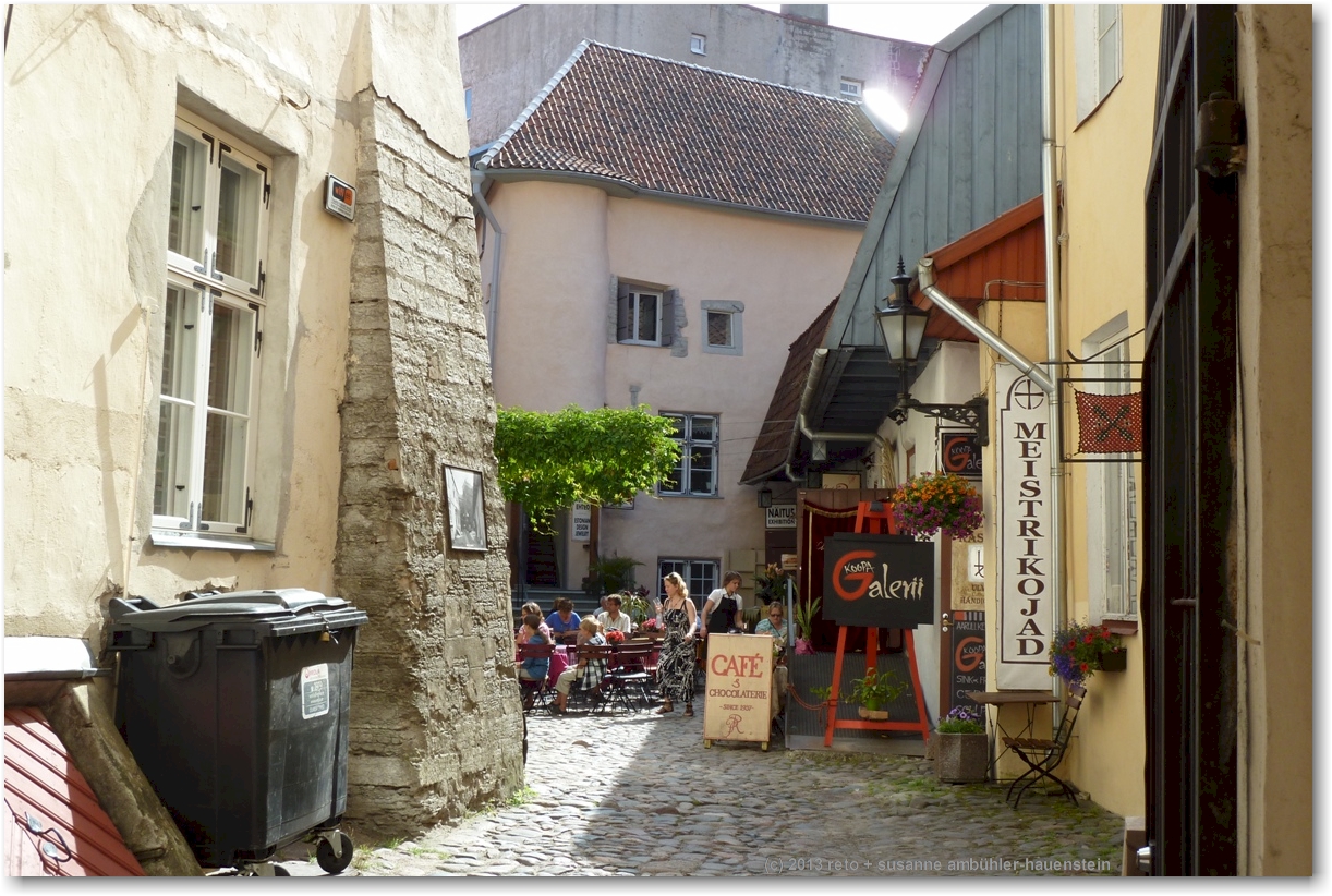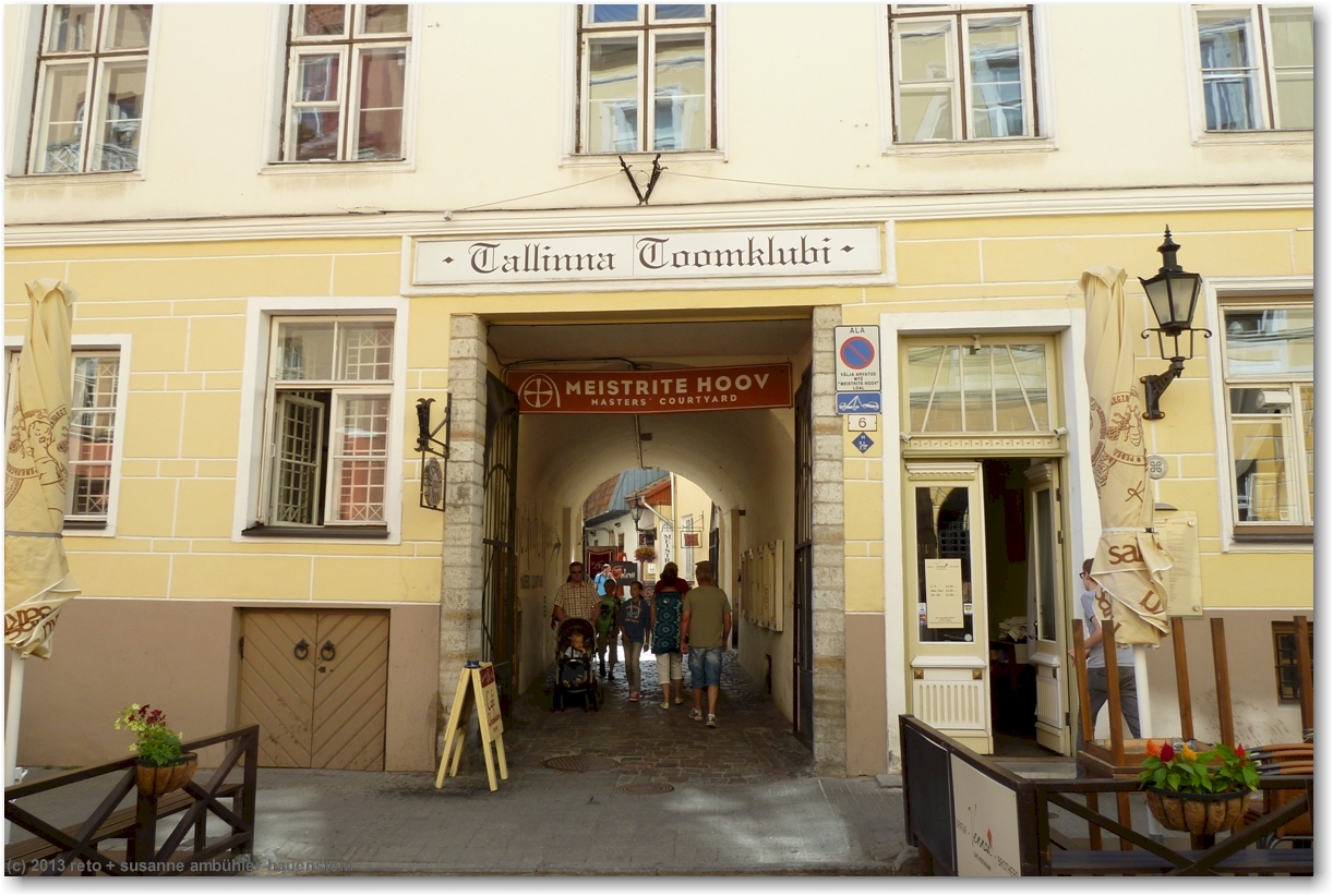 wir folgen der viru bis zur vene und biegen dort rechts ab. durch einen schmalen durchgang gelangen wir in den "hof der meister". hier hat es verschiedene läden mit kunsthandwerk und ein cafe mit verschiedenen schokoladen. so kurz nach dem frühstück haben wir keine lust auf süsses, wir werden am nachmittag nochmals hierher kommen. etwas weiter gibt es einen weiteren durchgang mit grabsteinen an der mauer der ruine der bremeni kaik.