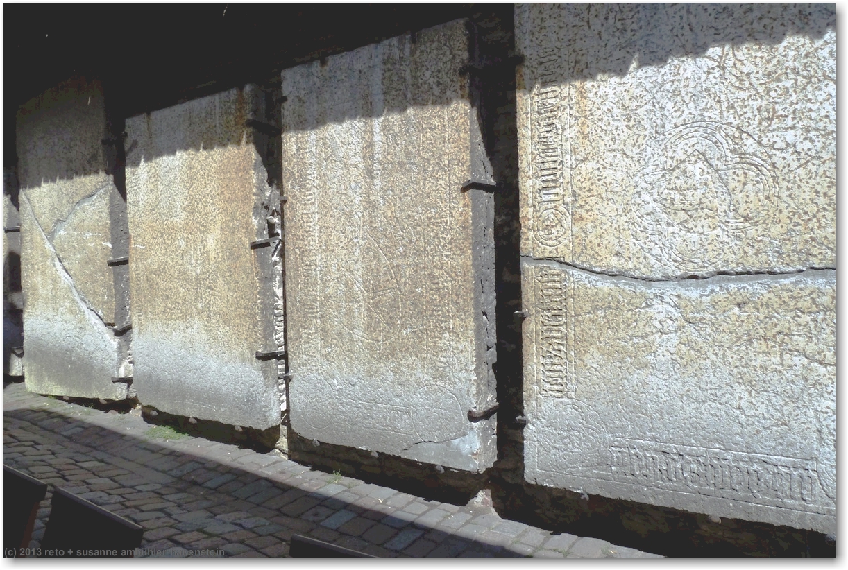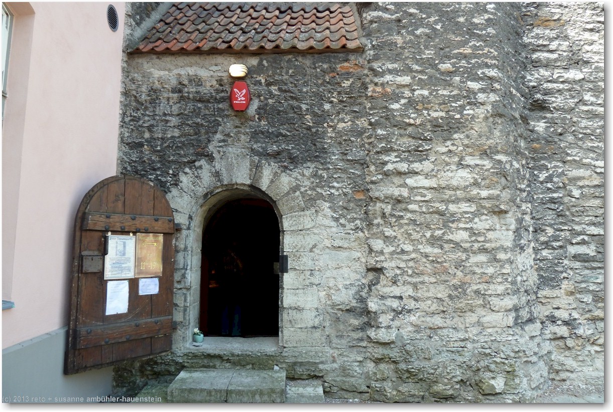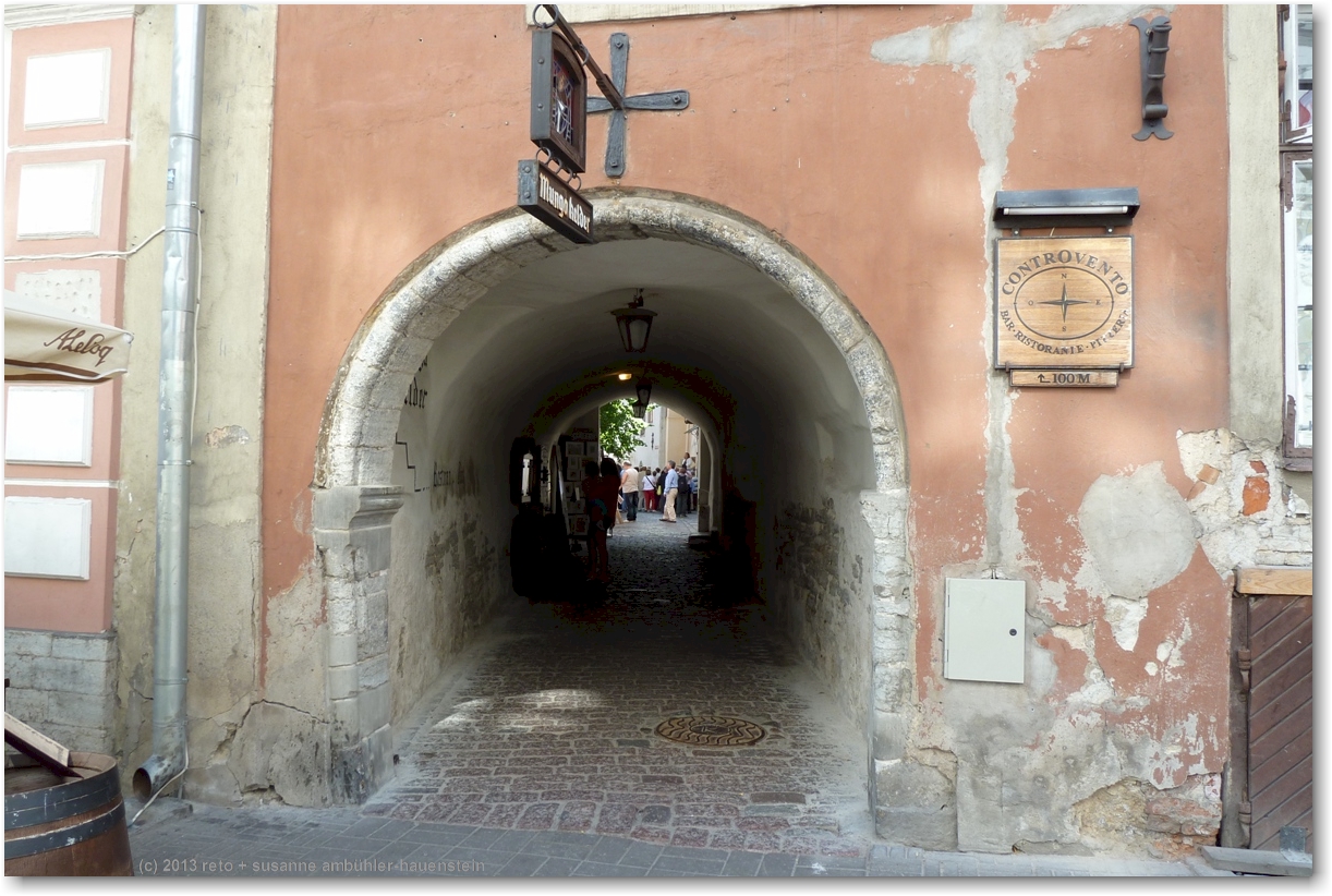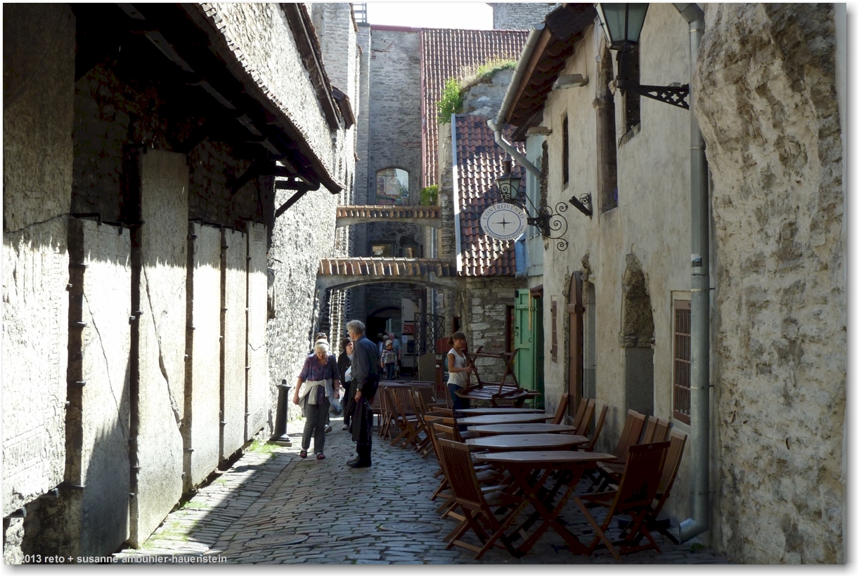 wir folgen der viru bis zur vene und biegen dort rechts ab. durch einen schmalen durchgang gelangen wir in den "hof der meister". hier hat es verschiedene läden mit kunsthandwerk und ein cafe mit verschiedenen schokoladen. so kurz nach dem frühstück haben wir keine lust auf süsses, wir werden am nachmittag nochmals hierher kommen. etwas weiter gibt es einen weiteren durchgang mit grabsteinen an der mauer der ruine der bremeni kaik.