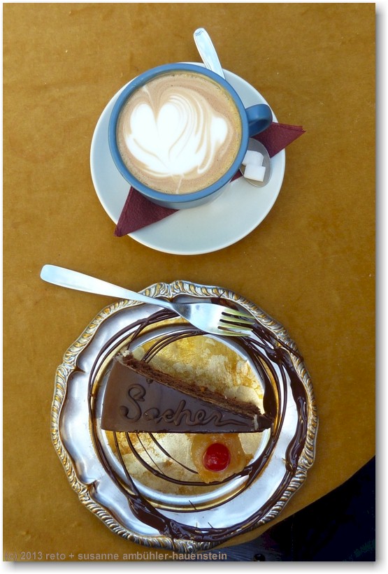 inzwischen ist es mittag geworden und wir haben hunger. in einem lebensmittelgeschäft im einkaufszentrum neben unserem hotel kaufen wir uns einen salat, brot und käse und geniessen unsere sandwiches im tammsaare park. während dem essen werden wir von zahlreichen vögeln, vorallem den überall präsenten tauben, regelrecht belagert. nach dem essen gehen wir kurz aufs hotelzimmer und danach zurück in die altstadt. bei meisterhof geniessen wir einen herrlichen kaffee - mit kunstvollem herz in der milch - und ich ein wunderbares stück sachertorte (siehe bild oben).