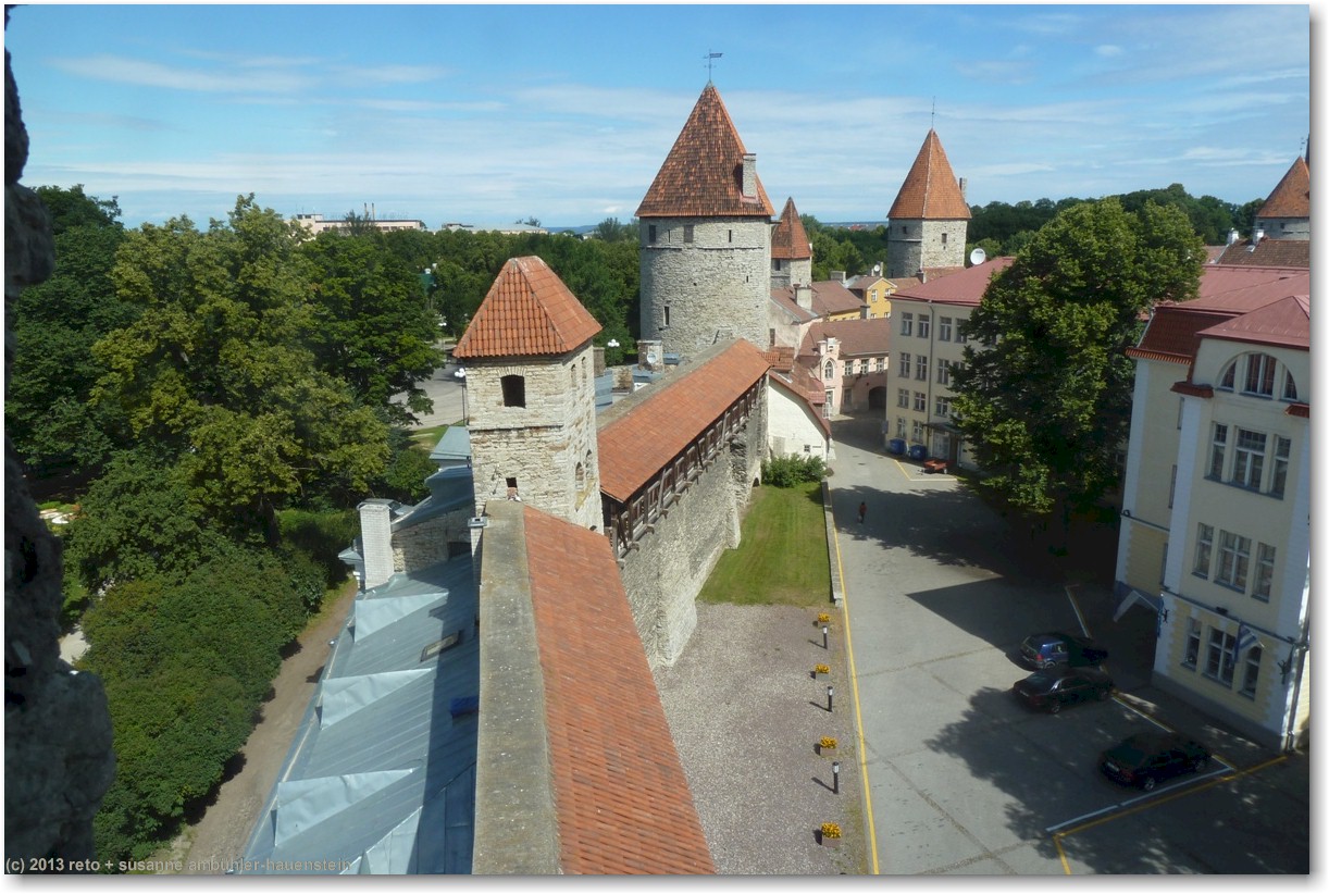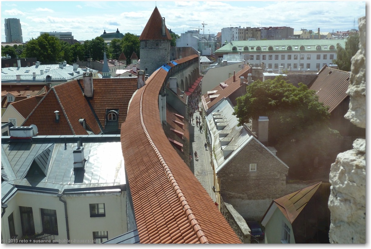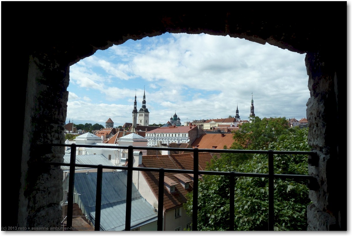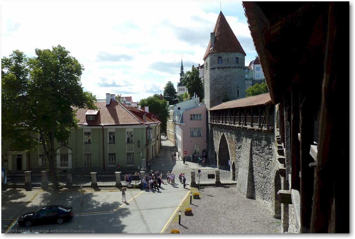 nun führt uns susanne zum nunna torn, in diesem turm gelangen wir auf die stadtmauer. diese ist allerdings nur noch bruchstückweise erhalten, so dass man nur bis zum übernächsten turm gelangt. auf der linken seite erkennen wir durch die schiesscharten den park tomide väljak, dahinter befindet sich der zentralbahnhof. auf der rechten seite haben wir einen wunderbaren ausblick auf die stadt. in den türmen nisten tauben, entsprechend duftet es auch.