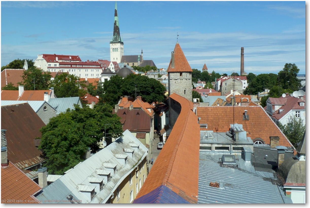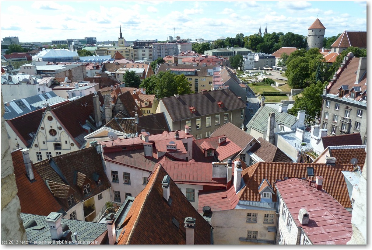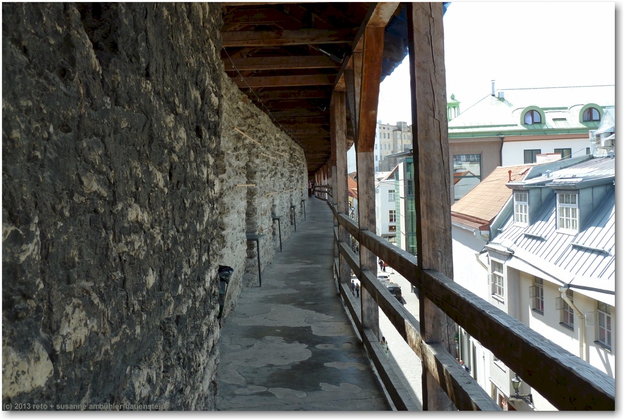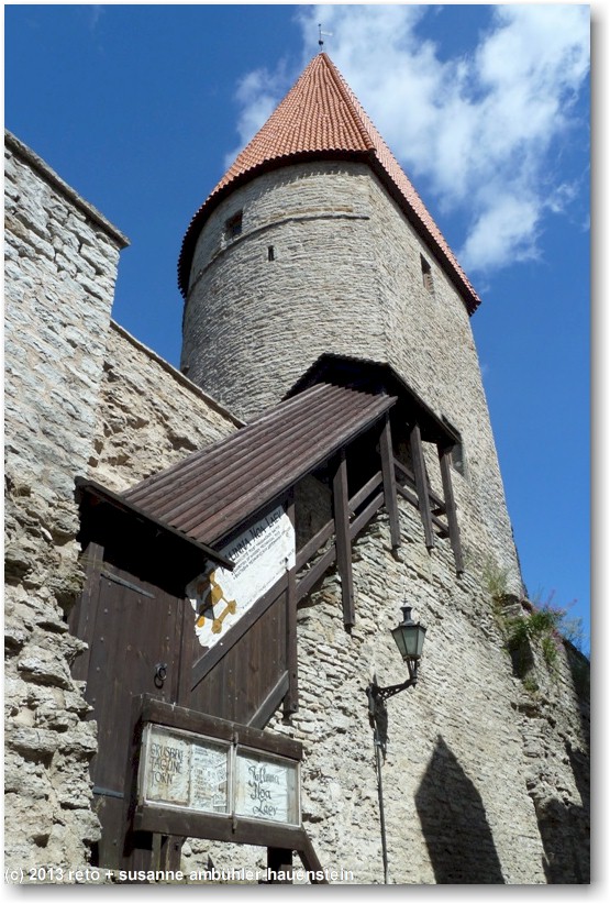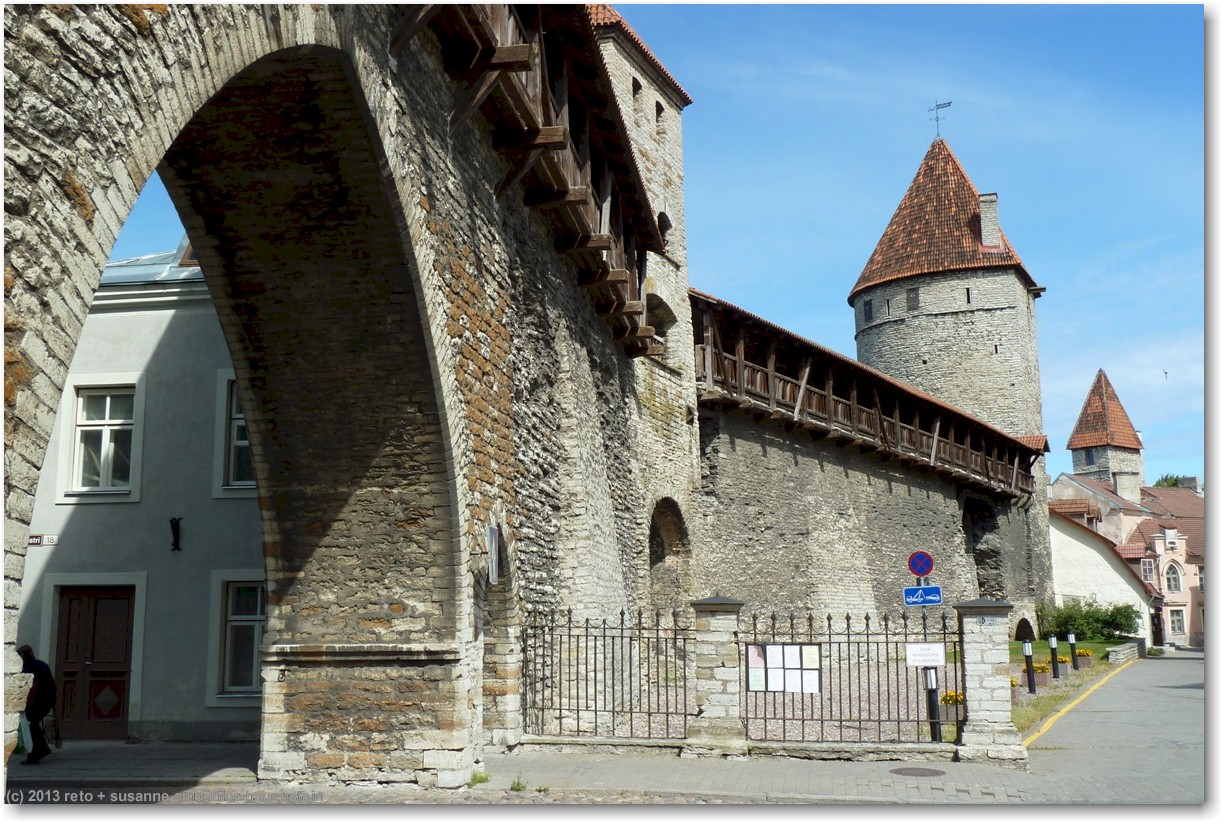 nun führt uns susanne zum nunna torn, in diesem turm gelangen wir auf die stadtmauer. diese ist allerdings nur noch bruchstückweise erhalten, so dass man nur bis zum übernächsten turm gelangt. auf der linken seite erkennen wir durch die schiesscharten den park tomide väljak, dahinter befindet sich der zentralbahnhof. auf der rechten seite haben wir einen wunderbaren ausblick auf die stadt. in den türmen nisten tauben, entsprechend duftet es auch.