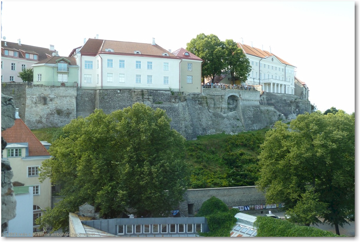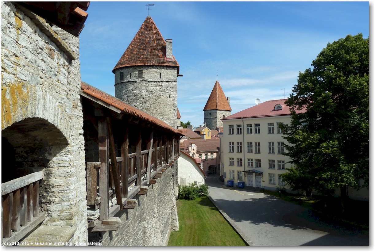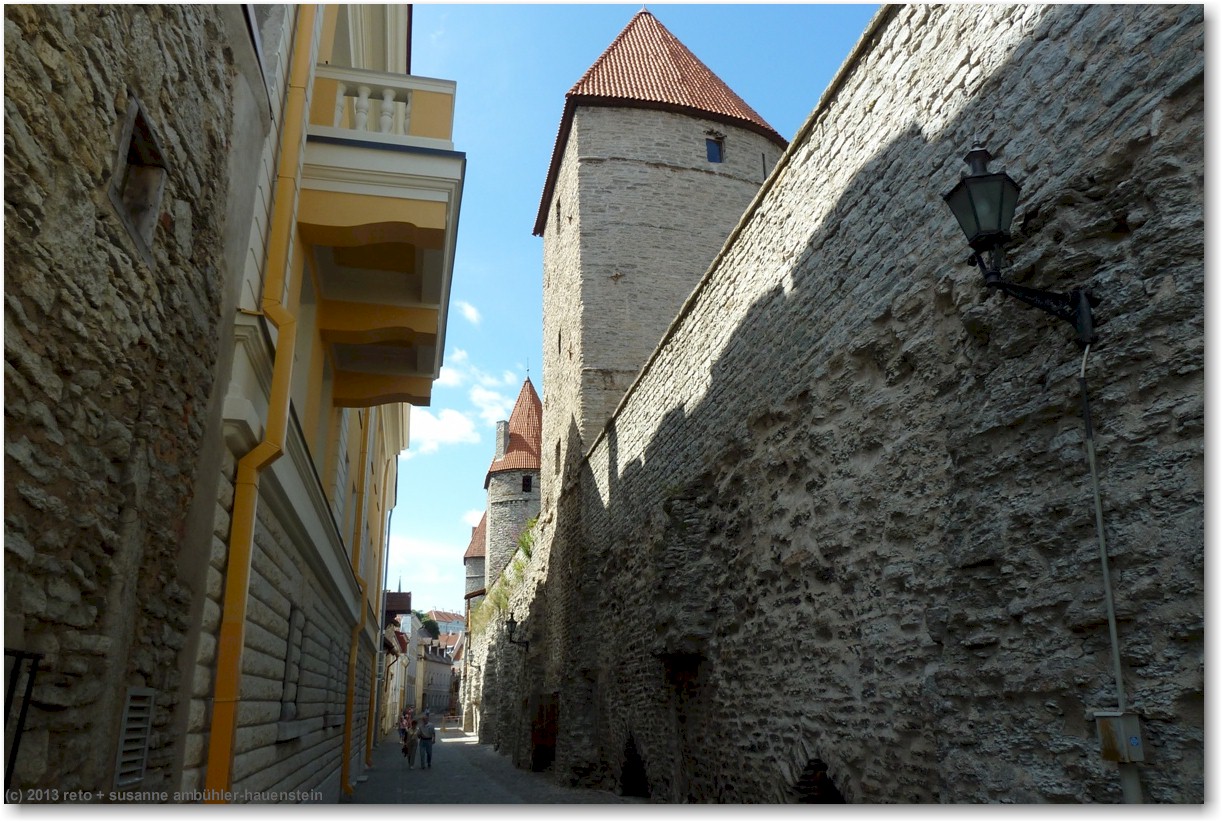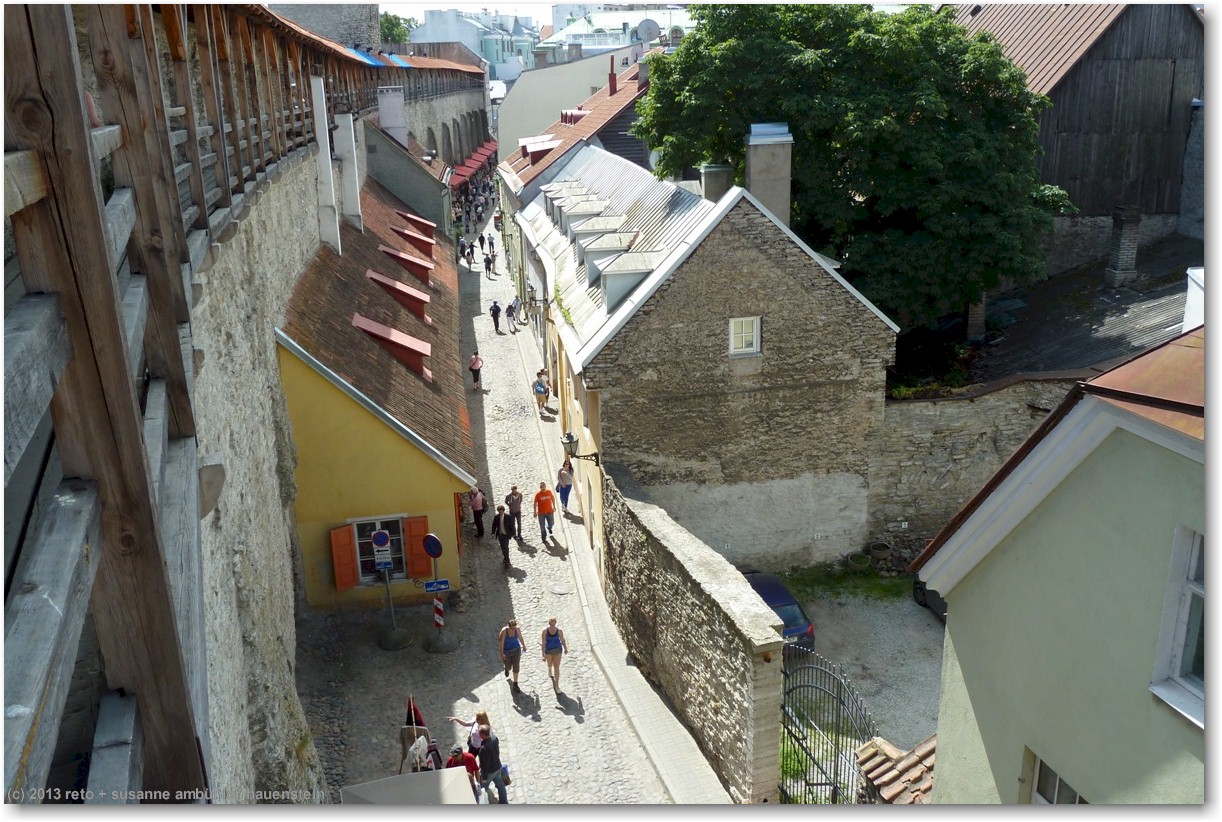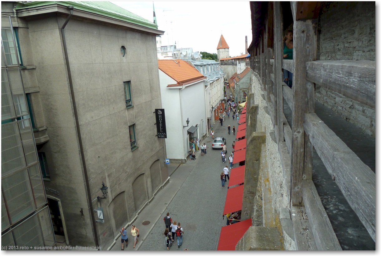 wir durchqueren die altstadt und erklimmen auf der anderen seite ein weiteres stück stadtmauer. vom helleman torn haben wir wiederum einen fantastischen ausblick auf die stadt und den hoch auf dem hügel thronende dom sowie das mächtige regierungsgebäude. der steg auf der stadtmauer führt uns bis zum munk ade tagune torn. dieser turm wurde sehr schön ausgebaut, es gibt auf zwei etagen ausstellungen von künstlern. unter uns befindet sich die schmale müürivahe, im schatten der stadtmauer werden an zahlreichen ständen kleider angeboten, unter anderem solche aus leinen, dies scheint typisch estnisches handwerk zu sein.