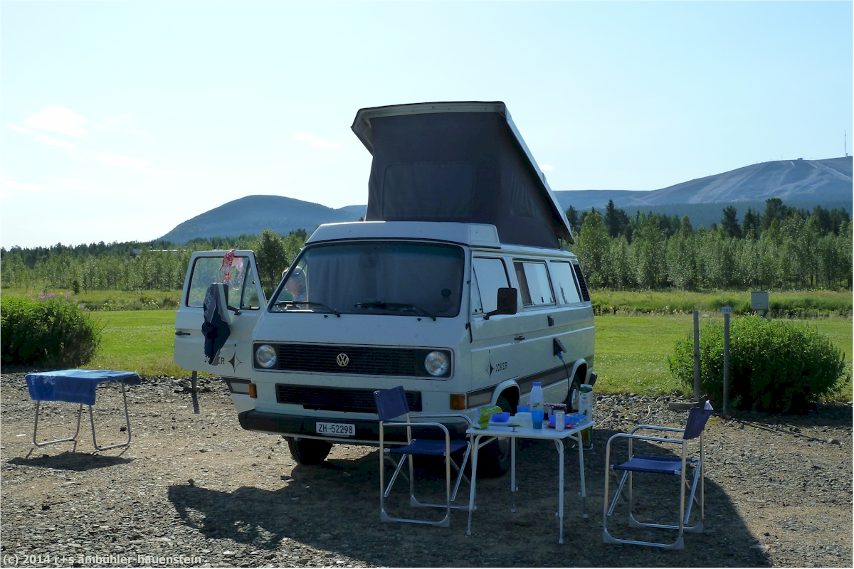 um 17:40 uhr sind wir wieder in äkäslompolo. in nahen supermarkt kaufen wir noch einige lebensmittel ein, dann kehren wir auf den campingplatz zurück. das nachtessen geniessen wir wie üblich im freien, nach dem abwaschen setzen wir uns in die sauna. den abend verbringen wir im jogi und planen die weiterreise. noch vor mitternacht sind wir im bett.