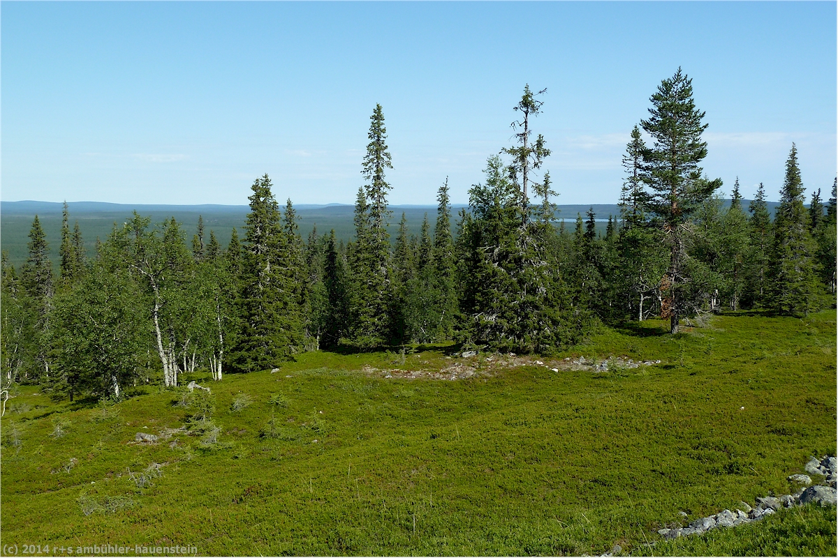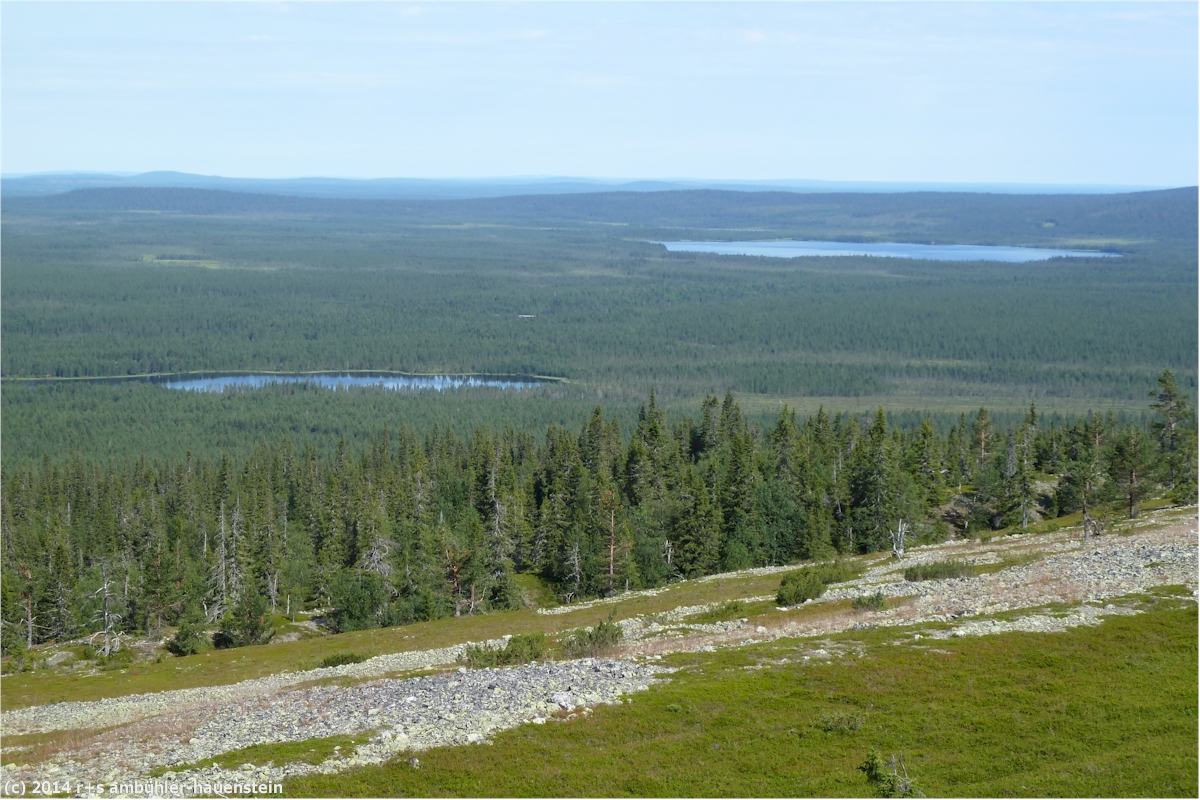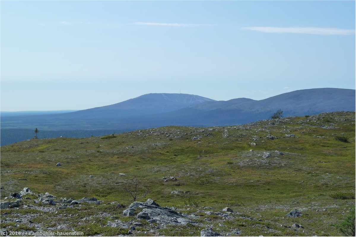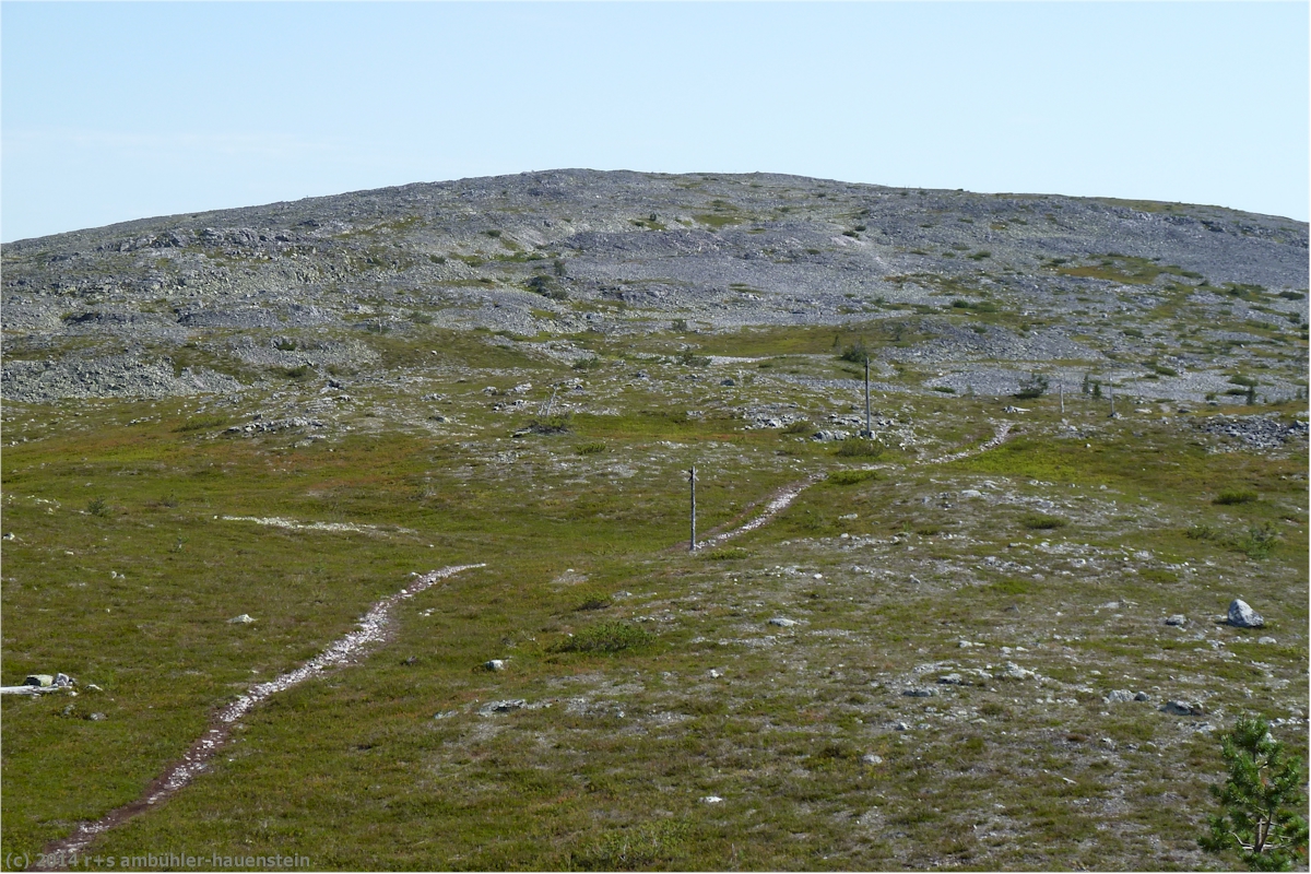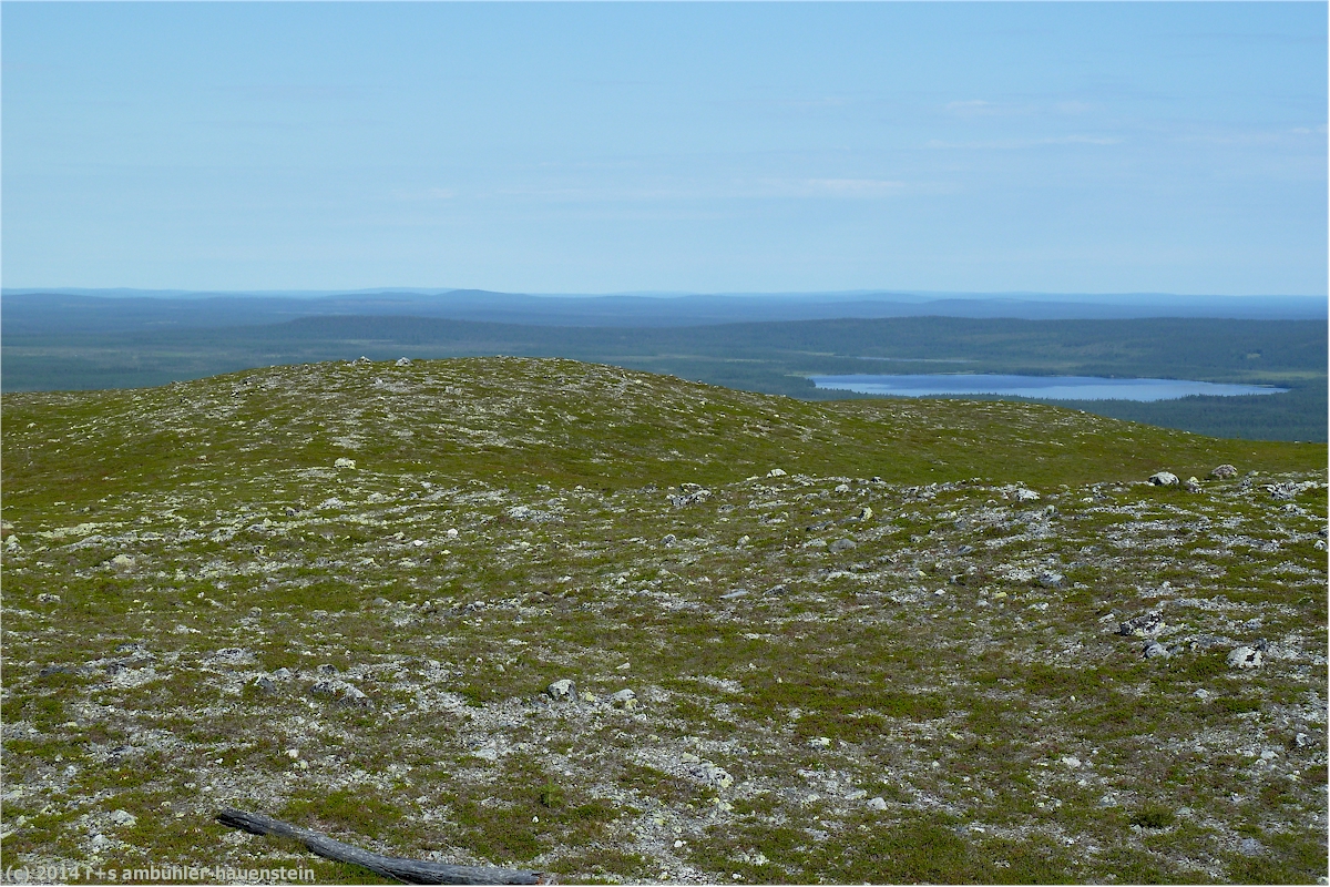 nach etwa 1.5 stunden scheint uns, wir nähern uns dem 565 meter hohen gipfel des pallilaki, doch das täuscht enorm ! auch dieser berg hat einen sehr, sehr flachen "gipfel", immer wenn es scheint, wir hätten den höchsten punkt erreicht, kommt dahinter ein neuer "gpfel" zum vorschein. um 13:40 uhr stehen wir dann endlich auf dem höchsten punkt, der einmal mehr nur am grossen steinhaufen zu erkennen ist. wir essen bei wunderbarem wetter zu mittag und geniessen die fantastische aussicht. im nordosten erkennen wir das skigebiet von levi, richtung süden hat es ausgedehnte sümpfe.