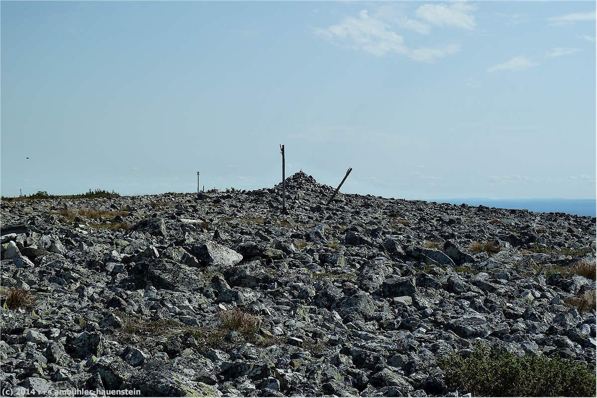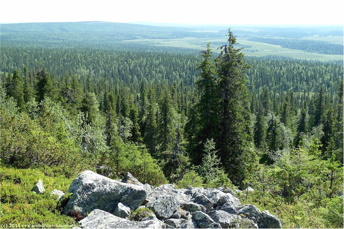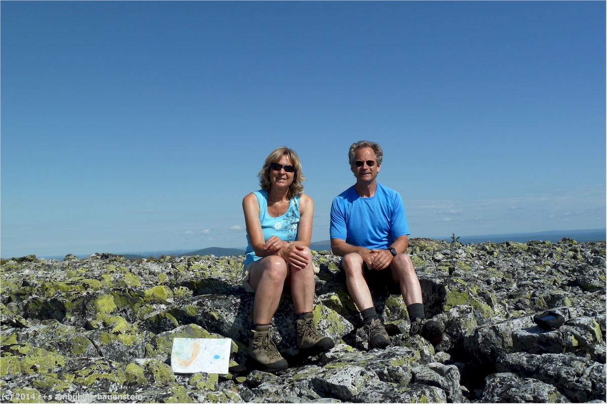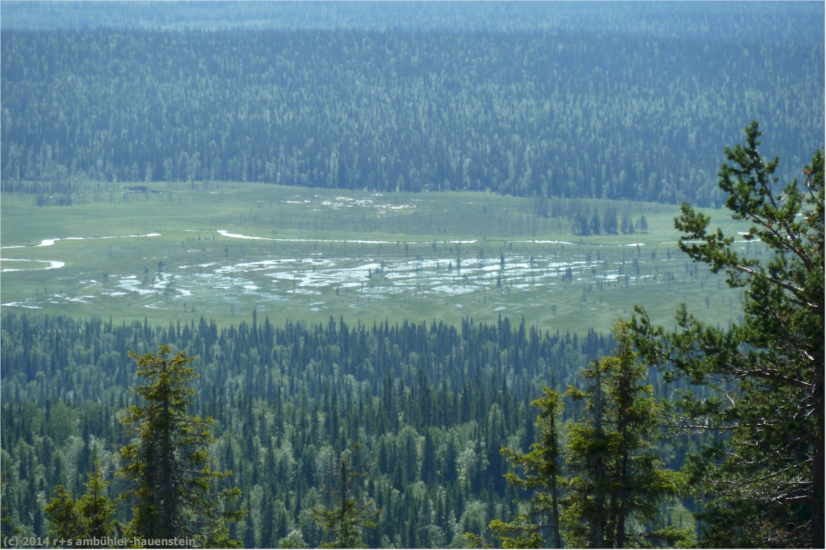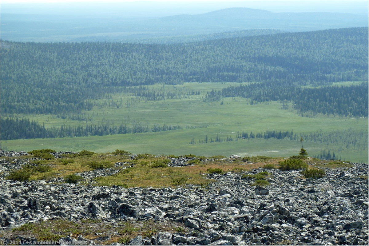 nach etwa 1.5 stunden scheint uns, wir nähern uns dem 565 meter hohen gipfel des pallilaki, doch das täuscht enorm ! auch dieser berg hat einen sehr, sehr flachen "gipfel", immer wenn es scheint, wir hätten den höchsten punkt erreicht, kommt dahinter ein neuer "gpfel" zum vorschein. um 13:40 uhr stehen wir dann endlich auf dem höchsten punkt, der einmal mehr nur am grossen steinhaufen zu erkennen ist. wir essen bei wunderbarem wetter zu mittag und geniessen die fantastische aussicht. im nordosten erkennen wir das skigebiet von levi, richtung süden hat es ausgedehnte sümpfe.