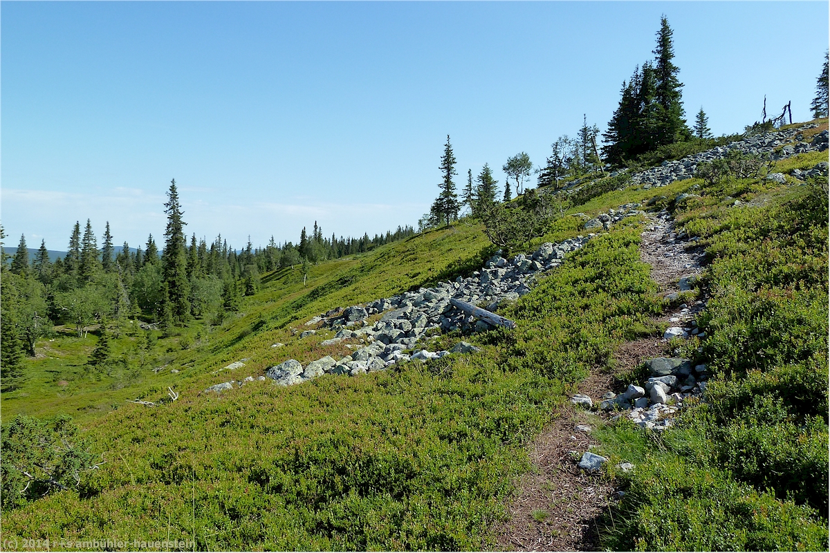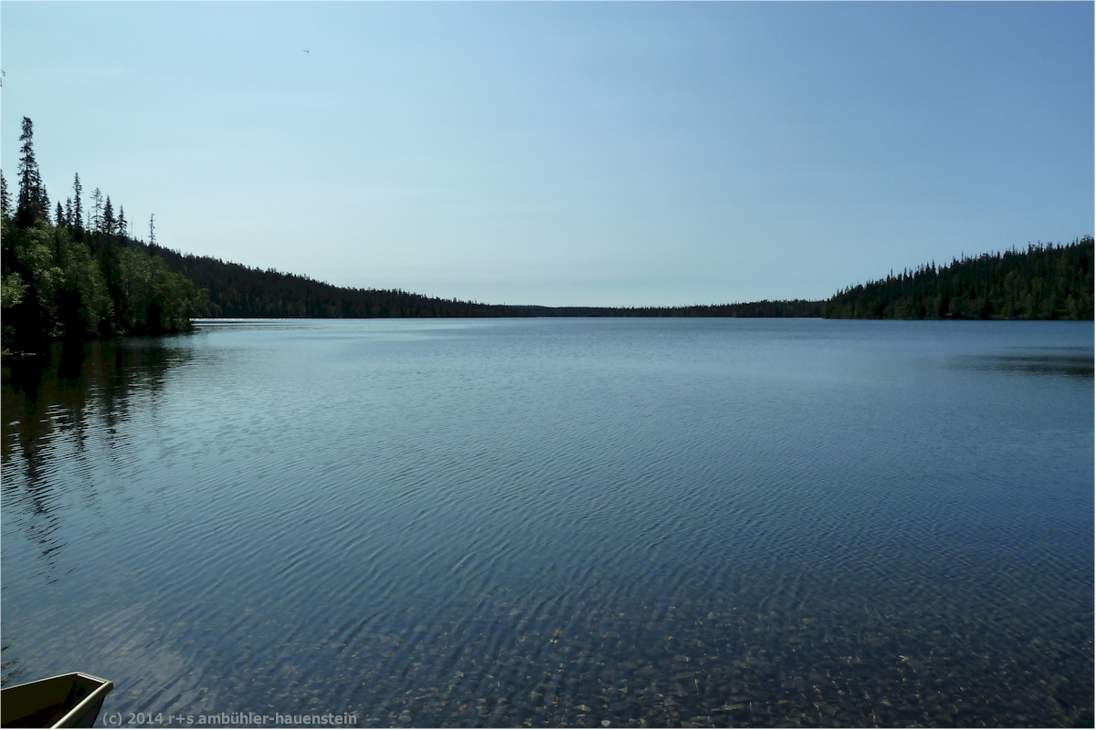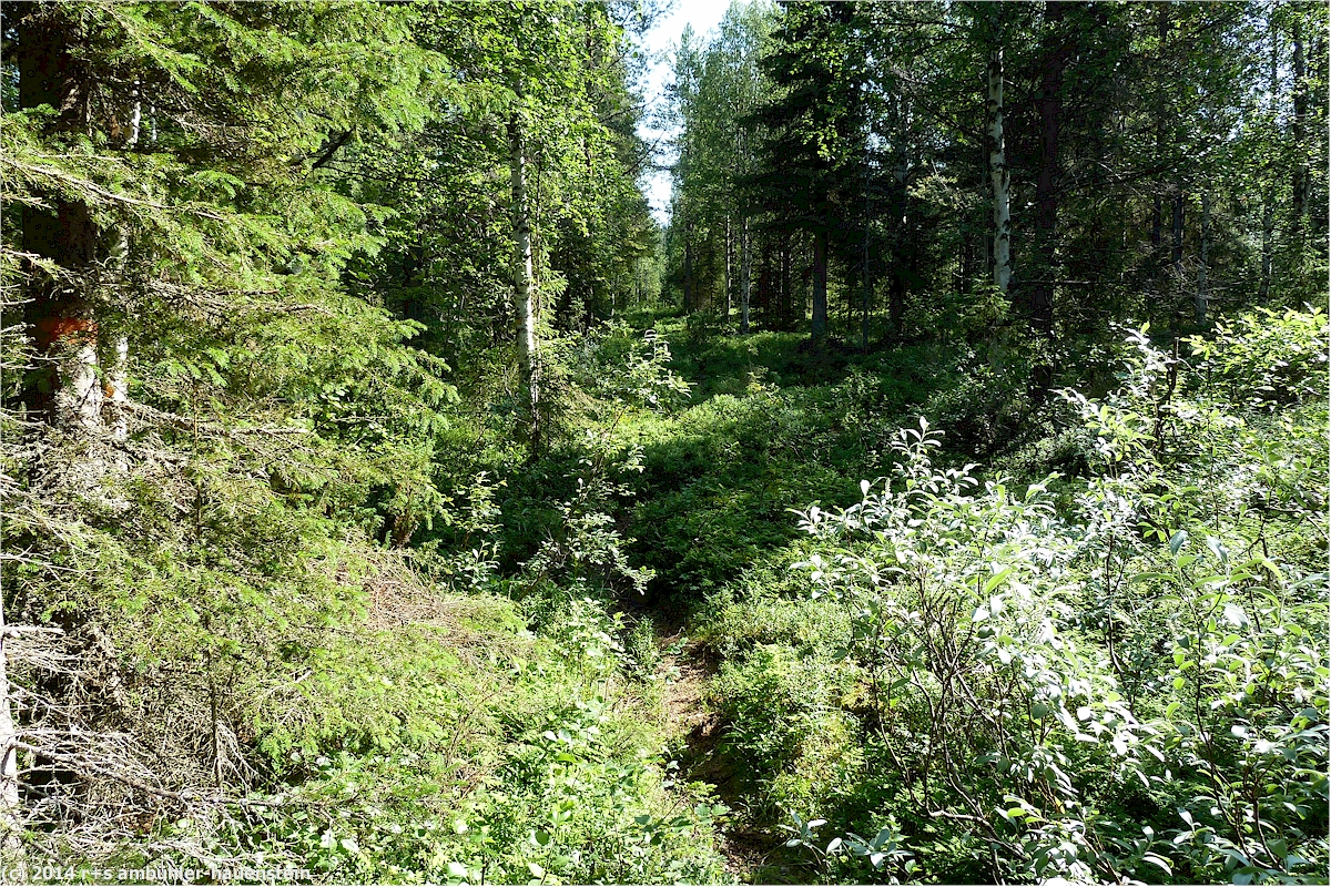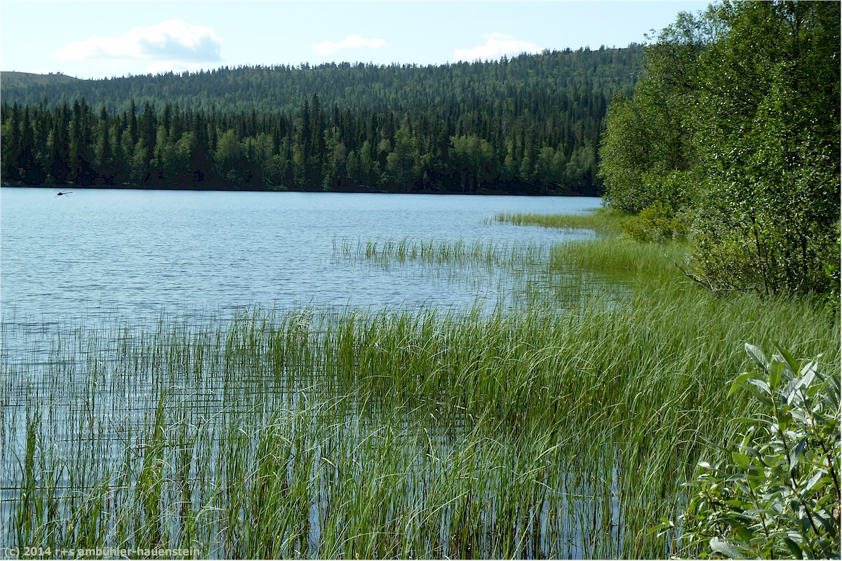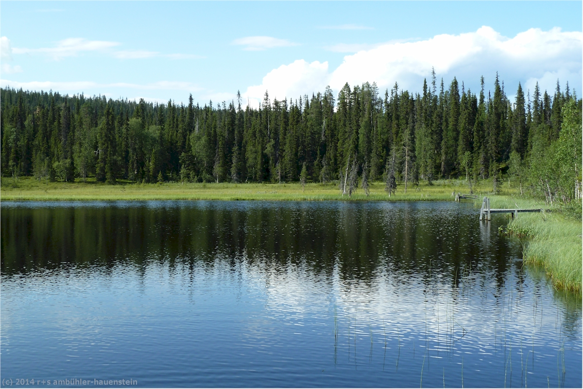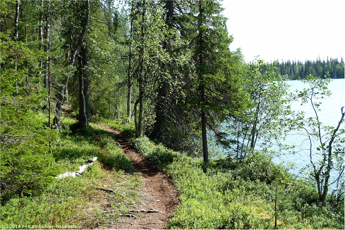 wir schultern den rucksack und gehen erst zum see hinunter. das wasser ist äusserst klar und hat eine angenehme temperatur. um 11:50 uhr starten wir zu unserer wanderung. auf den ersten meter geht es ganz gut, aber dann wird der boden etwas sumpfig und eine mückenschar stürzt sich auf uns. im laufen sprühen wir uns ein, das hätten wir tun sollen, bevor wir in den wald gingen ! mit grossen schritten durchqueren wir das feuchte waldstück, dann steigt der weg etwas an und der boden wird trockener. wir sprühen uns nochmals von kopf bis fuss ein, dann geht es weiter. noch einige male müssen wir über kleine bäche steigen und durch sumpfiges gelände gehen, aber das anti-brumm zeigt gute wirkung.
