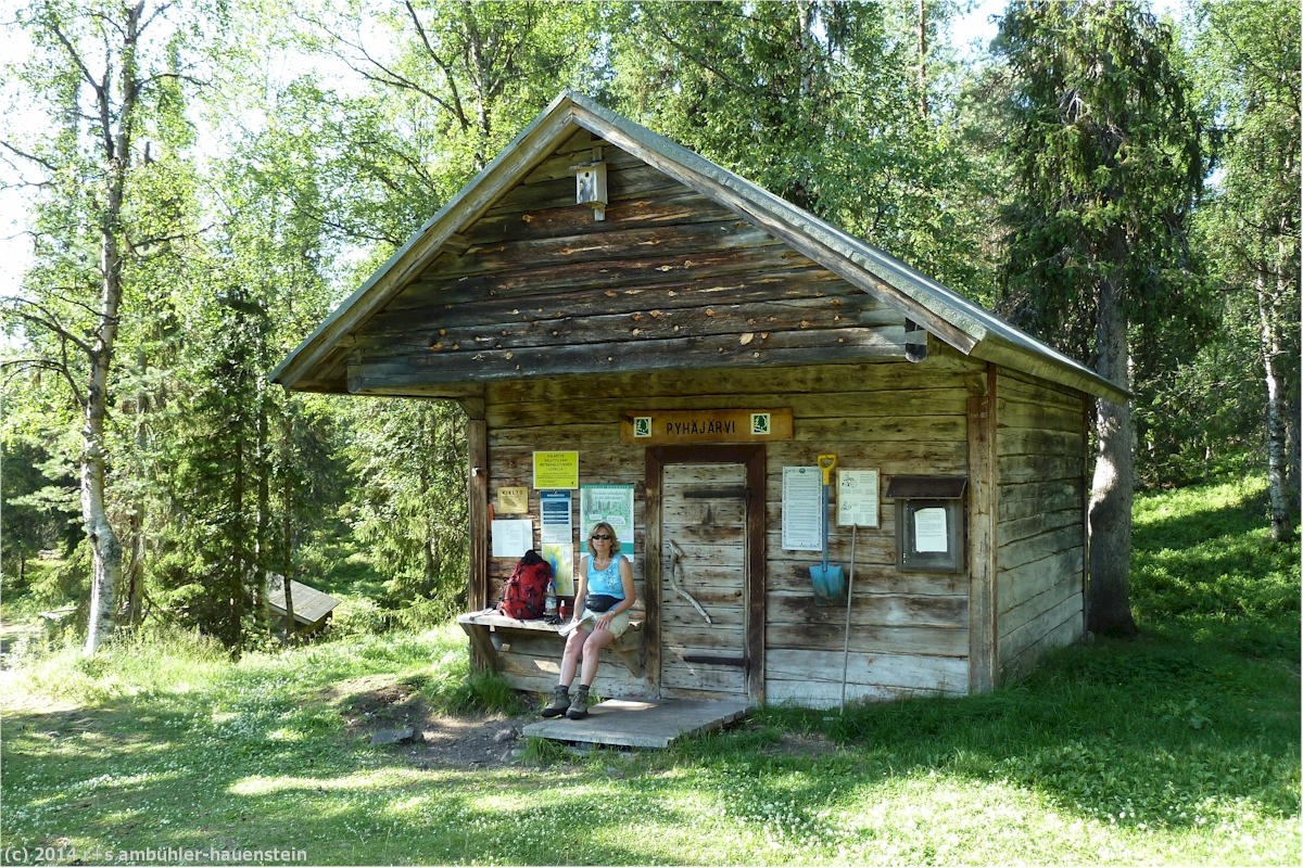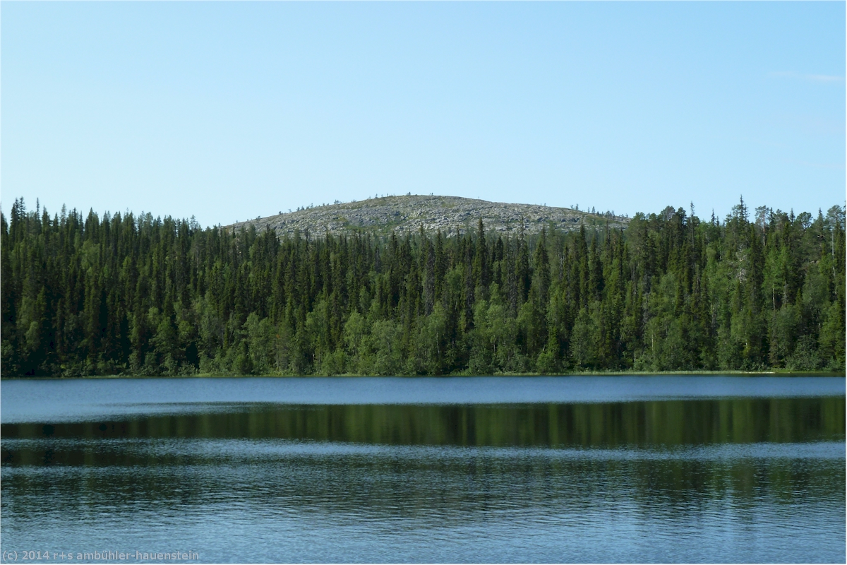 wir frühstücken bei wolkenlosem himmel, anschliessend fahren wir zum pyhäjärvi im nationalpark pallas-yllästunturin. auf der wanderung zum pallilaki gelangen wir schon bald über die waldgrenze. auf dem weg zum superflachen gipfel geniessen wir die fantastische aussicht auf lappland. auf dem rückweg wählen wir die route via die schutzhütte pyhäjärven autiotupa am südlichen ende des pyhäjärvi. wir folgen dem ufer zum ausgangspunkt, dort erfrischen wir uns mit einem bad im see. auf dem rückweg zum campingplatz machen wir einen abstecher zum pekanjärvi, das hotel ist jedoch geschlossen. auch heute schwitzen wir nach dem abendessen in der sauna.
