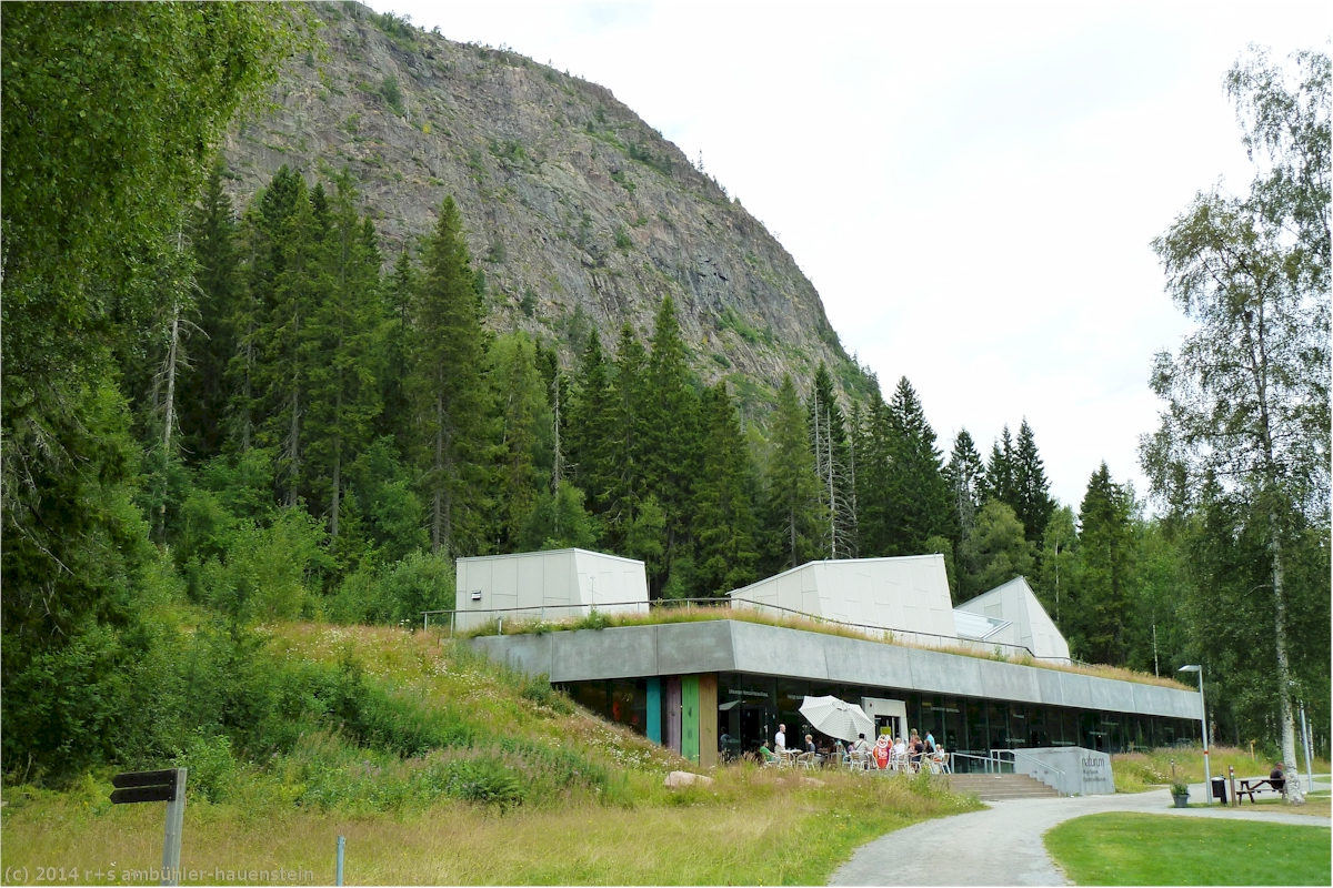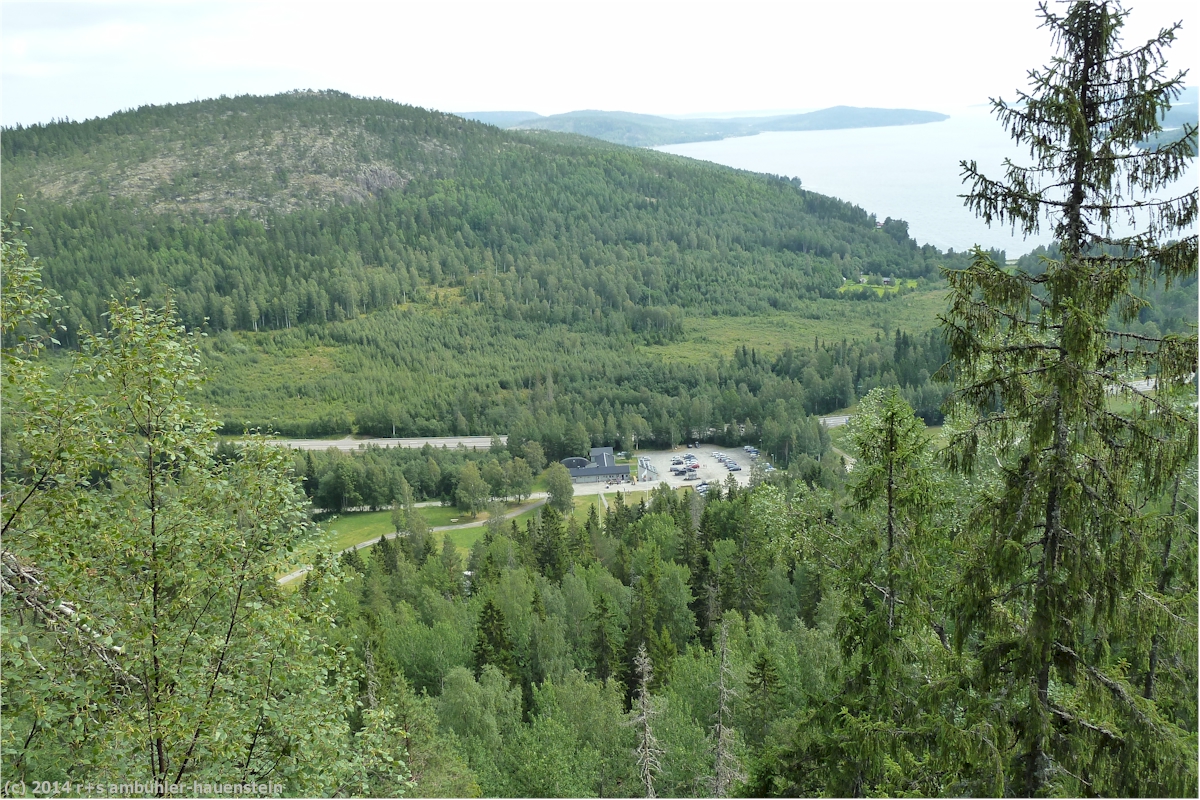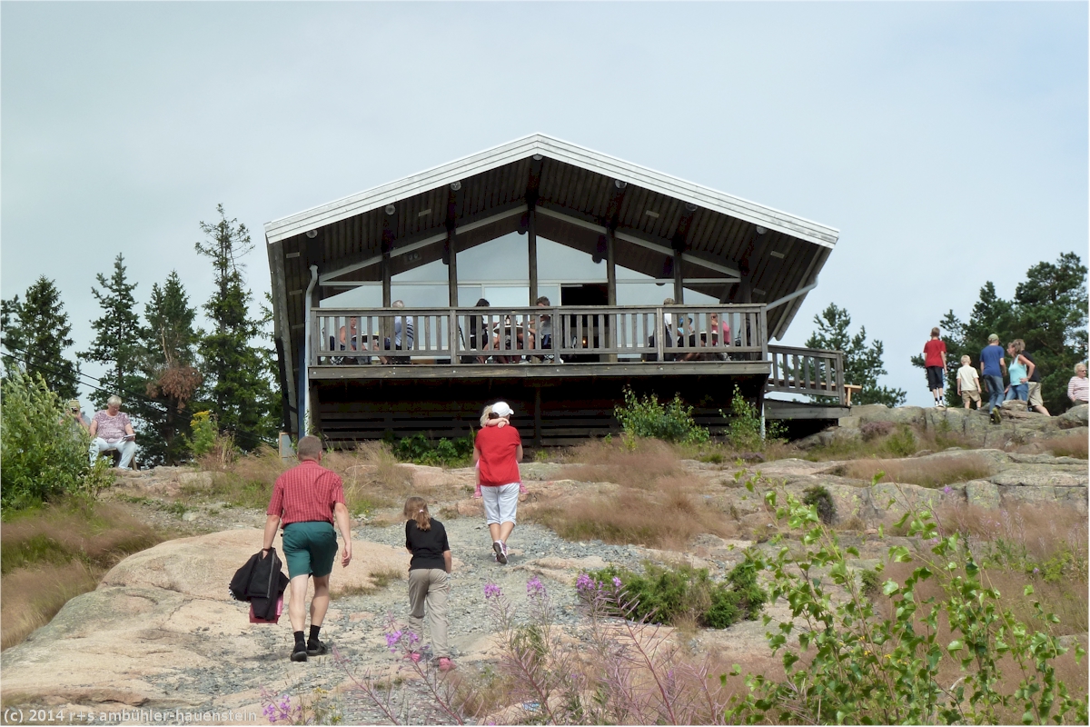 um 12:45 uhr sind wir beim naturum höga kusten, dieses besucherzentrum liegt zwar ausserhalb des nationalparks, ist aber dessen informationszentrum und ausgangspunkt unserer heutigen wanderung im skulebergets naturreservat. diese ist zwar sehr kurz - auf dem wegweiser steht 0.6 km - aber sie soll uns durch die teilweise fast senkrechte felswand zum gipfel des skuleberget führen. die distanz entspricht der direkten, horizontalen verbindung des ausgangspunktes mit dem ziel auf der karte und ist sehr wenig aussagekräftig, denn es kommen noch 260 höhenmeter dazu.