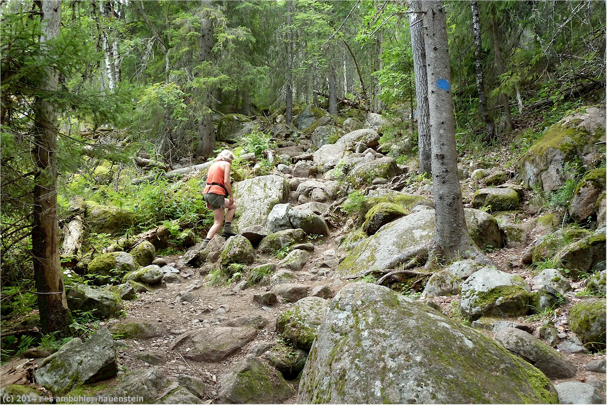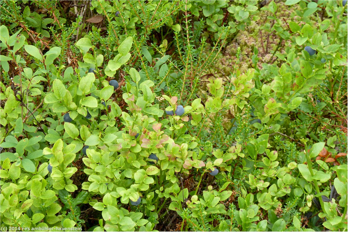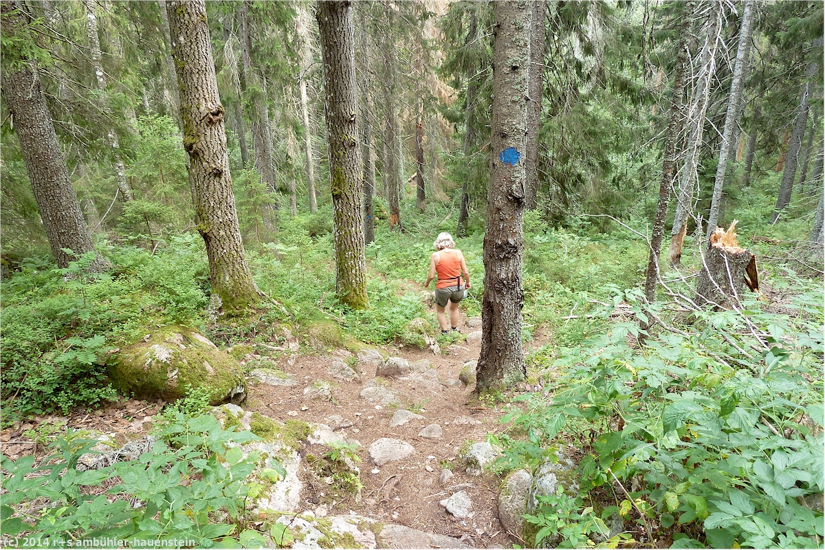 talwärts ist wie üblich mit farbigen punkten sehr gut markiert. unterwegs pflückt susanne eine kleine schale voll heidelbeeren. nach einer guten stunde sind wir wieder beim auto.