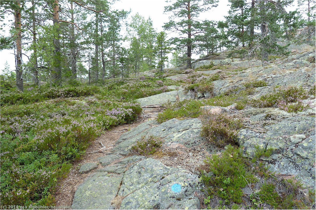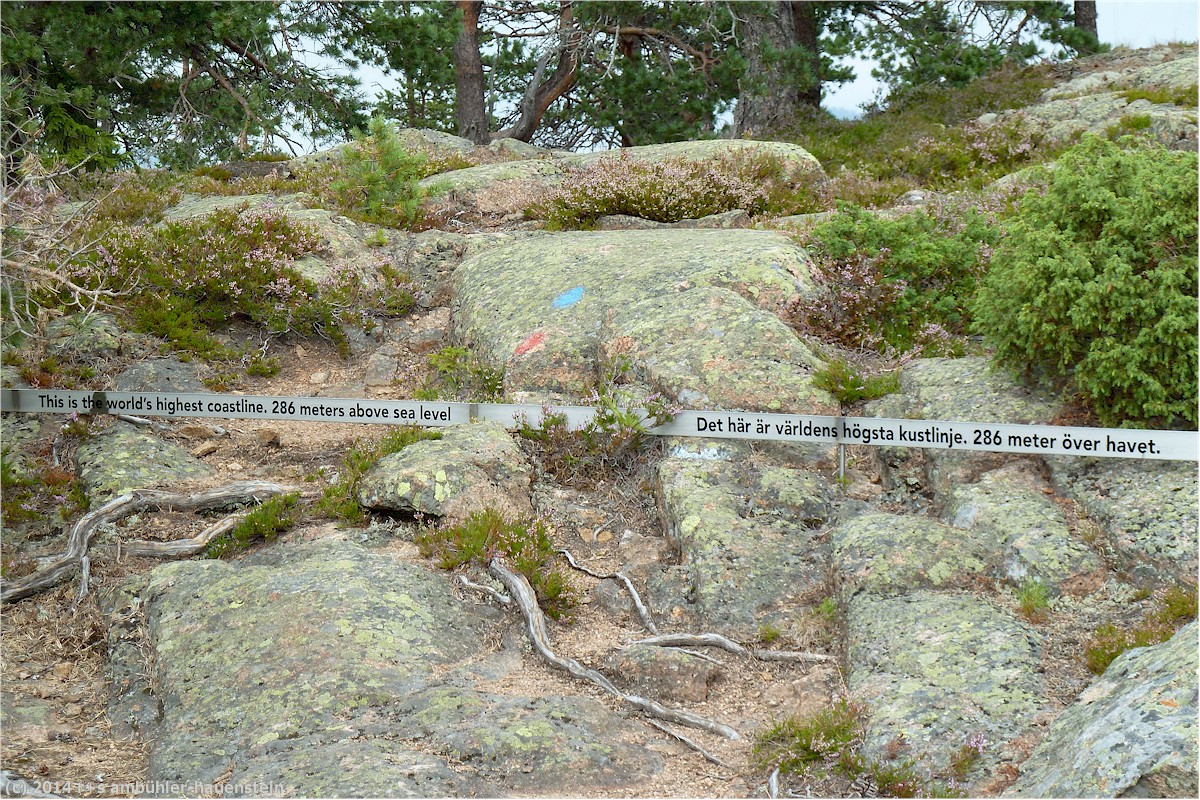 um 14:45 uhr brechen wir wieder auf. wir folgen erst ein stück dem rundweg um den gipfel, dann geht es auf einem "normalen" wanderweg talwärts. kurz nach dem abmarsch treffen wir auf ein metallenes band auf dem fels mit der aufschrift "dies ist die höchste küstenlinie der welt, 286 meter über meer". gemeint ist, dass sich diese höhenlinie einst auf meereshöhe befand. eine bis zu 4 km dicke eisschicht bedeckte einst diese region. als diese schmolz, wurde das land entlastet, es begann sich deshalb zu heben. so kam es, dass die höhenlinie, die sich einst auf meereshöhe befand, nun eben 286 meter über meer liegt. zur zeit hebt sich das land weiterhin um etwa 8 mm pro jahr. die wissenschaftler gehen allerdings davon aus, dass der meeresspiegel auf grund der klimaerwärmung etwa im gleichen mass steigen wird, so dass sich die küstenlinie wahrscheinlich nicht mehr stark verändern wird.