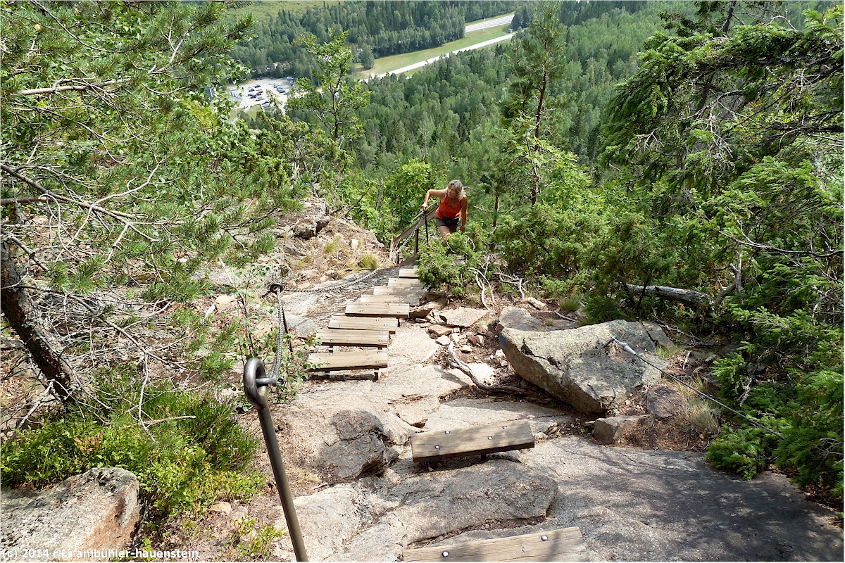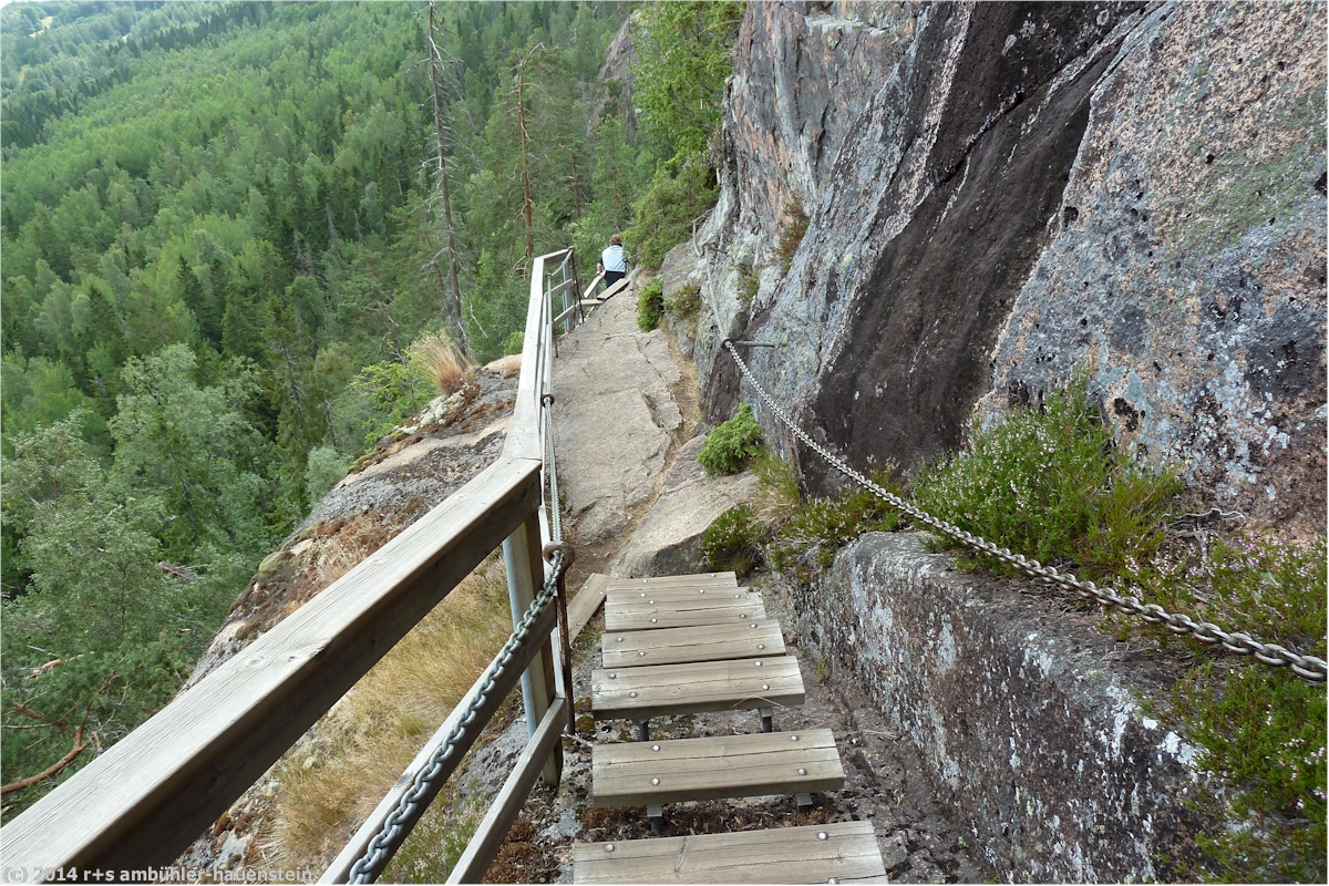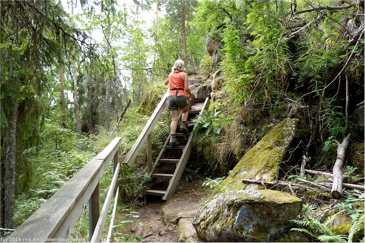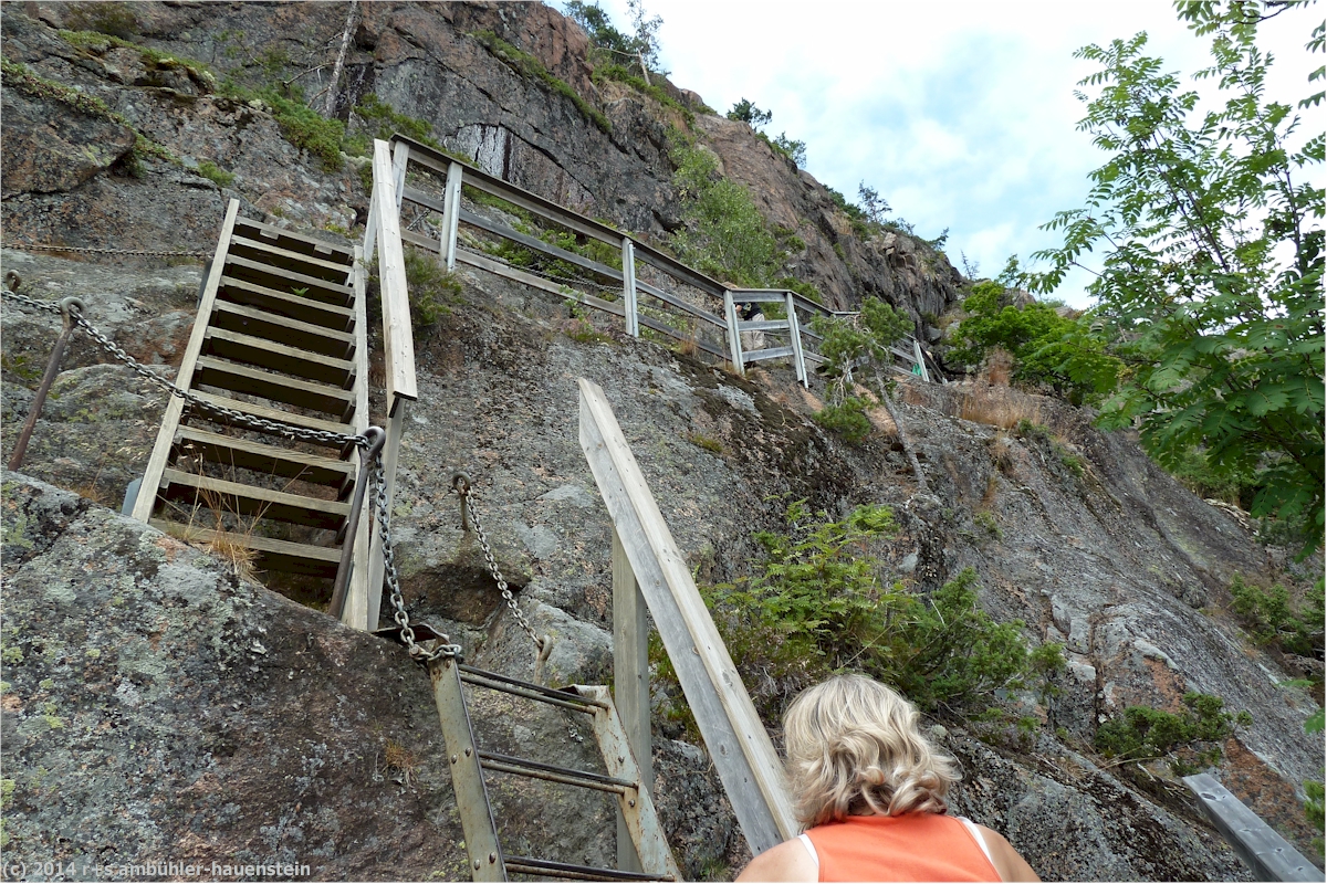 bei etwas kühlerem wetter als in den vergangenen tagen fahren wir nach mittag zum besucherzentrum naturum höga kusten. die wanderung zum gipfel des skuleberget ist zwar nur kurz, aber sehr spektakulär. treppen und leitern bringen uns durch die fast senkrechte felswand. wir geniessen das mittagessen auf dem gipfel, für den rückweg wählen wir den "normalen" wanderweg, der uns um die felswand herum führt. anschliessend fahren wir durch das UNO-weltkulturerbe höga kusten rund um den hauptort nordingrå. wir besuchen den ort bönhamn an der küste, dann fahren wir zurück zum campingplatz.