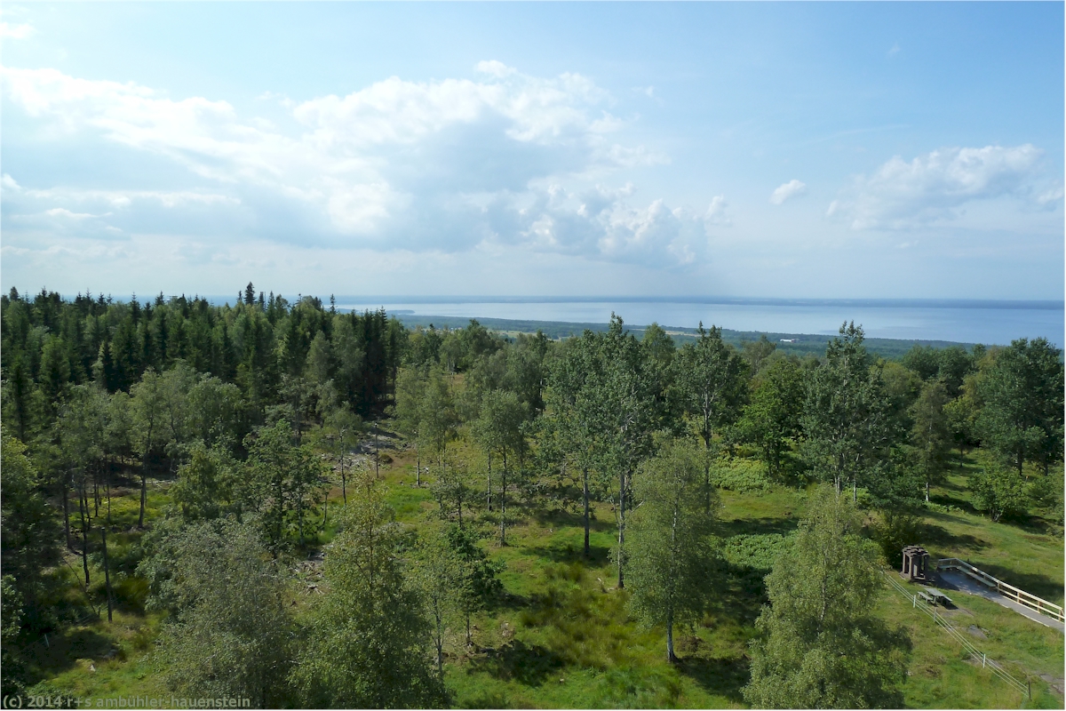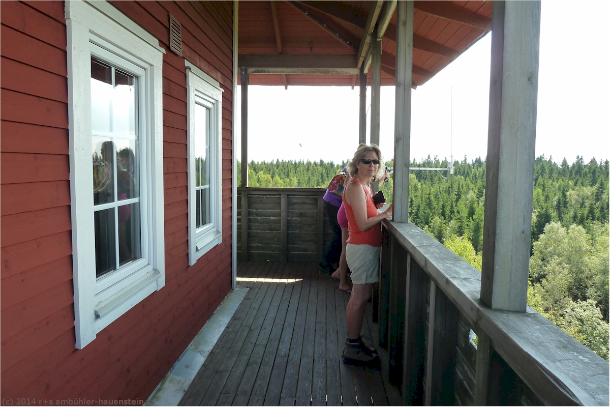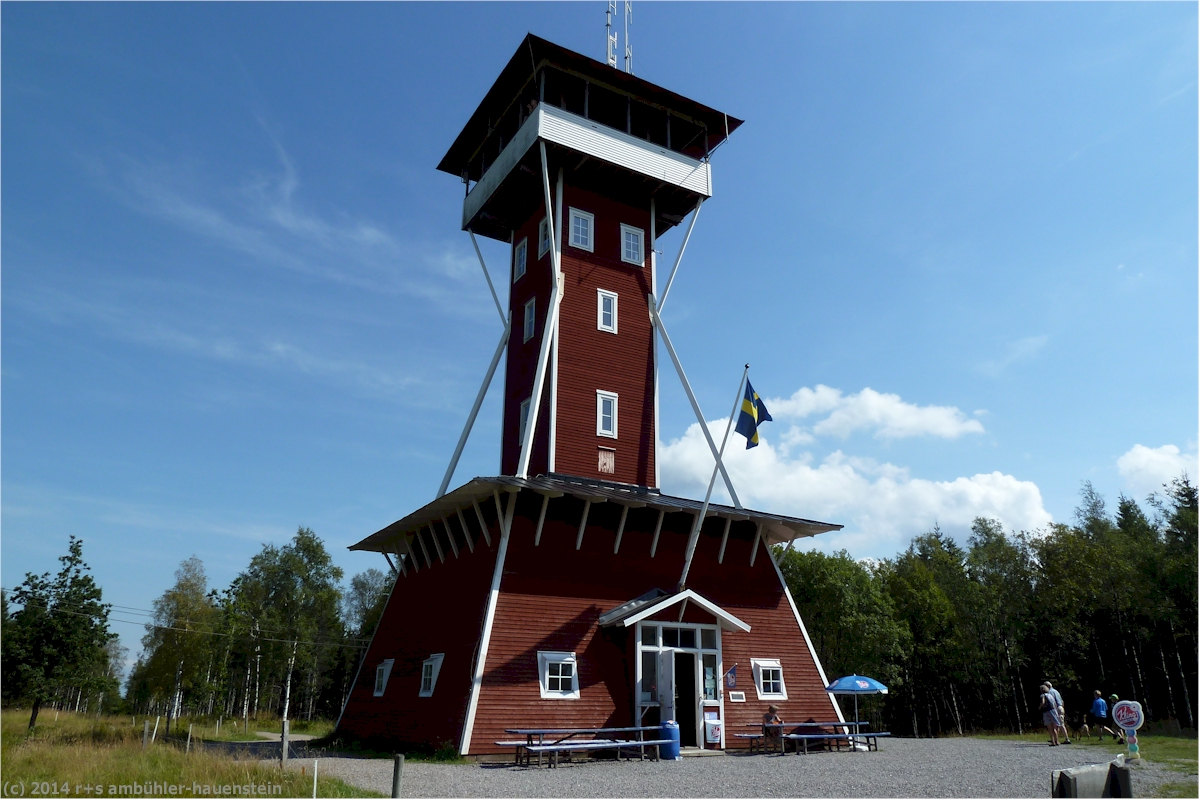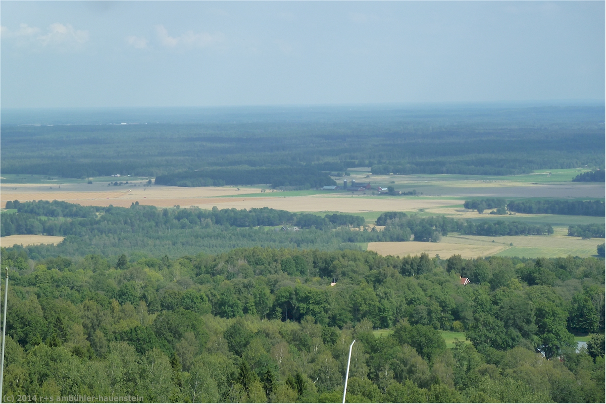 bald erreichen wir eine strasse und sind wenig später wieder auf dem offiziellen wanderweg. wir folgen diesem bergwärts. er führt aber nicht direkt zum ziel, sondern in weitem zickzack immer wieder an diesem vorbei. endlich erreichen wir einen pfad, der uns direkt zum turm bringt. dieser wird vom lokalen OL-verein bewirtschaftet. gerne bezahlen wir den eintritt und geniessen die aussicht von der plattform. im nordwesten erstreckt sich der riesige vänernsee, auf der gegenüberliegenden seite erkennen wir viel wald und einige bauernhöfe mit grossen feldern.