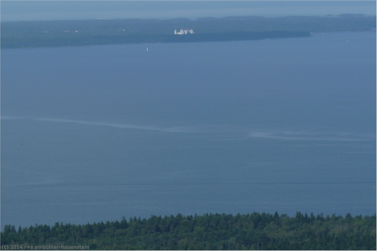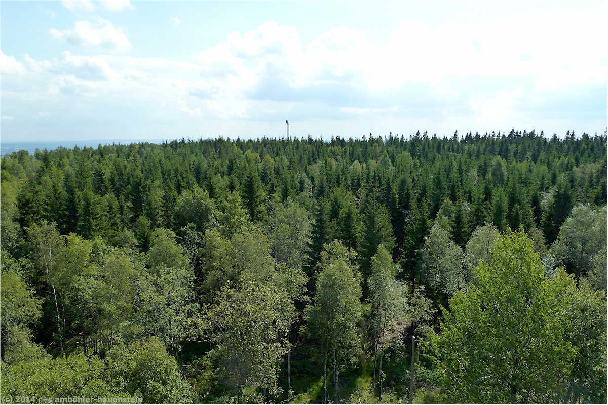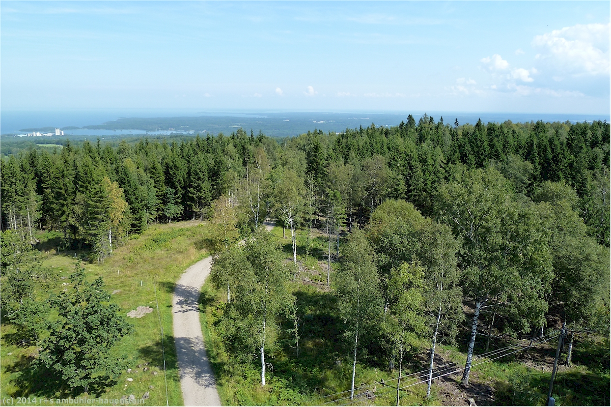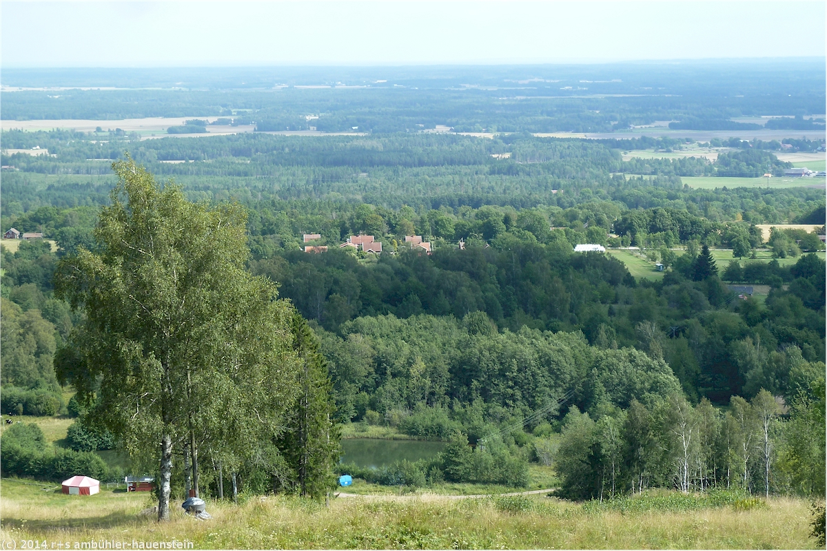 bald erreichen wir eine strasse und sind wenig später wieder auf dem offiziellen wanderweg. wir folgen diesem bergwärts. er führt aber nicht direkt zum ziel, sondern in weitem zickzack immer wieder an diesem vorbei. endlich erreichen wir einen pfad, der uns direkt zum turm bringt. dieser wird vom lokalen OL-verein bewirtschaftet. gerne bezahlen wir den eintritt und geniessen die aussicht von der plattform. im nordwesten erstreckt sich der riesige vänernsee, auf der gegenüberliegenden seite erkennen wir viel wald und einige bauernhöfe mit grossen feldern.